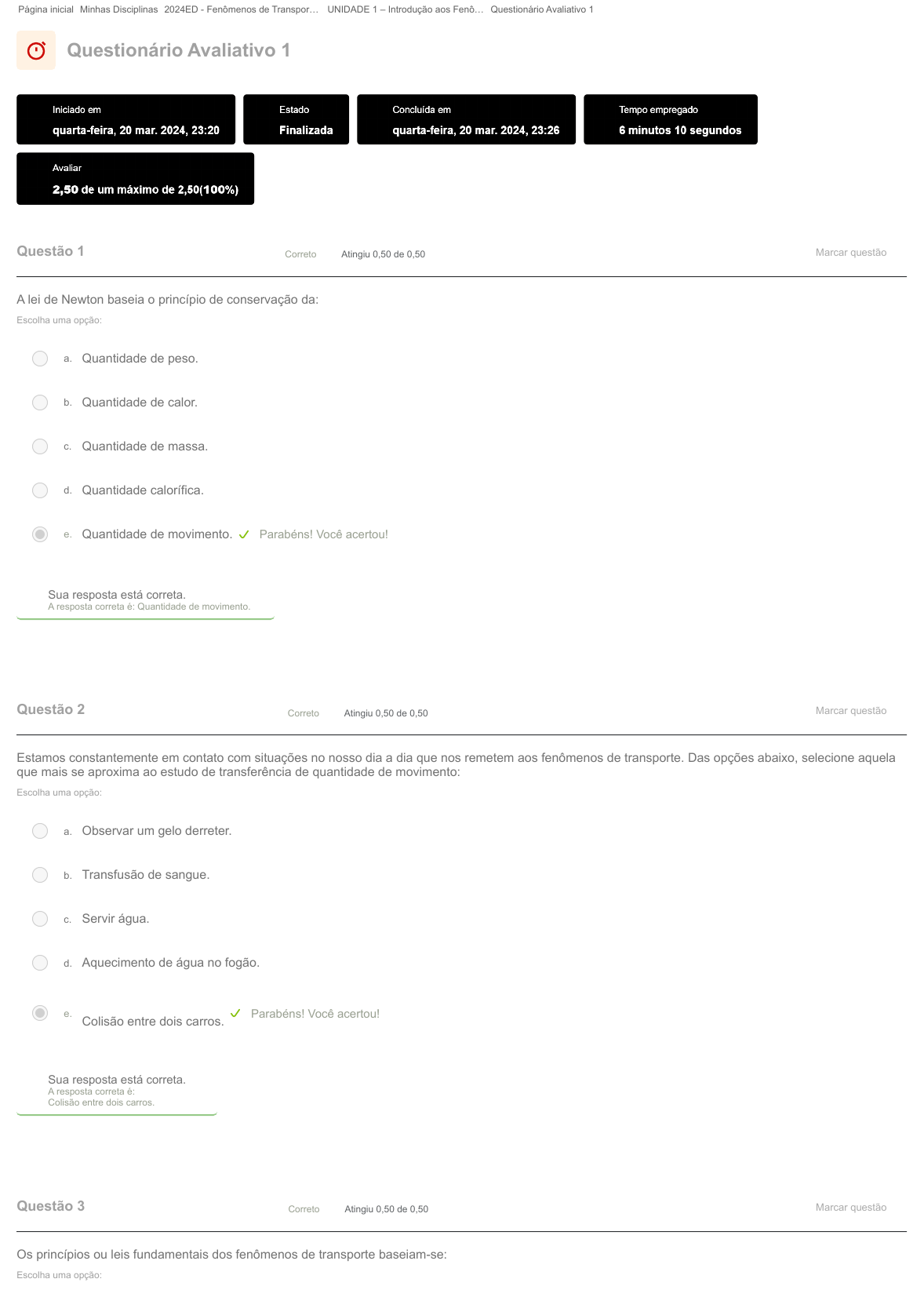 Questionário Avaliativo 1 Questão 1 Correto Atingiu 0,50 de 0,50 A lei de Newton baseia o princípio de conservação da: Escolha uma opção: a. Quantidade de peso. b. Quantidade de calor. c. Quantidade de massa. d. Quantidade calorífica. e. Quantidade de movimento. Parabéns! Você acertou! Sua resposta está correta. A resposta correta é: Quantidade de movimento. Marcar questão Questão 2 Correto Atingiu 0,50 de 0,50 Estamos constantemente em contato com situações no nosso dia a dia que nos remetem aos fenômenos de transporte. Das opções abaixo, selecione aquela que mais se aproxima ao estudo de transferência de quantidade de movimento: Escolha uma opção: a. Observar um gelo derreter. b. Transfusão de sangue. c. Servir água. d. Aquecimento de água no fogão. e. Colisão entre dois carros. Parabéns! Você acertou! Sua resposta está correta. A resposta correta é: Colisão entre dois carros. Marcar questão Questão 3 Correto Atingiu 0,50 de 0,50 Os princípios ou leis fundamentais dos fenômenos de transporte baseiam-se: Escolha uma opção: Marcar questão Página inicial Minhas Disciplinas 2024ED - Fenômenos de Transpor… UNIDADE 1 – Introdução aos Fenô… Questionário Avaliativo 1 https://ava.uniftec.com.br/ https://ava.uniftec.com.br/my/courses.php https://ava.uniftec.com.br/course/view.php?id=8932 https://ava.uniftec.com.br/course/view.php?id=8932§ion=2 https://ava.uniftec.com.br/mod/quiz/view.php?id=490227 a. Nos princípios da proporção em peso. b. Nos princípios de Newton. c. Nas leis da termodinâmica. d. Nos princípios de conservação. Parabéns! Você acertou! e. Nos princípios constitucionais. Sua resposta está correta. A resposta correta é: Nos princípios de conservação. Questão 4 Correto Atingiu 0,50 de 0,50 O princípio da conservação de energia é uma generalização da: Escolha uma opção: a. Segunda lei da termodinâmica. b. Lei da conservação de massa e energia. c. Lei da gravidade. d. Lei de Newton. e. Primeira lei da termodinâmica. Parabéns! Você acertou! Sua resposta está correta. A resposta correta é: Primeira lei da termodinâmica. Marcar questão Questão 5 Correto Atingiu 0,50 de 0,50 Como você descreveria, resumidamente, o balanço de conservação? Escolha uma opção: a. Perda = entra - sai + gerado. b. Acúmulo = entra - sai - gerado. c. Perda = entra - sai + acúmulo. d. Acúmulo = entra - sai + gerado. Parabéns! Você acertou! e. Acúmulo = entra + sai - gerado. Sua resposta está correta. A resposta correta é: Acúmulo = entra - sai + gerado. Marcar questão Terminar revisão Seguir para... https://ava.uniftec.com.br/mod/quiz/view.php?id=490227 https://ava.uniftec.com.br/mod/resource/view.php?id=490224&forceview=1 https://ava.uniftec.com.br/mod/page/view.php?id=490232&forceview=1 0800 603 0 603 Copyright © 2024 Ecoinove Holding Educacional. All right reserved. ftec.com.br https://www.ftec.com.br/ https://www.facebook.com/Uniftec https://www.linkedin.com/school/uniftec/ https://www.youtube.com/channel/UCrz2HdTD8ky5w5LDj08x37Q/featured https://www.instagram.com/uniftec_/