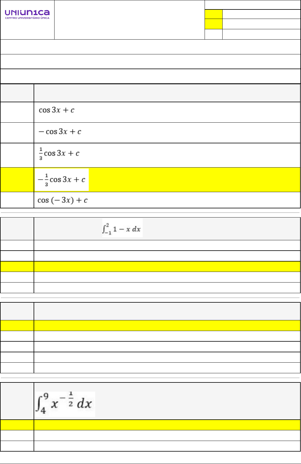 Pincel Atômico - 26/11/2024 12:27:08 1/2 WANDERSON COSTA TRINDADE Avaliação Online (SALA EAD) - Capitulos/Referencias 1,2,3 Atividade finalizada em 16/11/2024 00:52:31 (2867315 / 1) LEGENDA Resposta correta na questão # Resposta correta - Questão Anulada X Resposta selecionada pelo Aluno Disciplina: CÁLCULO II [989714] - Avaliação com 5 questões, com o peso total de 15,00 pontos [capítulos - 1,2,3] Turma: Graduação: ENGENHARIA MECÂNICA - Grupo: FEVEREIRO/2024 - EMEC/FEV24 [108381] Aluno(a): 91684967 - WANDERSON COSTA TRINDADE - Respondeu 5 questões corretas, obtendo um total de 15,00 pontos como nota [356432_70996] Questão 001 Ao calcular a integral ∫ sen 3x dx encontraremos a primitiva X [356432_70926] Questão 002 Calculando a integral em termos de áreas obtemos como resultado : 2/5 2/3 X 3/2 1 5/2 [356432_71032] Questão 003 A área compreendida entre a reta Υ= 2 e a curva Υ= x2 – 2 é X 32/3 25/3 31/3 23/3 29/3 [356433_70110] Questão 004 Por meio o Teorema Fundamental do Cálculo (parte 2) pode-se calcular o valor de . Desss forma, o valor encontrado é : X 2 4 3 Pincel Atômico - 26/11/2024 12:27:08 2/2 0 1 [356434_70216] Questão 005 Calculando a antiderivada de em encontraremos : 0 2 X -2 1 3