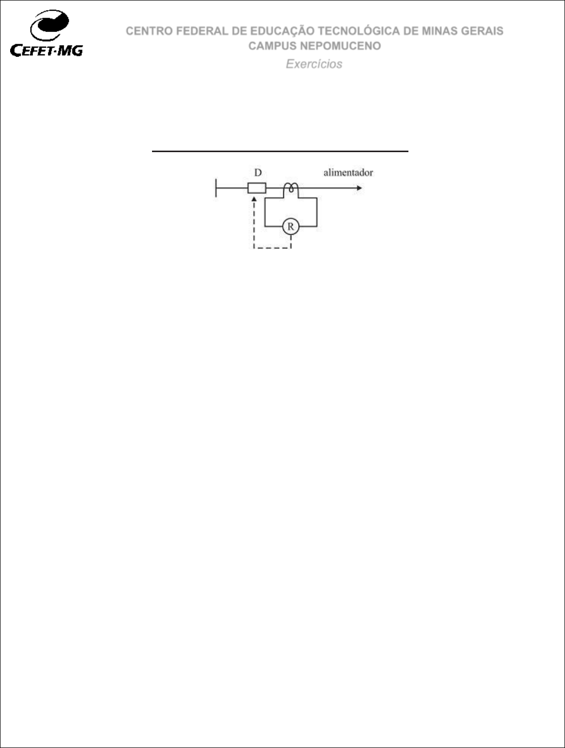 CENTRO FEDERAL DE EDUCAÇÃO TECNOLÓGICA DE MINAS GERAIS CAMPUS NEPOMUCENO Exercícios 1) A figura abaixo ilustra o diagrama unifilar referente à ligação de um transformador de corrente (TC) a um alimentador. Os terminais secundários do TC suprem o relé R, que está associado ao disjuntor D. O TC tem relação nominal de corrente 400:5 e fator térmico igual a 1,5. Com base nessas informações, julgue os itens a seguir e apresente os cálculos: a) Considere que o TC tenha fator de sobrecorrente igual a 20 e classe de exatidão igual a 10%. Nessa situação, se uma corrente de curto-circuito de 10 kA ocorrer no local onde o TC está instalado, o transformador operará com corrente no secundário cujo erro estará dentro de sua classe de exatidão. ( ) Certo ( ) Errado b) Em regime permanente, a máxima corrente que pode passar pelo alimentador sem comprometer o funcionamento do TC é superior a 450 A. ( ) Certo ( ) Errado 2) Considere uma proteção de sobrecorrente no primário de um transformador de 2.000 kVA – 13.800/380 V, onde se utiliza um transformador de corrente (TC) para alimentar o sistema de relés. A corrente no curto-circuito no primário do transformador é de 4.000 A. Qual a relação recomendada para o TC de proteção? 3) Considere a proteção de sobrecorrente no primário de um transformador de 7,5MVA, 13.800/380V, onde a alimentação do sistema de relés é feita por intermédio de um transformador de corrente. A corrente de curto-circuito simétrica, de valor efetivo, no primário do transformador é de 3,6kA. Qual é, em A, a corrente nominal primária do transformador de corrente, se for considerado um fator de sobrecorrente igual a 20? CEFET/MG Campus Nepomuceno – Exercícios 2 4) Uma subestação possui um transformador de 400√3 kVA com tensão primária na sua alimentação de 16kV. Dados: – Corrente primária dos TC’s disponíveis: 25A, 30A e 35A. – Corrente máxima no secundário dos TC’s: 5A. Assim, o transformador de corrente do relé de proteção deverá ter uma relação de: A) 2,5 por 1. B) 3,0 por 1. C) 4,5 por 1. D) 5,0 por 1. E) 6,0 por 1. 5) Sobre os transformadores de corrente (TCs), utilizados com a finalidade de medição e proteção em sistemas elétricos de potência, assinale a alternativa INCORRETA. a) Operam com tensão variável. b) Quando possuírem dois enrolamentos secundários, possuirão dois enrolamentos primários. c) A corrente nominal da bobina secundária é comumente encontrada no valor de 5 A. d) O TC do tipo janela é aquele que não possui um primário fixo no transformador e é constituído de uma abertura através do núcleo, por onde passa o condutor que forma o circuito primário e) O TC do tipo barra é aquele cujo enrolamento primário é constituído por uma barra fixada através do núcleo do transformador. 6) Considerando-se que um transformador de corrente especificado com 125-5 A seja inserido em um barramento com 80 A, é correto afirmar que a corrente fornecida pelo secundário será superior a 3,0 A. ( ) Certo ( ) Errado CEFET/MG Campus Nepomuceno – Exercícios 3 7) Em uma subestação de energia elétrica de distribuição, o uso dos transformadores de corrente (TC) se destina a: a) inserir, no enrolamento primário, uma impedância em série, de forma a limitar a corrente elétrica a jusante do seu ponto de instalação, protegendo o ramal de distribuição contra correntes de sobrecarga e de curto-circuito. b) reproduzir, no enrolamento secundário, de forma isolada e em uma proporção definida e conhecida, a corrente do enrolamento primário, para sua utilização por equipamentos de medição e controle da subestação. c) transmitir, no enrolamento secundário, a energia do enrolamento primário, para suprimento às cargas de baixa tensão do ramal de distribuição, mantendo a potência de transmissão. d) retificar, no enrolamento secundário, a corrente alternada do enrolamento primário, para suprimento dos circuitos auxiliares da subestação, alimentando os sistemas de acionamento das seccionadoras da subestação. e) conduzir, no enrolamento secundário, as correntes de surto atmosférico do enrolamento primário, de forma a propiciar um caminho de baixa impedância para essas correntes à malha de terra da subestação. 8) Em relação ao transformador de corrente (TC) para serviço de proteção, é INCORRETO afirmar que: a) o fator de sobrecorrente nominal indica a relação entre a máxima corrente para a qual o TC mantém sua classe de exatidão e sua corrente nominal. b) o fator térmico nominal é o número pelo qual a corrente primária nominal de um TC deve ser multiplicada, de forma a se obter a corrente primária máxima que pode ser conduzida continuamente por este TC, sob frequência nominal e com a maior carga especificada, sem exceder os limites de elevação de temperatura, a partir de uma temperatura ambiente especificada. c) a classe de exatidão exprime nominalmente o erro esperado do transformador de corrente, levando-se em conta a diferença de amplitude entre as correntes primária e secundária, considerando-se a relação de transformação. d) a tensão nos terminais secundários do transformador de corrente está limitada pela saturação do núcleo. 9) Sobre transformadores de corrente, está correto dizer que: a) a corrente primária não depende da corrente secundária b) a corrente secundária é proporcional à tensão primária c) a tensão secundária é proporcional à tensão primária d) a corrente secundária não depende da corrente primária CEFET/MG Campus Nepomuceno – Exercícios 4 10) A figura a seguir mostra um modelo de TC com barra incorporada. Considerando a relação de transformação, onde a corrente no primário é de 800 A e com uma relação de espiras de 1/160, a corrente no secundário corresponde a: a) 0,2 A b) 0,5 mA c) 5 A d) 16 A 11) Considere o diagrama sob análise abaixo e responda: a) Qual a quantidade de zonas p