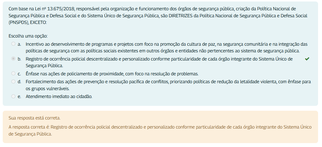 Com base na Lei n° 13.675/2018, responsável pela organização e funcionamento dos órgãos de segurança pública, criação da Política Nacional de Segurança Pública e Defesa Social e do Sistema Único de Segurança Pública são DIRETRIZES da Política Nacional de Segurança Pública e Defesa Social (PNSPDS), EXCETO: Escolha uma opção: a. Incentivo ao desenvolvimento de programas e projetos com foco na promoção da cultura de paz, na segurança comunitária e na integração das políticas de segurança com as políticas sociais existentes em outros órgãos e entidades não pertencentes ao sistema de segurança pública. b. Registro de ocorrência policial descentralizado e personalizado conforme particularidade de cada órgão integrante do Sistema Único de Segurança Pública. Ênfase nas ações de policiamento de proximidade, com foco na resolução de problemas. d. Fortalecimento das ações de prevenção e resolução pacífica de conflitos, priorizando políticas de redução da letalidade violenta, com ênfase para os grupos e. Atendimento imediato ao cidadão. Sua resposta está correta. A resposta correta é: Registro de ocorrência policial descentralizado e personalizado conforme particularidade de cada órgão integrante do Sistema Único de Segurança