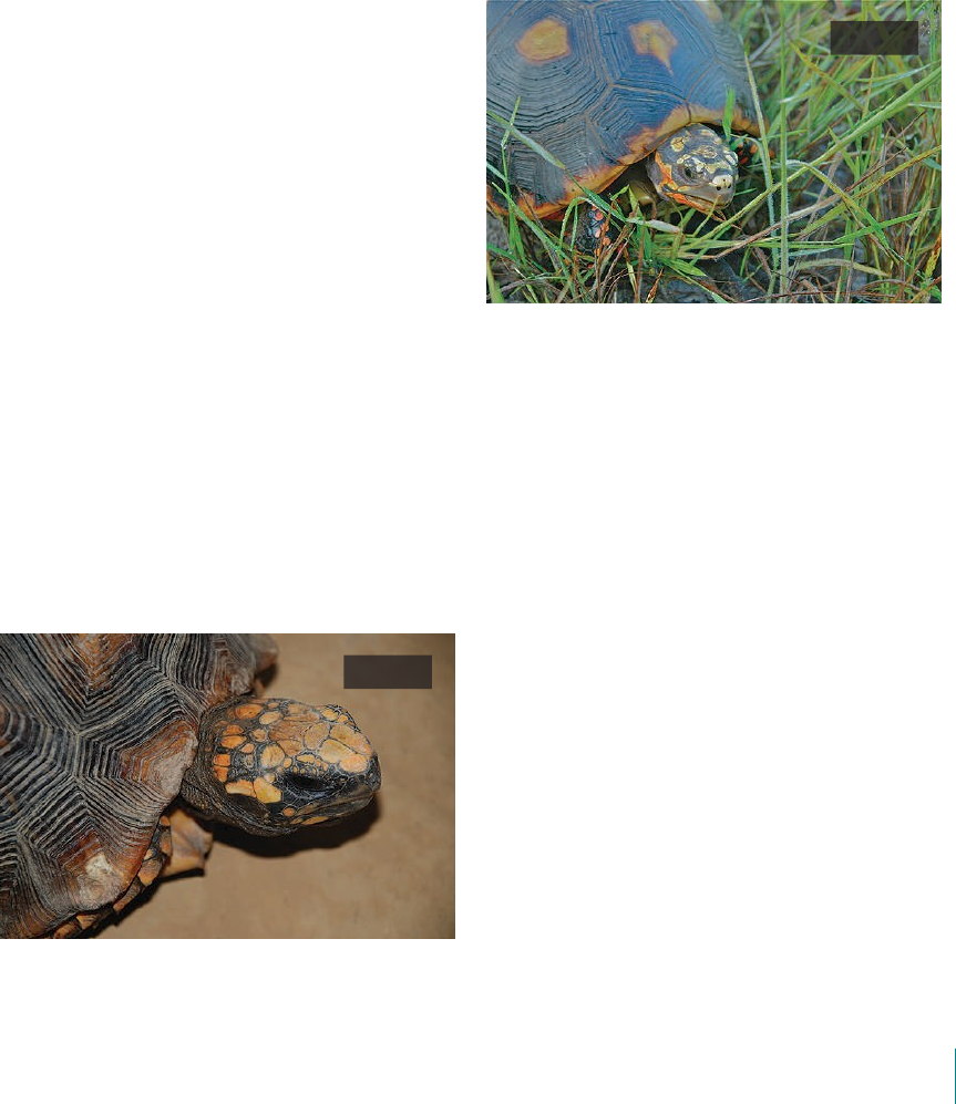 1FA – Cabeça com manchas avermelhadas, que desaparecem nas fê- 1A - Pescoço é recolhido verticalmente para dentro do casco; 11 ou 12 escudos no plastrão 2 1B - Pescoço é recolhido horizontalmente para dentro do casco (do- brando de lado); 13 escudos no plastrão 5 2A - Patas cilíndricas, semelhantes a patas de elefantes, com dedos indistintos; carapaça abaulada e com um único escudo supracaudal; espécies terrestres ................................................ Testudinidae (3) 2B - Patas espalmadas, com dedos distintos e com membrana in- terdigital pouco ou muito desenvolvida; espécies aquáticas e se- miaquáticas 4 3A - Carapaça de coloração es- cura, com área central de cada escudo amarelada e bem defi- nida, com anéis de crescimen- to bem visíveis; sutura umeral igual ou menor que a femoral; contato entre os escudos ingui-Figura 1 nal e femoral (ponte) bem evidente; uma escama frontal; escama nasal de tamanho grande quando comparado às escamas pré-fron- tais (Figura 1) .....................Figura 2 Chelonoidis carbonarius 3B - Carapaça marrom, com re- gião mais clara no centro de cada escudo, porém pouco delimita- da, com anéis de crescimento ausentes ou pouco nítidos; su- tura umeral maior que a femo- ral; contato entre os escudos inguinal e femoral (ponte) pouco evi- dente; escama frontal subdividida em muitas partes; escama nasal com formato triangular pequena quando comparado às escamas pré- frontais (Figura 2) ................................. Chelonoidis denticulatus 24 Quelônios Amazônicos: Guia de identificação e distribuição 25 Quelônios Amazônicos: Guia de identificação e distribuição posterior do plastrão articulados e móveis (Figura 3); fenda anal pou- co evidente; carapaça alta com 3 quilhas longitudinais (Figura 4), 3 ou 4 pares de barbelos ......... Kinosternon scorpioides (Kinosternidae) Figura 3 Figura 4 4B - Plastrão com 12 escudos, sem lobos móveis e articula- dos, escudos inguinais e axi- lares pequenos (os inguinais podem desaparecer nas fême- as adultas); escudos peitorais e abdominais do plastrão em contato com os escudos margi- nais de 4 a 7 sobre a ponte (Figura 5); listra na região das têmpo- ras de coloração laranja-avermelhada se estendendo pelo dorso da cabeça até a nuca …. Rhinoclemmys punctularia (Geoemydidae)Figura 5 5A - Carapaça com escudo nucal (Figura 6); primeiro escudo ver- tebral de grande tamanho; cabeça coberta por pele ou pequenas escamas ................................................................ Chelidae (6) 5B - Carapaça sem escudo nucal (Figura 7); escudos vertebrais de tamanho similar; cabeça com escamas em pouco número e de gran- de tamanho Podocnemididae (14) Figura 6 Figura 7 5A - Cabeça grande e achatada e de formato triangular; narinas na 4A - Plastrão com 11 escudos, 5 pares e um ímpar; lobos anterior e posição final de um longo tubo; pescoço com inúmeros apêndices epidérmicos (Figura 8); escudo intergular não separa completamente dos escudos gulares (Figura 9) ........................... Chelus fimbriata 5B - A cabeça não é triangular; narinas curtas; pescoço sem apên- dices epidérmicos; escudo intergular separa completamente os es- cudos gulares F Figura 8 Figura 9 FA - Carapaça bem achatada, com um sulco pronunciado sobre os escudos vertebrais; região dorsal da cabeça coberto por pele de tex- tura lisa e com coloração amarelo-alaranjado (Figura 10) ............. ................................................................. Platemys platycephala FB - Carapaça pouco achatada, sem sulco nos escudos verte- brais, porém com quilha longitudinal; dorso da cabeça coberto por pele de textura rugosa 8 Figura 10 26 Quelônios Amazônicos: Guia de identificação e distribuição 27 Quelônios Amazônicos: Guia de identificação e distribuição separando uma região dorsal escura de uma região ventral clara, com várias faixas e manchas pretas; possui barbelos compridos e dorso da cabeça plano D 8B - Ausência de faixa preta estendendo-se das narinas até a base do pescoço, separando uma região dorsal escura de uma região ventral clara, com várias faixas e manchas pretas; possui barbelos curtos e dorso da cabeça arredondado 10 DA - Plastrão com manchas delgadas pouco evidentes; dorso da cabe- ça bastante ornamentado com listras e região do pescoço bastante gra- nulosa, com muitos tubérculos (Figura 11) Phrynops geoffroanus DB - Plastrão com manchas largas e negras, bem evidentes; dor- so da cabeça com poucas listras e pescoço pouco granulo- so (Figura 12) ............................................. Phrynops tuberosus Figura 11 Figura 12 10A - Cabeça, pescoço e extremidades dos mem- bros com pigmentação avermelhada forte; uma linha lateral negra se esten- de das narinas até a borda anterior do pescoço (Figura 13) ..................................Figura 13 ............ Rhinemys rufipes 10B - Cabeça, pescoço e extremidades sem pigmentação averme- lhada 11 11A - Cabeça mais estreita (largura da cabeça na altura dos tímpanos 8A - Faixa preta estendendo-se das narinas até a base do pescoço, ≤ 20% do comprimento retilíneo do casco - Figura 14); plastrão de coloração uniformemente escura (Figura 15) .... Mesoclemmys gibba 11B - Cabeça larga (largura da cabeça na altura dos tímpanos > 20% do comprimento retilíneo do casco); o plastrão é geralmente escuro na região central e amarelado nas bordas 12 Figura 14 Figura 15 12A - Escudo intergular mais estreito que os escudos gulares; es- cudo marginal 11 mais largo que o escudo marginal 12; a ca- beça apresenta listras laterais amarelo-brilhante, que se esten- dem desde as narinas até a região posterior da cabeça (Figura 16 e Figura 17) ................................... Mesoclemmys heliostemma 12B - Escudo intergular igual ou mais larga que os escudos gula- res; escudos marginais 11 e 12 de largura semelhante, cabeça de coloração uniformemente escura 13 