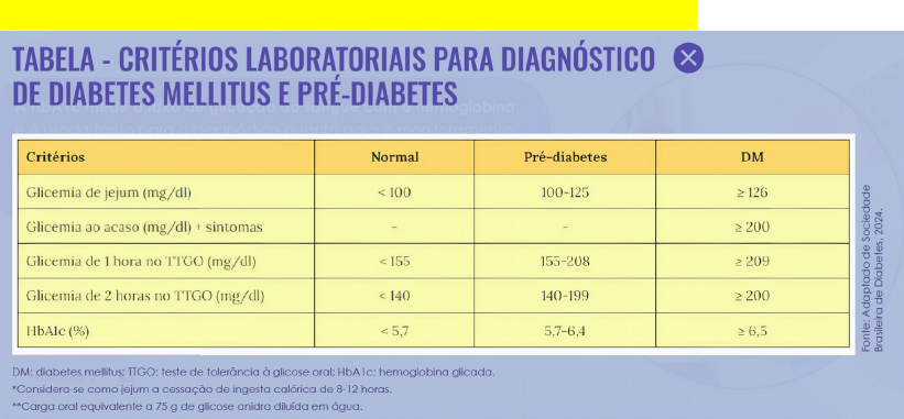 Calssificação e nível de evidencia do Consenso: Classe IB Diabetes Mellitus · Crônica multifatorial e metabólica. · Níveis elevados de glicose no sangue · Desencadeada por fatores genéticos e ambientais. · É uma doença cardiovascular pois causa danos ao coração, vasculatura, olhos, rins e nervos. · Brasil é o 6º no mundo em DM e o maior na América Latina (15,8 Milhões e projeção de 2,3 milhões em 2025) · Prevalente em mulheres acima de 65 anos · 50% desconhece o diagnóstico · 2/3 morrem por DCV · Etipatologenia: DM1, DM2, DMG e outros, causados por defeitos genéticos, drogas ou infecções. · Sinais clássicos aumento do volume urinário, sede excessiva, fome exagerada, perda de peso e desidratação · Outros sintomas são visão turva, cansaço, infecções recorrentes, má cicatrização de feridas, Albuminuria transitória (DM1 c/ menos de 5 anos do diagnóstico). DIAGNÓSTICO · Geralmente assintomático nos estágios iniciais, principalmente na DM2; · Exames laboratoriais, · glicemia em jejum 8 horas · hemoglobina glicada (HbA1c) – Mede a taxa de glicação do sangue com a hemoglobina é usada tanto para o diagnóstico quanto para o monitoramento. Hemácias tem 120 dias de vida, e o exame reflete os níveis nos últimos 3 a 4 meses. · Teste de tolerância a glicose oral (TTGO), mede a glicemia após sobrecarga de 75g de glicose, realizado após 1 ou 2h da ingestão. (glicemia pós-prandial) padrão ouro · Se apenas 1 exame der alterado, solicitar nova coleta para confirmação. · Pré diabetes, glicose, HbA1c e TTGO acima do normal, mas abaixo dos critérios para prédiabetes, sendo considerado de alto risco para DM2 · A insulina também pode ser medida embora sua meia vida seja curta e limite a utilização. · Teste de Autoanticorpos ICA, IAA, anti-IA2 e anti-GAD podem ser solicitado para verificar processo auto-imune, mas não deve ser solicitado se já estiver em tratamento. · Peptídio C avalia a função hepática e refle a função endógena da insulina. Resultados abaixo de 0,6ng/mL após 5 anos de diagnóstico indicam DM1, valores superiores sugerem DM2. · Em suspeita de DM1 o tratamento com insulina deve ser iniciado imediatamente. · 25% dos pré-diabéticos evoluem para a DM2 / 50% permanecem e 25% conseguem reverter – Entra o trabalho do nutri · DM2 é 90% dos casos. · Resistencia a insulina dificuldade dos tecidos sensíveis a insulina responder a ela, principalmente musculo e tecido adiposo. · DM2 pode apresentar alterações nas incretinas GLP-1 e GIP (hormônios produzidos no intestinos que estimulam a secreção de insulina) · HOMA-IR : Avalia a resistência à insulina por meio de fórmula. Células alvos da insulina Tecido adiposo e músculo · Na Resistencia a insulina o GLUT-4 não vai para a membrana · Insulina é anabólico e hipoglicemiante Estimula a glicogênese (produção de glicose no fígado e músculo), glicose em excesso sofre de lipogênese. Estimula a síntese proteica pelo fígado e músculo. Estimula a lipase lipoproteica para armazenar TG nos adipócitos. FATORES DE RISCO · Sedentarismo · Sobrepeso ou obesidade (80 a 90% do DM2) · Má alimentação · envelhecimento DOENÇAS CARDIOVASCULARES Combinação de hiperglicemia crônica, resistência a insulina, dislipidemia e hipertensão, que contribuem para a aterosclerose, aumentam o risco de infarto agudo do miocárdio e AVC, que são as principais causas de mortalidade na DM2. Pré diabetes É possível reverter o quadro com mudanças no estilo de vida e melhora de hábitos alimentares image1.png image2.png image3.png image4.png