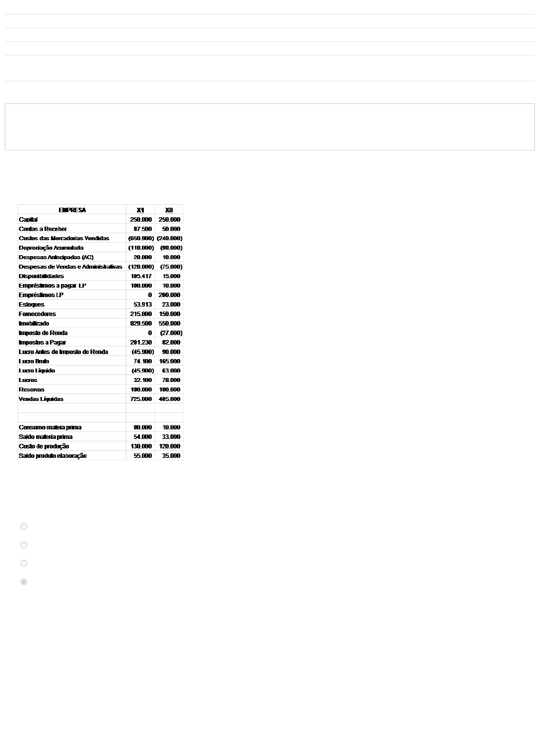 Iniciado em segunda-feira, 4 nov. 2024, 15:10 Estado Finalizada Concluída em segunda-feira, 4 nov. 2024, 15:13 Tempo empregado 2 minutos 45 segundos Avaliar 10,00 de um máximo de 10,00(100%) Questão 1 Correto Atingiu 1,00 de 1,00 Com base nos dados abaixo assinale a alternativa correta: O PME – prazo médio de estoque de X1 é: Escolha uma opção: 25 28 20 30 ✓ Sua resposta está correta. A resposta correta é: 30 Questão 2 Correto Atingiu 1,00 de 1,00 Questão 3 Correto Atingiu 1,00 de 1,00 Assinale abaixo a alternativa que melhor representa o conceito de fluxo de caixa: Escolha uma opção: o fluxo de caixa é um esquema, ou modelo, que representa as entradas e saídas de caixa. Costuma-se afirmar que em um fluxo de caixa, deve existir diversas entradas e diversas saída de caixa. o fluxo de caixa é um esquema, ou modelo, que representa todos os recebimentos e pagamentos ao longo do tempo. Costuma-se afirmar que em um fluxo de caixa, deve existir pelo menos um recebimento e pelo menos um pagamento ou vice-versa. o fluxo de caixa pode ser um esquema, ou modelo, que representa as principais entradas e saídas de caixa ao longo do tempo. Costuma-se afirmar que em um fluxo de caixa, deve existir pelo menos uma entrada e pelo menos uma saída de caixa ou vice-versa. o fluxo de caixa é um esquema, ou modelo, que representa todas as entradas e saídas de caixa ao longo do tempo. Costuma-se afirmar que em um fluxo de caixa, deve existir pelo menos uma entrada e pelo menos uma saída de caixa ou vice-versa. ✓ Sua resposta está correta. A resposta correta é: o fluxo de caixa é um esquema, ou modelo, que representa todas as entradas e saídas de caixa ao longo do tempo. Costuma-se afirmar que em um fluxo de caixa, deve existir pelo menos uma entrada e pelo menos uma saída de caixa ou vice-versa. O objetivo principal desta metodologia é reduzir o nível de investimentos em estoques, evitando a própria estocagem. O material é entregue diretamente na linha de montagem não passando nos armazéns. Estamos falando de qual metodologia? Escolha uma opção: MRP Ponto de Pedido LEC Just in Time ✓ Sua resposta está correta. A resposta correta é: Just in Time Questão 4 Correto Atingiu 1,00 de 1,00 Suponha que uma empresa tem $ 1 milhão por dia de recibos e uma média de sete dias de float de cobrança. Se o custo de oportunidade anual é de 8 %, então o custo anual do float de cobrança é de: Escolha uma opção: R$ 550.000 R$ 560.000 ✓ R$ 580.000 R$ 450.000 Sua resposta está correta. A resposta correta é: R$ 560.000 Questão 5 Correto Atingiu 1,00 de 1,00 Com base nos dados abaixo assinale a alternativa correta: O valor do capital circulante liquido de X1 é: Escolha uma opção: (R$ 149.400) ✓ R$ 149.400 R$ 152.400 (R$ 152.400) Sua resposta está correta. A resposta correta é: (R$ 149.400) Questão 6 Correto Atingiu 1,00 de 1,00 O motivo principal para uma empresa manter um saldo de caixa é sua própria operação. O saldo de caixa funciona essencialmente como um amortecedor entre os eventos de entrada e de saída uma vez que estes fluxos dificilmente ocorrerão no mesmo momento. Se houvesse um perfeito casamento de prazos entre as entradas e as saídas de caixa não haveria necessidade da manutenção de um saldo de caixa. Isso é uma característica da: Escolha uma opção: Precaução Fluxo de caixa Especulação Transação ✓ Sua resposta está correta. A resposta correta é: Transação Questão 7 Correto Atingiu 1,00 de 1,00 Com base nos dados abaixo assinale a alternativa correta: O PMR – prazo médio de recebimento de X1 é: Escolha uma opção: 43 ✓ 33 45 55 Sua resposta está correta. A resposta correta é: 43 Questão 8 Correto Atingiu 1,00 de 1,00 Questão 9 Correto Atingiu 1,00 de 1,00 Assinale abaixo a alternativa que melhor representa o conceito de capital de giro liquido: Escolha uma opção: Os passivos circulantes utilizados nas operações das empresas A soma entre as ativos circulantes e os passivos circulantes Os ativos circulantes utilizados nas operações das empresas A diferença entre as ativos circulantes e os passivos circulantes ✓ Sua resposta está correta. A resposta correta é: A diferença entre as ativos circulantes e os passivos circulantes Uma empresa consome 3.000 unidades de matéria-prima X por ano. O custo de cada pedido é de R$ 56,25 e o de manutenção de cada unidade no estoque é de R$ 15,00 por ano. Com base nestes dados o LEC – Lote Econômico de compra da empresa é de: Escolha uma opção: 155 unidades de matéria-prima X 150 unidades de matéria-prima X ✓ 170 unidades de matéria-prima X 160 unidades de matéria-prima X Sua resposta está correta. A resposta correta é: 150 unidades de matéria-prima X Questão 10 Correto Atingiu 1,00 de 1,00 Sobre a Importância do Caixa na Administração do Capital de Giro é correto afirmar que: Escolha uma opção: O fracasso das empresas está ligado à falta de lucro, ou seja, a incapacidade de saldar seus compromissos no vencimento. A capacidade de gerar lucro é simplesmente essencial à sobrevivência de uma empresa e você tem que compreender que a lucratividade é sinônima de gerar caixa. “As empresas pagam suas obrigações correntes com dinheiro e com lucros.” Uma empresa pode operar com lucro e ainda assim ficar sem caixa. O fracasso das empresas está ligado à falta de disponibilidade, ou seja, a incapacidade de saldar seus compromissos no vencimento. A capacidade de gerar caixa é simplesmente essencial à sobrevivência de uma empresa e você tem que compreender que a lucratividade é sinônima de gerar caixa. “As empresas pagam suas obrigações correntes com dinheiro e com lucros.” Uma empresa pode operar com lucro e ainda assim ficar sem caixa. O fracasso das empresas está ligado à falta de disponibilidade, ou seja, a capacidade de saldar seus compromissos no vencimento. A incapacidade de gerar caixa é simplesmente essencial à sobrevivênci