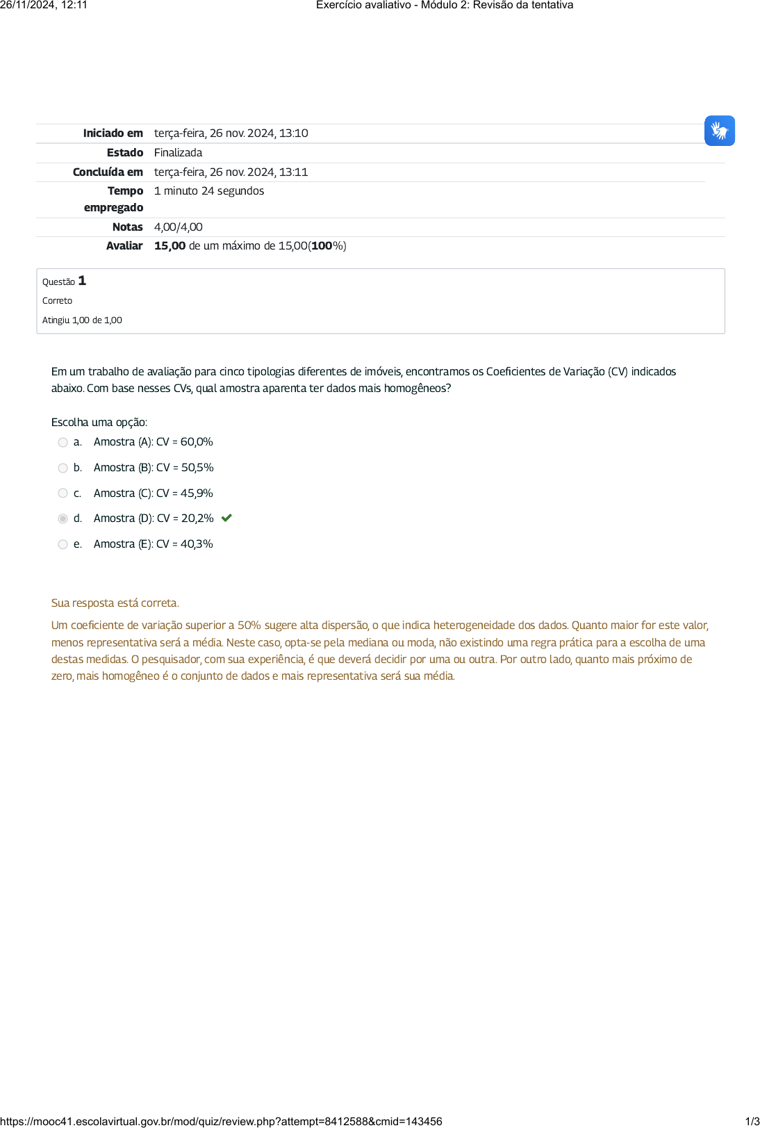 Iniciado em terça-feira, 26 nov. 2024, 13:10 Estado Finalizada Concluída em terça-feira, 26 nov. 2024, 13:11 Tempo empregado 1 minuto 24 segundos Notas 4,00/4,00 Avaliar 15,00 de um máximo de 15,00(100%) Questão 1 Correto Atingiu 1,00 de 1,00 Em um trabalho de avaliação para cinco tipologias diferentes de imóveis, encontramos os Coe�cientes de Variação (CV) indicados abaixo. Com base nesses CVs, qual amostra aparenta ter dados mais homogêneos? Escolha uma opção: a. Amostra (A): CV = 60,0% b. Amostra (B): CV = 50,5% c. Amostra (C): CV = 45,9% d. Amostra (D): CV = 20,2% e. Amostra (E): CV = 40,3% Sua resposta está correta. Um coe�ciente de variação superior a 50% sugere alta dispersão, o que indica heterogeneidade dos dados. Quanto maior for este valor, menos representativa será a média. Neste caso, opta-se pela mediana ou moda, não existindo uma regra prática para a escolha de uma destas medidas. O pesquisador, com sua experiência, é que deverá decidir por uma ou outra. Por outro lado, quanto mais próximo de zero, mais homogêneo é o conjunto de dados e mais representativa será sua média. 26/11/2024, 12:11 Exercício avaliativo - Módulo 2: Revisão da tentativa https://mooc41.escolavirtual.gov.br/mod/quiz/review.php?attempt=8412588&cmid=143456 1/3 Questão 2 Correto Atingiu 1,00 de 1,00 Questão 3 Correto Atingiu 1,00 de 1,00 Das citações abaixo, qual não representa uma característica da média aritmética? Escolha uma opção: a. a média é um valor calculado facilmente e depende de todas as observações b. é única em um conjunto de dados e nem sempre tem existência real, ou seja, nem sempre é igual a um determinado valor observado c. a média é afetada por valores extremos observados d. a soma da diferença de cada valor observado em relação à média é zero, ou seja, a soma dos desvios é zero e. seu valor não é afetado pelos valores extremos do conjunto de dados analisado Sua resposta está correta. Na média aritmética, por ser dependente de todos os valores observados, qualquer modi�cação nos dados fará com que ocorram alterações. Já a Moda não tem seu valor afetado pelos valores extremos do conjunto de dados analisado. Para estudo de mercado, encontramos alguns modelos de regressão linear múltiplo indicados pelos coe�cientes de determinação ou correlação abaixo. Qual alternativa representa o modelo de maior poder de explicação? Escolha uma opção: a. Coe�ciente de determinação R² = 0,85 b. Coe�ciente de correlação R = 0,85 c. Coe�ciente de correlação R = 0,80 d. Coe�ciente de determinação R² = 0,80 e. Coe�ciente de correlação R = 0,90 Sua resposta está correta. Sabendo que o coe�ciente de correlação R é = √R ≫ R = 0,85 então R = √0,85 = 0,92. Quanto mais próximo de 1 o R, maior poder de explicação, sendo que R = 1 é uma correlação perfeita. 2 2 26/11/2024, 12:11 Exercício avaliativo - Módulo 2: Revisão da tentativa https://mooc41.escolavirtual.gov.br/mod/quiz/review.php?attempt=8412588&cmid=143456 2/3 Questão 4 Correto Atingiu 1,00 de 1,00 Qual dos parâmetros apontados não indica um bom modelo de regressão linear? Escolha uma opção: a. Coe�ciente de correlação R = 0, 94 b. Coe�ciente de determinação R² = 0,81 c. frequência relativa dos resíduos (70%, 89% e 94%) d. signi�cância de uma variável independente de 40,0% e. nenhuma das alternativas anteriores, pois todas têm bons parâmetros Sua resposta está correta. Uma signi�cância alta para uma variável independente no modelo signi�ca que ela não é importante na composição do modelo, lembrando que a NBR 14653 exige no máximo uma signi�cância de 30% para atingir Grau de Fundamentação I. 26/11/2024, 12:11 Exercício avaliativo - Módulo 2: Revisão da tentativa https://mooc41.escolavirtual.gov.br/mod/quiz/review.php?attempt=8412588&cmid=143456 3/3