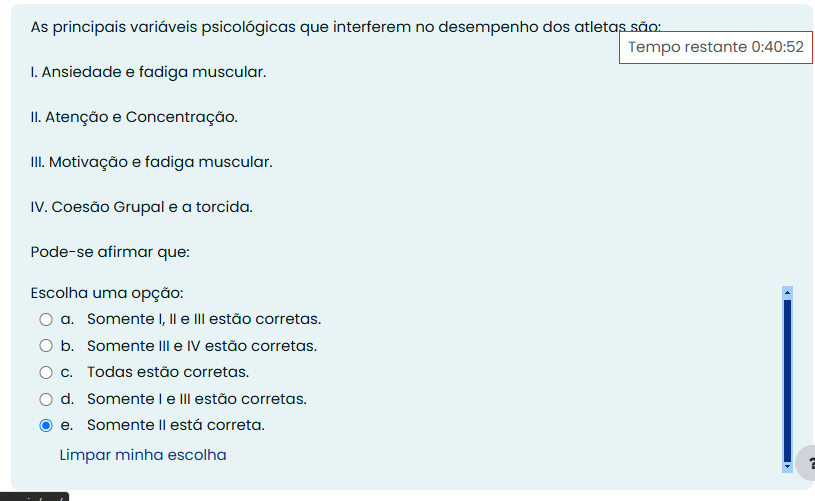 As principais variáveis psicológicas que interferem no desempenho dos atletas são: Tempo restante 0:40:52 I. Ansiedade e fadiga II. Atenção e Concentração. III. Motivação e fadiga IV. Coesão Grupal e a torcida. Pode-se afirmar que: Escolha uma opção: a. Somente I, e III estão corretas. b. Somente III e IV estão corretas. C. Todas estão corretas. d. Somente I e III estão corretas. e. Somente II está minha escolha ?