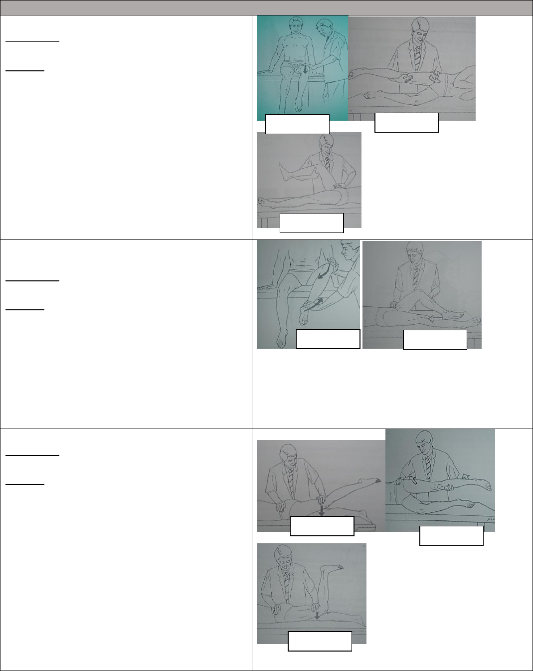 UNIVERSIDADE FEDERAL DO DELTA DO PARNAÍBA DISCIPLINA: MTAF II PROFESSORA: SAMARA SOUSA VASCONCELOS GOUVEIA ROTEIROS PRÁTICOS QUADRIL - PROVAS DE FUNÇÃO MUSCULAR E TESTES ESPECÍFICOS QUADRIL 1. Flexão do Quadril (com flexão do joelho) Movimento: Realizar a flexão do quadril, com o joelho fletido. Posição: Sentado sobre a maca (graus 3 a 5) (Figura 1); decúbito lateral, com o membro apoiado pelo terapeuta (grau 2) (Figura 2); decúbito dorsal (graus 0 e 1) (Figura 3). 2. Flexão, Abdução e Rotação Externa do Quadril (com flexão do joelho) Movimento: Realizar o movimento como se fosse cruzar a perna. Posição: Sentado (Graus 3 a 5) (Figura 4); decúbito dorsal (graus 0 a 2) (Figura 5). Obs: A resistência será dada pelo terapeuta na região lateral do joelho e na região medial e distal da perna. Obs 2: Para o teste do grau 2, o calcanhar do membro testado deve ser colocado sobre a perna contralateral e solicitar ao paciente que deslize seu calcanhar para cima até o joelho. 3. Extensão do Quadril Movimento: Realizar a extensão do quadril com o joelho estendido. Posição: Decúbito ventral, segurando nas bordas da maca (graus 0, 1, 3 a 5) (Figura 6). O terapeuta deve estabilizar a pelve do paciente durante o teste. Decúbito lateral com o membro testado para cima (grau 2) (Figura 7). Obs: Para isolar o Glúteo Máximo, deve-se realizar este teste com o joelho do paciente flexionado. (Figura 8) Obs 2: Quando o paciente apresenta contratura para flexão do quadril, os testes para os graus (3 a 5) podem ser realizados com o mesmo de pé, com o tronco inclinado e apoiado sobre a maca FIGURA 1 FIGURA 2 FIGURA 3 FIGURA 4 FIGURA 5 FIGURA 6 FIGURA 7 FIGURA 8 4. Abdução do Quadril Movimento: Elevar a perna, realizando a abdução do quadril. Posição: Decúbito lateral (graus 3 a 5) (Figura 9); decúbito dorsal, com a perna levemente suspensa da maca pelo terapeuta (graus 0 a 2) (Figura 10). 5. Abdução do Quadril a partir da Posição Fletida Movimento: Realiza a abdução do quadril (30º), mantendo a flexão de 45º. Posição: Decúbito lateral, com o membro testado para cima, sendo o quadril flexionado em 45º (à frente do membro de suporte, com o pé apoiado sobre a maca) (para os graus 3 a 5) (Figuras 11 e 12). Sentado, com as pernas apoiadas na maca e o tronco inclinado para trás (formando um ângulo de 45º) (para os graus 0 a 2) (Figura 13). 6. Adução do Quadril Movimento: Realizar a adução do quadril. Posição: Decúbito lateral, com o membro a ser testado para baixo e o outro membro sendo sustentado pelo terapeuta em uma abdução de 25º (graus 3 a 5) (Figura 14). Decúbito dorsal (graus 0 a 2) (Figura 15). 7. Rotação Externa do Quadril Movimento: Rodar externamente o quadril. Posição: Sentado com as pernas fora da maca (graus 3 a 5) (Figura 16). Decúbito dorsal, com o membro testado partindo da rotação interna (graus 0 a 2) (Figura 17). FIGURA 9 FIGURA 10 FIGURA 11 FIGURA 12 FIGURA 13 FIGURA 14 FIGURA 15 FIGURA 16 FIGURA 17 8. Rotação Interna do Quadril Movimento: Rodar internamente o quadril. Posição: Sentado com as pernas fora da maca (graus 3 a 5) (Figura 18). Decúbito dorsal, com o membro testado partindo da rotação externa. (graus 0 a 2) (Figura 19). OBSERVAÇÃO IMPORTANTE: Para complementação do seu estudo, deverá ser realizada a correspondência entre os movimentos testados e os músculos responsáveis pelos mesmos. REFERÊNCIA: HISLOP, H; MONTGOMERY, J. Daniels e Worthingham Provas de Função Muscular – Técnicas de Exame Manual – 8ª edição, 2008. TESTES ESPECÍFICOS PARA QUADRIL - Teste de Trendelenburg O que testa: fraqueza do glúteo médio. Paciente em pé, terapeuta atrás do mesmo, palpando as EIPSs. Solicita-se ao paciente que flexione uma perna, ficando em apoio unipodal. Resultado Positivo: Queda da pelve para o lado sem apoio, indicando fraqueza do glúteo médio do lado do membro de apoio. Incapacidade de manter a posição. - Teste de Ely O que testa: encurtamento/contratura do reto femoral. Paciente em decúbito ventral, o terapeuta deverá fazer uma flexão de joelho passiva até encostar o tornozelo do paciente em sua nádega. Resultado Positivo: Flexão involuntária de quadril durante o teste. - Teste do Piriforme O que testa: encurtamento/contratura do piriforme. Paciente sentado. Paciente em decúbito ventral com os joelhos flexionados. O terapeuta irá juntar os dois joelhos do paciente e solicitar que o mesmo deixe as duas pernas abrirem, realizando uma rotação interna do quadril. Resultado Positivo: Ao ocorrer uma assimetria de amplitude de RI, verificar qual perna ficou mais vertical. - Teste de Ober O que testa: contratura do tensor da fáscia lata e/ou da banda iliotibial. FIGURA 18 FIGURA 19 Paciente em decúbito lateral, o terapeuta irá abduzir sua perna e soltá-la a seguir. Com uma das mãos o terapeuta deve estabilizar a crista ilíaca do paciente. Resultado Positivo: a perna manterá uma abdução. - Teste de Thomas O que testa: contratura/encurtamento de psoas e/ou reto femoral. Paciente deitado na borda inferior da maca, com o quadril apoiado e as pernas pendentes. O paciente irá abraçar um dos membros. Resultado Positivo: Psoas: ocorrerá uma flexão de quadril no membro contralateral; Reto femoral: ocorrerá uma extensão de joelho no membro contralateral.