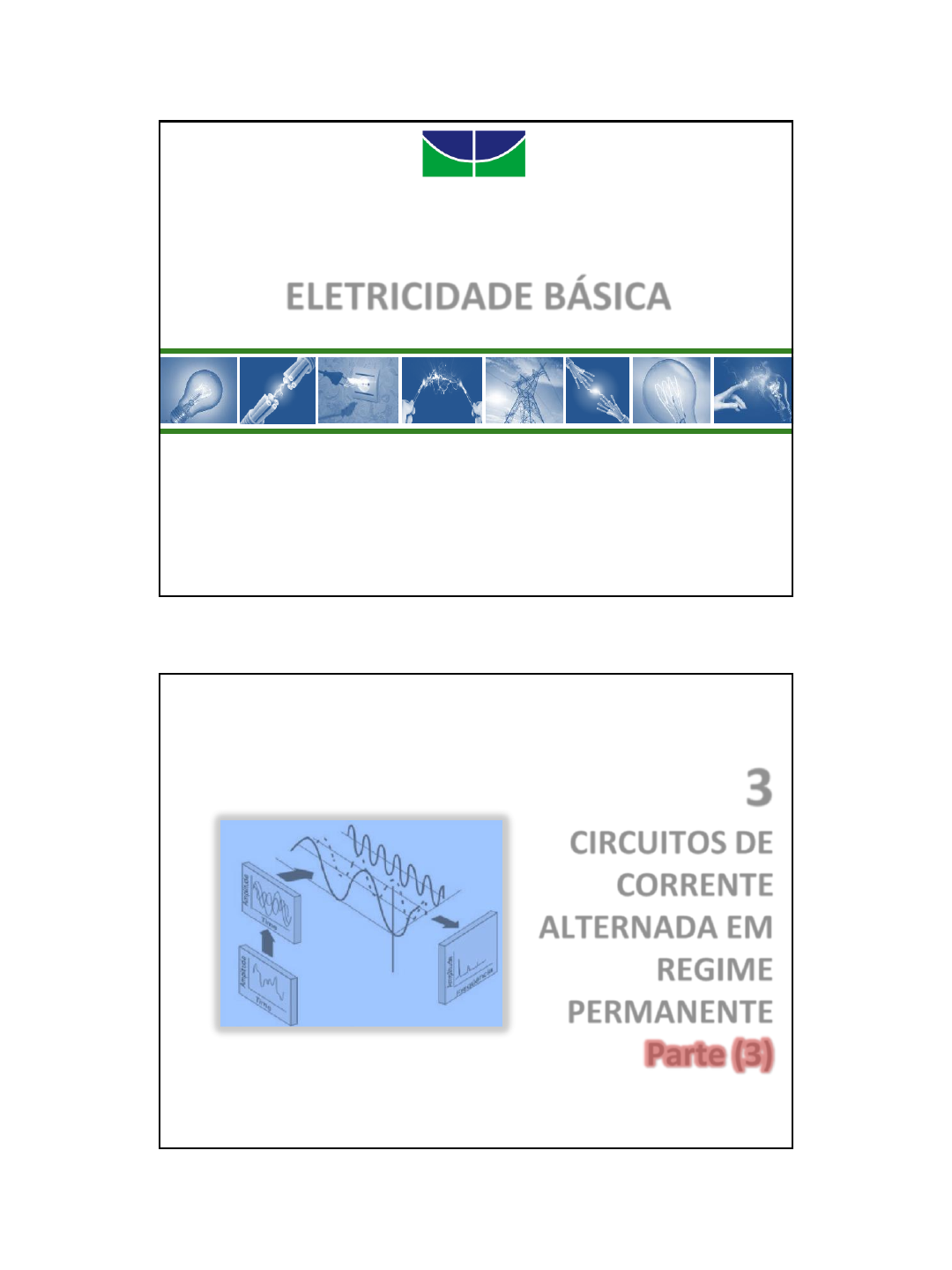 03/03/2016 1 Universidade de Brasília – UnB Departamento de Engenharia Elétrica – ENE ELETRICIDADE BÁSICA Prof.: Felipe V. Lopes, D. Sc. EB 1 Brasília, 2016 Unidade 3 CIRCUITOS DE CORRENTE ALTERNADA EM REGIME PERMANENTE Parte (3) EB 2 03/03/2016 2 Na Última Aula EB 3 Valor médio Valor eficaz Fasores Operações algébrica com fasores P ro f. F e lip e Lo p es , D .S c. Na Aula de Hoje EB 4 • Diagramas fasoriais Representação gráfica de operações e relação dos fasores • Relações V x I nos circuitos CA Resistores, indutores e capacitores • Impedância e admitância P ro f. F e lip e Lo p es , D .S c. 03/03/2016 3 Referências Bibliográficas EB 5 P ro f. F e lip e Lo p es , D .S c. EB 6 efm VVtVtv ˆ)(sen)( Representação de sinais senoidais no tempo quando possuem mesma frequência (representação no domínio da frequência) Fasores Revisão ATENÇÃO! Alguns livros consideram o valor de pico mVV̂ Consideraremos P ro f. F e lip e Lo p es , D .S c. 03/03/2016 4 EB 7 Fasores Revisão Existe uma defasagem de θ3 - θ2 entre as tensões v3 e v2 P ro f. F e lip e Lo p es , D .S c. EB 8 Fasores Revisão Chamaremos a defasagem de θ3 - θ2 de Δθ P ro f. F e lip e Lo p es , D .S c. 03/03/2016 5 EB 9 Fasores Revisão Quando os fasores giram com frequência angular ω, a defasagem Δθ permanece constante P ro f. F e lip e Lo p es , D .S c. EB 10 Fasores Revisão Quando os fasores giram com frequência angular ω, a defasagem Δθ permanece constante P ro f. F e lip e Lo p es , D .S c. 03/03/2016 6 EB 11 Fasores Revisão Quando os fasores giram com frequência angular ω, a defasagem Δθ permanece constante P ro f. F e lip e Lo p es , D .S c. EB 12 Diagramas Fasoriais Motivação • Se as relações de fase permanecem constantes para sinais com mesma frequência Representar graficamente as operações de fasores Representar graficamente as relações entre fasores Diagrama Fasorial “Desenho” no plano dos fasores que nos permite relacioná-los geometricamente - Bastante útil na análise de circuitos CA em regime permanente P ro f. F e lip e Lo p es , D .S c. 03/03/2016 7 EB 13 Diagramas Fasoriais Exemplo da aula passada • Obtenha na forma polar a soma de três correntes senoidais que chegam a um nó de um circuito (LKC). )90tsen(28 )30tsen(26 t)sen(25 3 2 1 i i i 12,2636,11ˆˆˆ 321 III A 05ˆ 1 I A 306ˆ 2 I A 908ˆ 3 I P ro f. F e lip e Lo p es , D .S c. EB 14 Diagramas Fasoriais 05ˆ 1 I 306ˆ 2 I 908ˆ 3 I 12,2636,11ˆ I P ro f. F e lip e Lo p es , D .S c. 03/03/2016 8 EB 15 Fasores 05ˆ 1 I 306ˆ 2 I 908ˆ 3 I 12,2636,11ˆ I ATENÇÃO Diagramas fasoriais só podem conter fasores, pois são diferentes de diagramas polares (vetoriais), nos quais são representadas grandezas complexas não senoidais! P ro f. F e lip e Lo p es , D .S c. EB 16 Impedância e Admitância Introdução • Os conceitos de impedância e admitância Provenientes das relações entre fasores de tensão e corrente para elementos de circuitos Resistores Indutores Capacitores • Se os fasores das tensões e correntes são conhecidos (representação para uma dada frequência) Torna-se possível obter as relações V x I para esta dada frequência (circuito equivalente no domínio da frequência) P ro f. F e lip e Lo p es , D .S c. 03/03/2016 9 EB 17 Impedância e Admitância Introdução • Primeiro conceito a ser entendido Operador imaginário j 1110|| 22 j 90 0 1 11 tgtgj 901j 1j P ro f. F e lip e Lo p es , D .S c. EB 18 Impedância e Admitância Obtenção das relações V x I na frequência • Elementos de circuito estudados Resistores ▪ Indutores ▪ Capacitores • Sinais de entrada considerado nas análises Riv dt di Lv dt dv Ci )(sen tIi m )(sen tVv m Para: Resistores, Indutores Para: Capacitores P ro f. F e lip e Lo p es , D .S c. 03/03/2016 10 EB 19 Impedância e Admitância Obtenção das relações V x I na frequência • Resistores Riv IRV ˆˆ efI m tIRv )(sen I efIRV ˆ ˆ Tensão e corrente possuem mesma fase (estão em fase) )(sen tIi m P ro f. F e lip e Lo p es , D .S c. EB 20 Impedância e Admitância Obtenção das relações V x I na frequência • Resistores IRV ˆˆ P ro f. F e lip e Lo p es , D .S c. 03/03/2016 11 EB 21 Impedância e Admitância Obtenção das relações V x I na frequência • Indutores dt di Lv )90(sen )(cos t m tLI dt di Lv )(sen tIi m 90 )90(sen efI m tILv Î j ILjV ˆˆ V adiantada de 90o de I (I atrasada de 90o de V) 901 )90(ˆ efI efILV P ro f. F e lip e Lo p es , D .S c. EB 22 Impedância e Admitância Obtenção das relações V x I na frequência • Indutores ILjV ˆˆ P ro f. F e lip e Lo p es , D .S c. 03/03/2016 12 EB 23 Impedância e Admitância Obtenção das relações V x I na frequência • Capacitores dt dv Ci )90(sen )(cos t m tCV dt dv Ci )(sen tVv m 90 )90(sen efV m tVCi V j VCjI ˆˆ V atrasada de 90o de I (I adiantada de 90o de V) ^ I C jI Cj V ˆ1ˆ1ˆ 901 )90(ˆ efV efVCI P ro f. F e lip e Lo p es , D .S c. EB 24 Impedância e Admitância Obtenção das relações V x I na frequência • Capacitores I C jV ˆ1ˆ P ro f. F e lip e Lo p es , D .S c. 03/03/2016 13 EB 25 Impedância e Admitância Resumo das Relações V x I Elemento No tempo Na frequência 𝑅 𝑣 = 𝑅𝑖 𝑉 = 𝑅𝐼 𝐿 𝑣 = 𝐿 𝑑𝑖 𝑑𝑡 𝑉 = 𝑗𝜔𝐿𝐼 𝐶 𝑖 = 𝐶 𝑑𝑣 𝑑𝑡 𝑉 = 1 𝑗𝜔𝐶 𝐼 Relações não-lineares Relações lineares P ro f. F e lip e Lo p es , D .S c. EB 26 Impedância Z Fórmulas Elemento Na frequência 𝑅 𝑉 = 𝑅𝐼 𝐿 𝑉 = 𝑗𝜔𝐿𝐼 𝐶 𝑉 = 1 𝑗𝜔𝐶 𝐼 Impedância Z Razão entre a tensãofasorial𝑽 e a correntefasorial𝑰 , medidaem ohms (Ω) Impedância não é um fasor, pois é uma grandeza que não varia como uma senóide! Impedâncias 𝑍𝑅 = 𝑅 𝑍𝐼 = 𝑗𝜔𝐿 𝑍𝐶 = 1 𝑗𝜔𝐶 = −𝑗 1 𝜔𝐶 P ro f. F e lip e Lo p es , D .S c. 03/03/2016 14 EB 27 Impedância Z Confirmação do que estudamos! • Para sistem