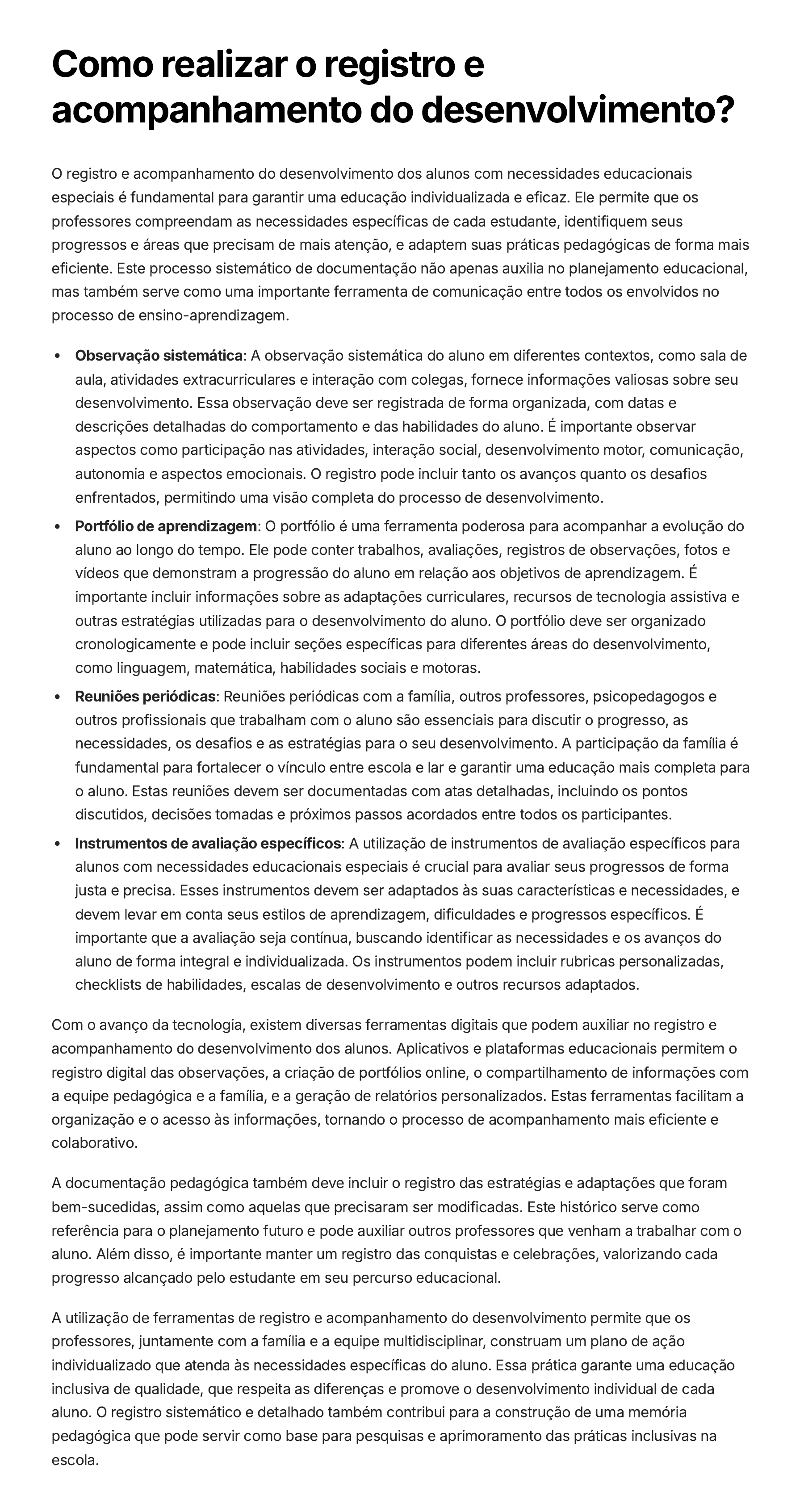 Como realizar o registro e acompanhamento do desenvolvimento? O registro e acompanhamento do desenvolvimento dos alunos com necessidades educacionais especiais é fundamental para garantir uma educação individualizada e eficaz. Ele permite que os professores compreendam as necessidades específicas de cada estudante, identifiquem seus progressos e áreas que precisam de mais atenção, e adaptem suas práticas pedagógicas de forma mais eficiente. Este processo sistemático de documentação não apenas auxilia no planejamento educacional, mas também serve como uma importante ferramenta de comunicação entre todos os envolvidos no processo de ensino-aprendizagem. Observação sistemática: A observação sistemática do aluno em diferentes contextos, como sala de aula, atividades extracurriculares e interação com colegas, fornece informações valiosas sobre seu desenvolvimento. Essa observação deve ser registrada de forma organizada, com datas e descrições detalhadas do comportamento e das habilidades do aluno. É importante observar aspectos como participação nas atividades, interação social, desenvolvimento motor, comunicação, autonomia e aspectos emocionais. O registro pode incluir tanto os avanços quanto os desafios enfrentados, permitindo uma visão completa do processo de desenvolvimento. Portfólio de aprendizagem: O portfólio é uma ferramenta poderosa para acompanhar a evolução do aluno ao longo do tempo. Ele pode conter trabalhos, avaliações, registros de observações, fotos e vídeos que demonstram a progressão do aluno em relação aos objetivos de aprendizagem. É importante incluir informações sobre as adaptações curriculares, recursos de tecnologia assistiva e outras estratégias utilizadas para o desenvolvimento do aluno. O portfólio deve ser organizado cronologicamente e pode incluir seções específicas para diferentes áreas do desenvolvimento, como linguagem, matemática, habilidades sociais e motoras. Reuniões periódicas: Reuniões periódicas com a família, outros professores, psicopedagogos e outros profissionais que trabalham com o aluno são essenciais para discutir o progresso, as necessidades, os desafios e as estratégias para o seu desenvolvimento. A participação da família é fundamental para fortalecer o vínculo entre escola e lar e garantir uma educação mais completa para o aluno. Estas reuniões devem ser documentadas com atas detalhadas, incluindo os pontos discutidos, decisões tomadas e próximos passos acordados entre todos os participantes. Instrumentos de avaliação específicos: A utilização de instrumentos de avaliação específicos para alunos com necessidades educacionais especiais é crucial para avaliar seus progressos de forma justa e precisa. Esses instrumentos devem ser adaptados às suas características e necessidades, e devem levar em conta seus estilos de aprendizagem, dificuldades e progressos específicos. É importante que a avaliação seja contínua, buscando identificar as necessidades e os avanços do aluno de forma integral e individualizada. Os instrumentos podem incluir rubricas personalizadas, checklists de habilidades, escalas de desenvolvimento e outros recursos adaptados. Com o avanço da tecnologia, existem diversas ferramentas digitais que podem auxiliar no registro e acompanhamento do desenvolvimento dos alunos. Aplicativos e plataformas educacionais permitem o registro digital das observações, a criação de portfólios online, o compartilhamento de informações com a equipe pedagógica e a família, e a geração de relatórios personalizados. Estas ferramentas facilitam a organização e o acesso às informações, tornando o processo de acompanhamento mais eficiente e colaborativo. A documentação pedagógica também deve incluir o registro das estratégias e adaptações que foram bem-sucedidas, assim como aquelas que precisaram ser modificadas. Este histórico serve como referência para o planejamento futuro e pode auxiliar outros professores que venham a trabalhar com o aluno. Além disso, é importante manter um registro das conquistas e celebrações, valorizando cada progresso alcançado pelo estudante em seu percurso educacional. A utilização de ferramentas de registro e acompanhamento do desenvolvimento permite que os professores, juntamente com a família e a equipe multidisciplinar, construam um plano de ação individualizado que atenda às necessidades específicas do aluno. Essa prática garante uma educação inclusiva de qualidade, que respeita as diferenças e promove o desenvolvimento individual de cada aluno. O registro sistemático e detalhado também contribui para a construção de uma memória pedagógica que pode servir como base para pesquisas e aprimoramento das práticas inclusivas na escola.