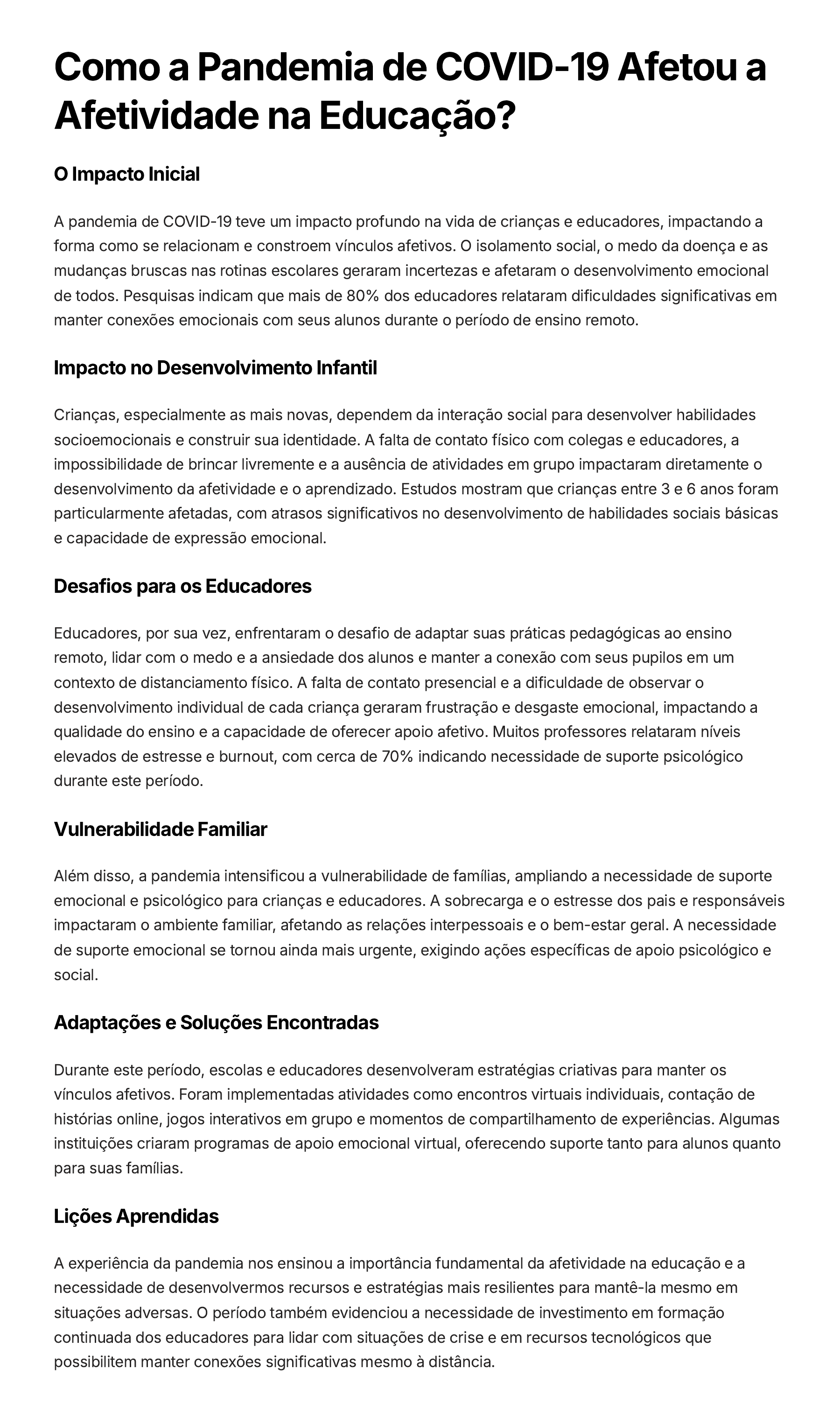 Como a Pandemia de COVID-19 Afetou a Afetividade na Educação? O Impacto Inicial A pandemia de COVID-19 teve um impacto profundo na vida de crianças e educadores, impactando a forma como se relacionam e constroem vínculos afetivos. O isolamento social, o medo da doença e as mudanças bruscas nas rotinas escolares geraram incertezas e afetaram o desenvolvimento emocional de todos. Pesquisas indicam que mais de 80% dos educadores relataram dificuldades significativas em manter conexões emocionais com seus alunos durante o período de ensino remoto. Impacto no Desenvolvimento Infantil Crianças, especialmente as mais novas, dependem da interação social para desenvolver habilidades socioemocionais e construir sua identidade. A falta de contato físico com colegas e educadores, a impossibilidade de brincar livremente e a ausência de atividades em grupo impactaram diretamente o desenvolvimento da afetividade e o aprendizado. Estudos mostram que crianças entre 3 e 6 anos foram particularmente afetadas, com atrasos significativos no desenvolvimento de habilidades sociais básicas e capacidade de expressão emocional. Desafios para os Educadores Educadores, por sua vez, enfrentaram o desafio de adaptar suas práticas pedagógicas ao ensino remoto, lidar com o medo e a ansiedade dos alunos e manter a conexão com seus pupilos em um contexto de distanciamento físico. A falta de contato presencial e a dificuldade de observar o desenvolvimento individual de cada criança geraram frustração e desgaste emocional, impactando a qualidade do ensino e a capacidade de oferecer apoio afetivo. Muitos professores relataram níveis elevados de estresse e burnout, com cerca de 70% indicando necessidade de suporte psicológico durante este período. Vulnerabilidade Familiar Além disso, a pandemia intensificou a vulnerabilidade de famílias, ampliando a necessidade de suporte emocional e psicológico para crianças e educadores. A sobrecarga e o estresse dos pais e responsáveis impactaram o ambiente familiar, afetando as relações interpessoais e o bem-estar geral. A necessidade de suporte emocional se tornou ainda mais urgente, exigindo ações específicas de apoio psicológico e social. Adaptações e Soluções Encontradas Durante este período, escolas e educadores desenvolveram estratégias criativas para manter os vínculos afetivos. Foram implementadas atividades como encontros virtuais individuais, contação de histórias online, jogos interativos em grupo e momentos de compartilhamento de experiências. Algumas instituições criaram programas de apoio emocional virtual, oferecendo suporte tanto para alunos quanto para suas famílias. Lições Aprendidas A experiência da pandemia nos ensinou a importância fundamental da afetividade na educação e a necessidade de desenvolvermos recursos e estratégias mais resilientes para mantê-la mesmo em situações adversas. O período também evidenciou a necessidade de investimento em formação continuada dos educadores para lidar com situações de crise e em recursos tecnológicos que possibilitem manter conexões significativas mesmo à distância.