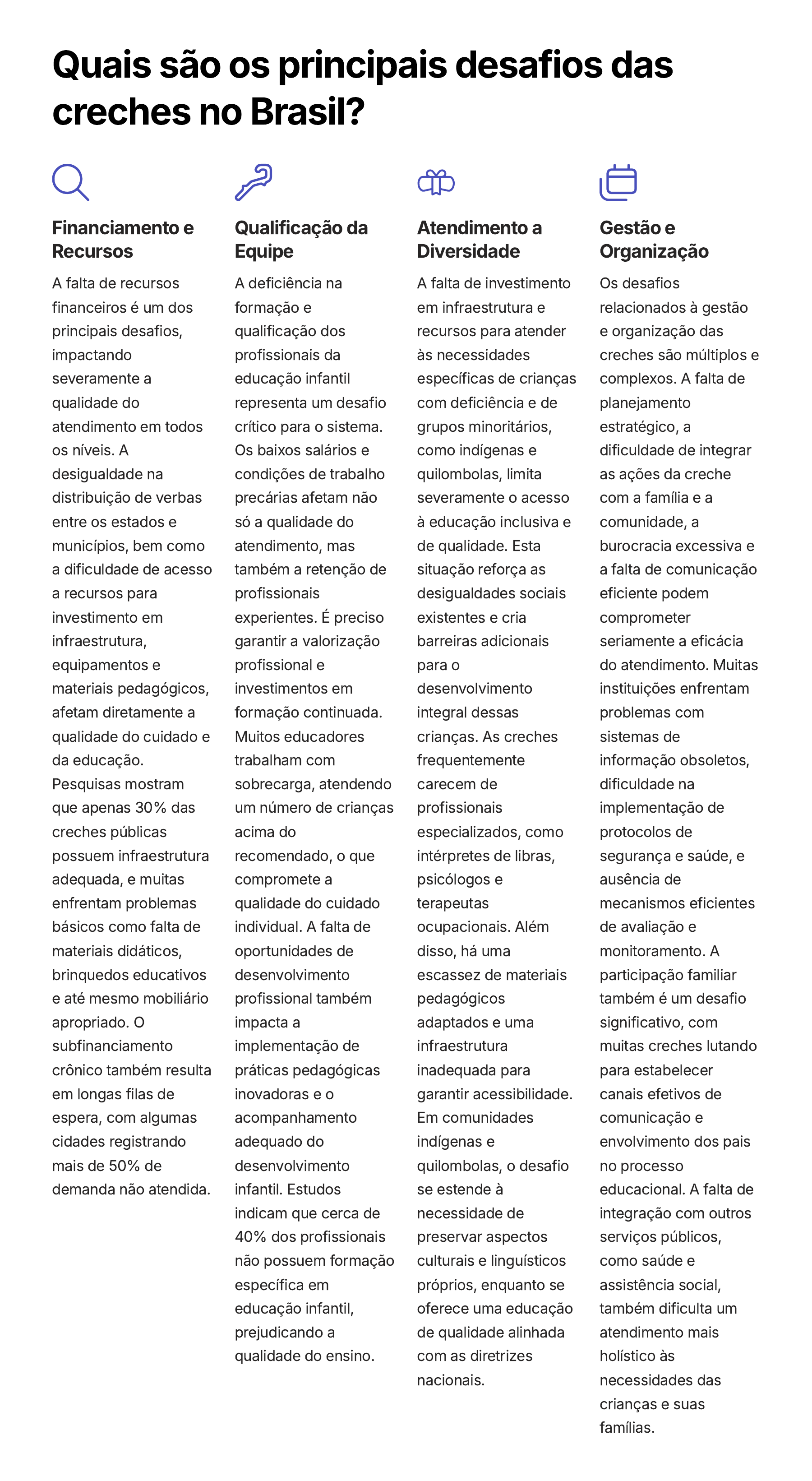 Quais são os principais desafios das creches no Brasil? Financiamento e Recursos A falta de recursos financeiros é um dos principais desafios, impactando severamente a qualidade do atendimento em todos os níveis. A desigualdade na distribuição de verbas entre os estados e municípios, bem como a dificuldade de acesso a recursos para investimento em infraestrutura, equipamentos e materiais pedagógicos, afetam diretamente a qualidade do cuidado e da educação. Pesquisas mostram que apenas 30% das creches públicas possuem infraestrutura adequada, e muitas enfrentam problemas básicos como falta de materiais didáticos, brinquedos educativos e até mesmo mobiliário apropriado. O subfinanciamento crônico também resulta em longas filas de espera, com algumas cidades registrando mais de 50% de demanda não atendida. Qualificação da Equipe A deficiência na formação e qualificação dos profissionais da educação infantil representa um desafio crítico para o sistema. Os baixos salários e condições de trabalho precárias afetam não só a qualidade do atendimento, mas também a retenção de profissionais experientes. É preciso garantir a valorização profissional e investimentos em formação continuada. Muitos educadores trabalham com sobrecarga, atendendo um número de crianças acima do recomendado, o que compromete a qualidade do cuidado individual. A falta de oportunidades de desenvolvimento profissional também impacta a implementação de práticas pedagógicas inovadoras e o acompanhamento adequado do desenvolvimento infantil. Estudos indicam que cerca de 40% dos profissionais não possuem formação específica em educação infantil, prejudicando a qualidade do ensino. Atendimento a Diversidade A falta de investimento em infraestrutura e recursos para atender às necessidades específicas de crianças com deficiência e de grupos minoritários, como indígenas e quilombolas, limita severamente o acesso à educação inclusiva e de qualidade. Esta situação reforça as desigualdades sociais existentes e cria barreiras adicionais para o desenvolvimento integral dessas crianças. As creches frequentemente carecem de profissionais especializados, como intérpretes de libras, psicólogos e terapeutas ocupacionais. Além disso, há uma escassez de materiais pedagógicos adaptados e uma infraestrutura inadequada para garantir acessibilidade. Em comunidades indígenas e quilombolas, o desafio se estende à necessidade de preservar aspectos culturais e linguísticos próprios, enquanto se oferece uma educação de qualidade alinhada com as diretrizes nacionais. Gestão e Organização Os desafios relacionados à gestão e organização das creches são múltiplos e complexos. A falta de planejamento estratégico, a dificuldade de integrar as ações da creche com a família e a comunidade, a burocracia excessiva e a falta de comunicação eficiente podem comprometer seriamente a eficácia do atendimento. Muitas instituições enfrentam problemas com sistemas de informação obsoletos, dificuldade na implementação de protocolos de segurança e saúde, e ausência de mecanismos eficientes de avaliação e monitoramento. A participação familiar também é um desafio significativo, com muitas creches lutando para estabelecer canais efetivos de comunicação e envolvimento dos pais no processo educacional. A falta de integração com outros serviços públicos, como saúde e assistência social, também dificulta um atendimento mais holístico às necessidades das crianças e suas famílias.