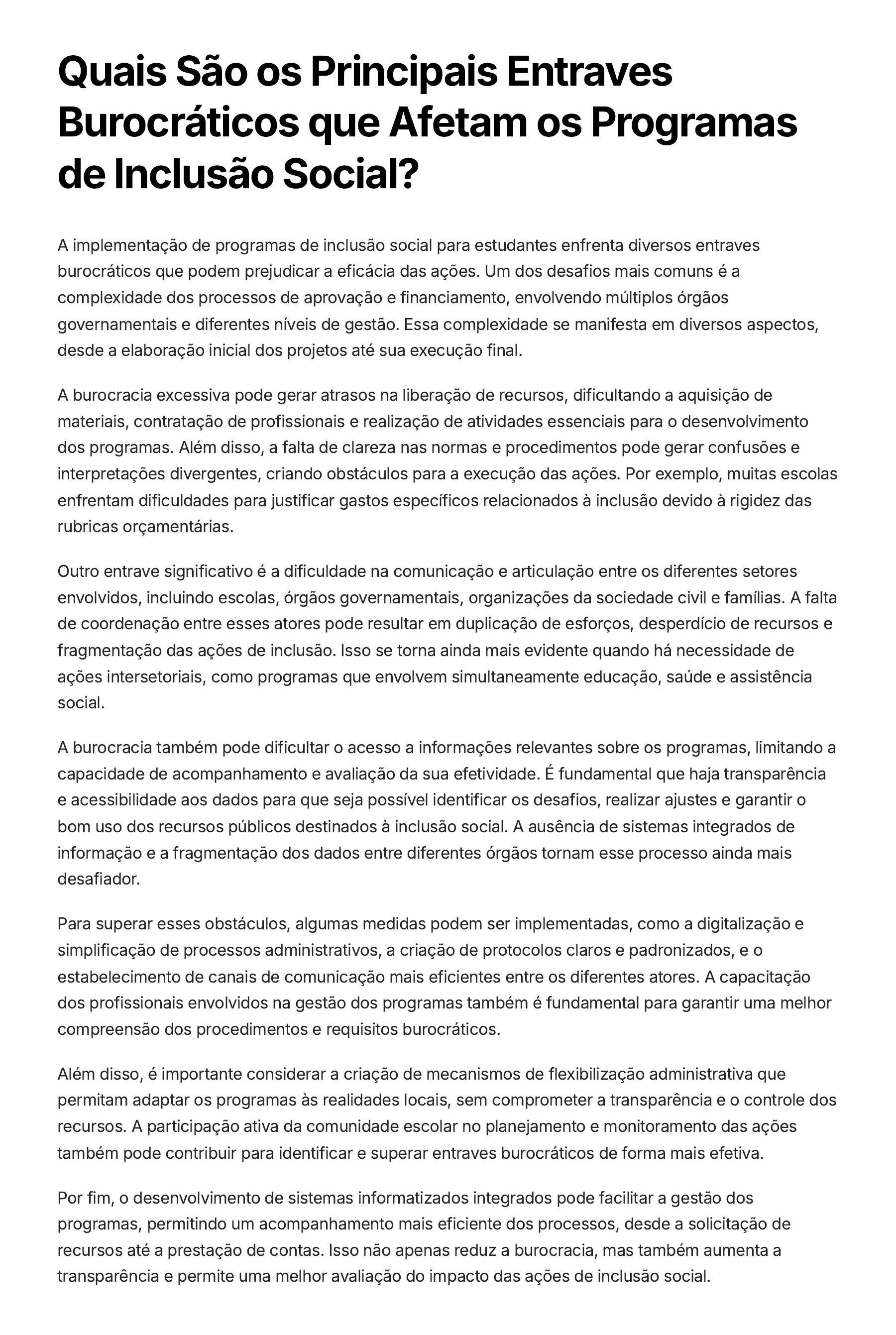 Quais São os Principais Entraves Burocráticos que Afetam os Programas de Inclusão Social? A implementação de programas de inclusão social para estudantes enfrenta diversos entraves burocráticos que podem prejudicar a eficácia das ações. Um dos desafios mais comuns é a complexidade dos processos de aprovação e financiamento, envolvendo múltiplos órgãos governamentais e diferentes níveis de gestão. Essa complexidade se manifesta em diversos aspectos, desde a elaboração inicial dos projetos até sua execução final. A burocracia excessiva pode gerar atrasos na liberação de recursos, dificultando a aquisição de materiais, contratação de profissionais e realização de atividades essenciais para o desenvolvimento dos programas. Além disso, a falta de clareza nas normas e procedimentos pode gerar confusões e interpretações divergentes, criando obstáculos para a execução das ações. Por exemplo, muitas escolas enfrentam dificuldades para justificar gastos específicos relacionados à inclusão devido à rigidez das rubricas orçamentárias. Outro entrave significativo é a dificuldade na comunicação e articulação entre os diferentes setores envolvidos, incluindo escolas, órgãos governamentais, organizações da sociedade civil e famílias. A falta de coordenação entre esses atores pode resultar em duplicação de esforços, desperdício de recursos e fragmentação das ações de inclusão. Isso se torna ainda mais evidente quando há necessidade de ações intersetoriais, como programas que envolvem simultaneamente educação, saúde e assistência social. A burocracia também pode dificultar o acesso a informações relevantes sobre os programas, limitando a capacidade de acompanhamento e avaliação da sua efetividade. É fundamental que haja transparência e acessibilidade aos dados para que seja possível identificar os desafios, realizar ajustes e garantir o bom uso dos recursos públicos destinados à inclusão social. A ausência de sistemas integrados de informação e a fragmentação dos dados entre diferentes órgãos tornam esse processo ainda mais desafiador. Para superar esses obstáculos, algumas medidas podem ser implementadas, como a digitalização e simplificação de processos administrativos, a criação de protocolos claros e padronizados, e o estabelecimento de canais de comunicação mais eficientes entre os diferentes atores. A capacitação dos profissionais envolvidos na gestão dos programas também é fundamental para garantir uma melhor compreensão dos procedimentos e requisitos burocráticos. Além disso, é importante considerar a criação de mecanismos de flexibilização administrativa que permitam adaptar os programas às realidades locais, sem comprometer a transparência e o controle dos recursos. A participação ativa da comunidade escolar no planejamento e monitoramento das ações também pode contribuir para identificar e superar entraves burocráticos de forma mais efetiva. Por fim, o desenvolvimento de sistemas informatizados integrados pode facilitar a gestão dos programas, permitindo um acompanhamento mais eficiente dos processos, desde a solicitação de recursos até a prestação de contas. Isso não apenas reduz a burocracia, mas também aumenta a transparência e permite uma melhor avaliação do impacto das ações de inclusão social.