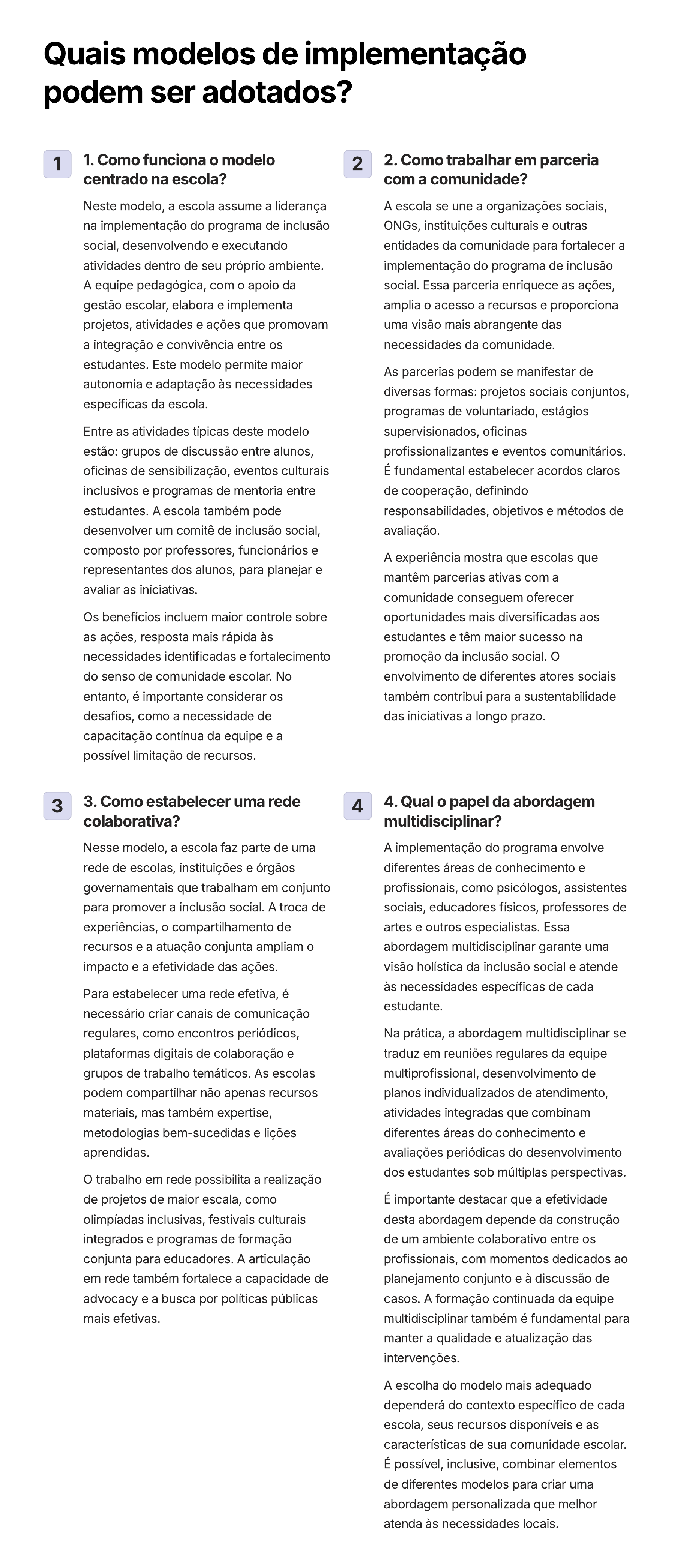 Quais modelos de implementação podem ser adotados? 1 1. Como funciona o modelo centrado na escola? Neste modelo, a escola assume a liderança na implementação do programa de inclusão social, desenvolvendo e executando atividades dentro de seu próprio ambiente. A equipe pedagógica, com o apoio da gestão escolar, elabora e implementa projetos, atividades e ações que promovam a integração e convivência entre os estudantes. Este modelo permite maior autonomia e adaptação às necessidades específicas da escola. Entre as atividades típicas deste modelo estão: grupos de discussão entre alunos, oficinas de sensibilização, eventos culturais inclusivos e programas de mentoria entre estudantes. A escola também pode desenvolver um comitê de inclusão social, composto por professores, funcionários e representantes dos alunos, para planejar e avaliar as iniciativas. Os benefícios incluem maior controle sobre as ações, resposta mais rápida às necessidades identificadas e fortalecimento do senso de comunidade escolar. No entanto, é importante considerar os desafios, como a necessidade de capacitação contínua da equipe e a possível limitação de recursos. 2 2. Como trabalhar em parceria com a comunidade? A escola se une a organizações sociais, ONGs, instituições culturais e outras entidades da comunidade para fortalecer a implementação do programa de inclusão social. Essa parceria enriquece as ações, amplia o acesso a recursos e proporciona uma visão mais abrangente das necessidades da comunidade. As parcerias podem se manifestar de diversas formas: projetos sociais conjuntos, programas de voluntariado, estágios supervisionados, oficinas profissionalizantes e eventos comunitários. É fundamental estabelecer acordos claros de cooperação, definindo responsabilidades, objetivos e métodos de avaliação. A experiência mostra que escolas que mantêm parcerias ativas com a comunidade conseguem oferecer oportunidades mais diversificadas aos estudantes e têm maior sucesso na promoção da inclusão social. O envolvimento de diferentes atores sociais também contribui para a sustentabilidade das iniciativas a longo prazo. 3 3. Como estabelecer uma rede colaborativa? Nesse modelo, a escola faz parte de uma rede de escolas, instituições e órgãos governamentais que trabalham em conjunto para promover a inclusão social. A troca de experiências, o compartilhamento de recursos e a atuação conjunta ampliam o impacto e a efetividade das ações. Para estabelecer uma rede efetiva, é necessário criar canais de comunicação regulares, como encontros periódicos, plataformas digitais de colaboração e grupos de trabalho temáticos. As escolas podem compartilhar não apenas recursos materiais, mas também expertise, metodologias bem-sucedidas e lições aprendidas. O trabalho em rede possibilita a realização de projetos de maior escala, como olimpíadas inclusivas, festivais culturais integrados e programas de formação conjunta para educadores. A articulação em rede também fortalece a capacidade de advocacy e a busca por políticas públicas mais efetivas. 4 4. Qual o papel da abordagem multidisciplinar? A implementação do programa envolve diferentes áreas de conhecimento e profissionais, como psicólogos, assistentes sociais, educadores físicos, professores de artes e outros especialistas. Essa abordagem multidisciplinar garante uma visão holística da inclusão social e atende às necessidades específicas de cada estudante. Na prática, a abordagem multidisciplinar se traduz em reuniões regulares da equipe multiprofissional, desenvolvimento de planos individualizados de atendimento, atividades integradas que combinam diferentes áreas do conhecimento e avaliações periódicas do desenvolvimento dos estudantes sob múltiplas perspectivas. É importante destacar que a efetividade desta abordagem depende da construção de um ambiente colaborativo entre os profissionais, com momentos dedicados ao planejamento conjunto e à discussão de casos. A formação continuada da equipe multidisciplinar também é fundamental para manter a qualidade e atualização das intervenções. A escolha do modelo mais adequado dependerá do contexto específico de cada escola, seus recursos disponíveis e as características de sua comunidade escolar. É possível, inclusive, combinar elementos de diferentes modelos para criar uma abordagem personalizada que melhor atenda às necessidades locais.