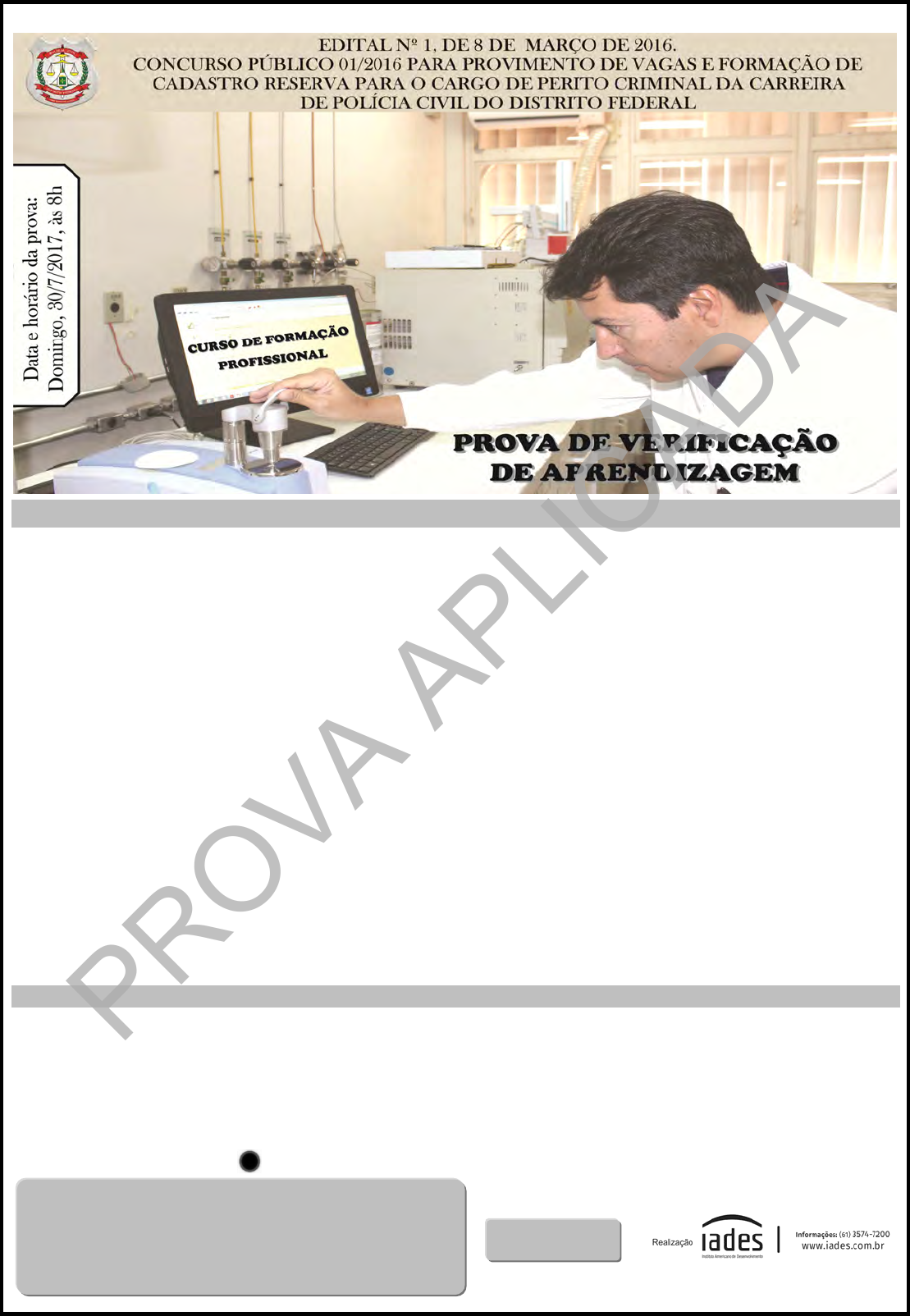 Tipo “A” I N S T R U Ç Õ E S • Você receberá do fiscal: o um caderno de questões da prova de verificação de aprendizagem contendo 100 (cem) questões de múltipla escolha, com 5 (cinco) alternativas de resposta cada uma, e apenas uma alternativa correta; e, o um formulário ótico de respostas personalizado. • Quando autorizado pelo fiscal do IADES, no momento da sua identificação, escreva no espaço apropriado do formulário ótico de respostas, com a sua caligrafia usual, a seguinte frase: A história é escrita pelos vencedores. • Verifique se a numeração das questões, a paginação do caderno de questões e a codificação do formulário ótico de respostas estão corretas. • Você dispõe de 5 (cinco) horas para fazer a prova de verificação de aprendizagem, devendo controlar o tempo, pois não haverá prorrogação desse prazo. Esse tempo inclui a marcação do formulário ótico de respostas. • Somente após decorrida 1 (uma) hora do início da prova de verificação de aprendizagem, você poderá entregar seu formulário ótico de respostas e o caderno da prova e retirar-se da sala. • Somente será permitido levar o caderno de questões da prova de verificação de aprendizagem após 3 (três) horas e 45 (quarenta e cinco) minutos do início da prova. • Após o término da prova, entregue ao fiscal do IADES o formulário ótico de respostas devidamente assinado. • Deixe sobre a carteira apenas o documento de identidade e a caneta esferográfica de tinta azul ou preta, fabricada com material transparente. • Não é permitida a utilização de qualquer tipo de aparelho eletrônico ou de comunicação. • Não é permitida a consulta a livros, dicionários, apontamentos e apostilas. • Você somente poderá sair e retornar à sala de aplicação de provas na companhia de um fiscal do IADES. • Não será permitida a utilização de lápis em nenhuma etapa da prova. I N S T R U Ç Õ E S P A R A A P R O V A D E V E R I F I C A Ç Ã O D E A P R E N D I Z A G E M • Verifique se os seus dados estão corretos no formulário ótico de respostas da prova. Caso haja algum dado incorreto, escreva apenas no(s) campo(s) a ser(em) corrigido(s), conforme instruções no formulário ótico de respostas. • Leia atentamente cada questão e assinale, no formulário ótico de respostas, uma única alternativa. • O formulário ótico de respostas não pode ser dobrado, amassado, rasurado ou manchado e nem pode conter nenhum registro fora dos locais destinados às respostas. • A maneira correta de assinalar a alternativa no formulário ótico de respostas é cobrir, fortemente, com caneta esferográfica de tinta azul ou preta, o espaço a ela correspondente. • Marque as respostas assim: PROVA A PLIC ADA CURSO DE FORMAÇÃO PROFISSIONAL - PCDF TIPO “A” PÁGINA 2/23 Siglas utilizadas na prova PCDF: Polícia Civil do Distrito Federal IC: Instituto de Criminalística da Polícia Civil do Distrito Federal QUESTÃO 1 _______________________ A correta aplicação dos Direitos Humanos, em prol da pessoa, visa à limitação (A) do arbítrio estatal. (B) da igualdade para os indivíduos. (C) dos direitos e das garantias fundamentais. (D) do direito à liberdade. (E) do direito à vida. QUESTÃO 2 _______________________ A violação dos Direitos Humanos, por parte de forças policiais, tem como consequência nefasta o (a) (A) aumento da obediência da população. (B) diminuição da confiança da população nessas forças. (C) aproximação entre polícia e comunidade. (D) liberação de inocentes e a punição de culpados. (E) atendimento qualitativo à vítima, cuja demanda é respondida com mais eficiência. QUESTÃO 3 _______________________ Em relação aos Direitos Humanos, é correto afirmar que (A) os aspectos históricos e culturais não influenciam na sua aplicação e conceituação, uma vez que toda e qualquer ofensa aos Direitos Humanos é recebida com igual repúdio e entendimento em qualquer povo, cultura e época. (B) os Direitos Humanos são simples leis, sempre internas a uma nação, que visam a assegurar a soberania desse mesmo país e a manutenção de seu povo. (C) práticas que ofenderiam a dignidade da pessoa humana, em determinada época e lugar, se aplicadas noutra localidade e em momento distinto, podem ser consideradas completamente normais. (D) não possuem qualquer relação com a dignidade da pessoa humana; são institutos paralelos que possuem objetivos distintos. (E) são princípios internacionais que determinam, de forma absoluta e taxativa, quais práticas passam a ser consideradas agressões à dignidade da pessoa humana. QUESTÃO 4 _______________________ O estudo de vitimologia mostra que pessoas em situações idênticas respondem de maneiras distintas à agressão sofrida. A respeito desse tema, é correto afirmar que (A) a vítima não tem direito a ser tratada com distinção, mesmo que relacionada à dignidade, pois tal tratamento seria considerado uma exceção não permitida. (B) os atos de violência são mais perniciosos do que as catástrofes naturais. (C) a marca de horror na memória da vítima e a consequente supervigilância são de simples tratamento e não deixam qualquer sequela. (D) crianças, portadores de necessidades especiais e idosos carecem de cuidado ainda maior, embora sejam menos suscetíveis a traumas oriundos de episódios de violência. (E) existem diversos programas de apoio às vítimas de violência; no entanto, não cabe ao policial orientar a vítima a buscar quaisquer deles, pois a decisão é de cunho pessoal, e o agente público deve se abster de manifestações quanto ao assunto, com o intuito de preservar a intimidade da vítima. QUESTÃO 5 ________________________ A sociedade espera de todo servidor público um alto padrão de compromisso ético. No caso dos policiais, quanto à rigidez ética que se espera, assinale a alternativa correta. (A) O policial, no exercício de sua fu