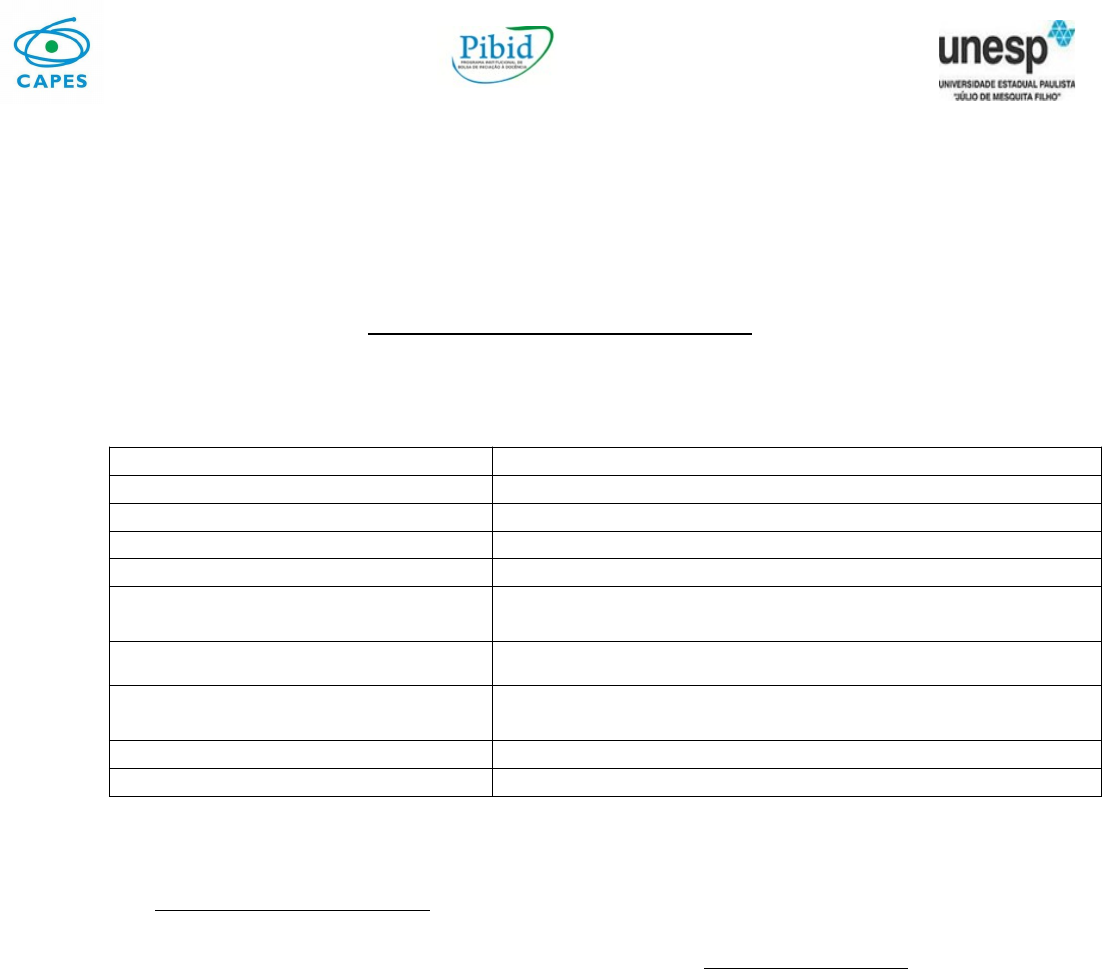 PROGRAMA INSTITUCIONAL DE BOLSAS DE INICIAÇÃO À DOCÊNCIA PIBID Relatório de Iniciação à Docência IDENTIFICAÇÃO: Nome do (a) Aluno (a) Giovanna dos Santos Azevedo CPF 492.598.548-57 E-mail do (a) residente g.azevedo@unesp.br IES UNESP – Universidade Estadual Paulista “Júlio de Mesquita Filho” Coordenador (a) de Área Silmar Antonio Travain Escola em que desenvolveu as atividades Colégio Técnico Industrial de Guaratinguetá Supervisor (a) Aguinaldo Valdecir dos Santos Séries/Anos/Etapas da Educação Básica que desenvolveu atividades 3°ano do Ensino Médio Data do desligamento Motivo do desligamento AUTORIZAÇÃO DE USO PELA CAPES: Eu, Giovanna dos Santos Azevedo (Nome do (a) aluno (a)), autorizo a utilização pela Capes, em todo ou em parte, do presente relato de experiência, na qualidade de discente de iniciação à docência, sob a responsabilidade do (a) Coordenador (a) de Área Silmar Antonio Travain vinculado (a) ao PIBID da Universidade Estadual Paulista “Júlio de Mesquita Filho”. Meu relatório poderá ser incluído nos bancos de dados e nas plataformas de gestão da Capes, podendo, eventualmente, ser reproduzido, publicado ou exibido por meio dos canais de divulgação e informação sob responsabilidade desse órgão. Data: _____/______/202___ Assinatura: ______________________________ Nome: __________________________________ Introdução Este relatório irá abordar todos os aspectos relacionados à Iniciação à Docência. Nesta seção, o (a) aluno (a) de iniciação à docência deve descrever como pretende apresentar este portifólio, evidenciando que se trata de um registro de sua experiência no subprojeto do Pibid e uma reflexão sobre sua prática ao longo do processo. Escola A escola escolhida para ser prestigiada com o programa PIBID foi o Colégio Técnico Industrial de Guaratinguetá "Prof. Carlos Augusto Patrício Amorim" (CTIG-UNESP), situado na cidade de Guaratinguetá - SP, e tendo suas dependências escolares dentro do campus da Faculdade de Engenharia e Ciências Exatas de Guaratinguetá (FEG/UNESP). O CTIG é um colégio de ensino médio e técnico, contendo os cursos de Mecânica, Eletroeletrônica, Eletrônica e Automação Industrial e dirigido pelo Prof. Thales Enrique Quiroz Tapioca. Suas atividades foram iniciadas em Março de 1971, durante o passar do tempo o colégio adaptou seu currículo escolar e os cursos oferecidos para adaptar-se à evolução da tecnologia e sociedade, acompanhando as revoluções industriais que são encaradas pelo mercado [SILVA]. “Com base na Lei nº 9394/96, da Lei de Diretrizes e Bases da Educação (LDB), o CTIG oferece, de forma articulada, uma educação fundamentada em um novo paradigma em que a variável flexibilidade permite não só um currículo que atenda às demandas sociais e tecnológicas atuais, como a possibilidade de construção de caminhos formativos individuais [CUNHA].” O colégio é composto por um corpo docente de 50 professores, dos quais 2 são professores de Física, 7 auxiliares de instrução e 1 orientador educacional, além de 5 escriturários e 3 atendentes de classe. Já o corpo discente da escola conta com 425 alunos [SILVA]. A fim de garantir que o objetivo da escola, ressaltado no excerto, os alunos contam com 12 salas de aula, 10 laboratórios, oficina de mecânica, biblioteca, anfiteatro e salas de projetos e desenho [SILVA]. Turma(s) Durante o período do programa, a vivência ocorreu em quatro turmas de terceiro ano do ensino médio, cada uma apresentando um perfil diferente, que puderem ser observados durante o programa. A turma do 3º ano A portava-se com mais leveza e informalidade durante as aulas, participando ativamente do momento, se dedicando às atividades e expressando suas dúvidas, no entanto, a turma nem sempre retornava desempenho satisfatório nas avaliações. Já a turma do 3º ano B não manifestava muito interesse pela área da Física, focando em exercer aquilo que lhe era exigido, mas não deixando de expor suas dúvidas quanto ao tema apresentado. As turmas 3ºs anos C e D possuíam comportamentos parecidos, sendo alunos de grande interesse pela matéria, que participavam ativamente no processo de aprendizagem e obtinham resultados satisfatórios nas avaliações. Devido à disposição demonstrada pelos alunos, a ambas as turmas eram ministradas aulas constituídas por tópicos que não constam no currículo comum, como aulas de quântica, voltadas para efeito fotoelétrico. Atividades • Atividade 01: Reuniões Semanais Reuniões semanais realizadas de forma presencial no campus da FEG/UNESP, geralmente às quinta-feiras, das 17h30 às 19h00 e durante todo o período do programa. As reuniões eram coordenadas pelo professor Silmar Antonio Travain, onde eram discutidas as atualizações e atividades do programa, bem como instruídos os próximos passos seguindo alinhamento com a coordenação do PIBID. • Atividade 02: Observações em sala de aula A residência em sala de aula sucedeu-se três dias na semana, acompanhando as quatro turmas de 3º ano do Ensino Médio, já previamente descritas, regidas pelo professor Aguinaldo e resultando em um total de 6 horas semanais. Durante esses momentos, a dupla sentava-se ao fundo da sala e observava como o professor conduzia sua aula, também as reações da turma e o modo como suas dúvidas e comentários eram tratados pelo docente. A fim de garantir transparência na assiduidade, os residentes assinavam, em todas as aulas que atendiam, o caderno do professor para que sua participação fosse monitorada. Além disso, as pibidianas sempre se disponibilizaram a dar um feedback ao professor Aguinaldo, quando requisitado pelo mesmo. • Atividade 03: Redação da aula de Espectrometria A aula de Espectrometria foi redigida durante a matéria de Introdução à Astronomia e seu Uso no Ensino e mais tarde adaptada para ser ministrada no CTIG. Essa aula busca levar aos alunos conhecimentos 