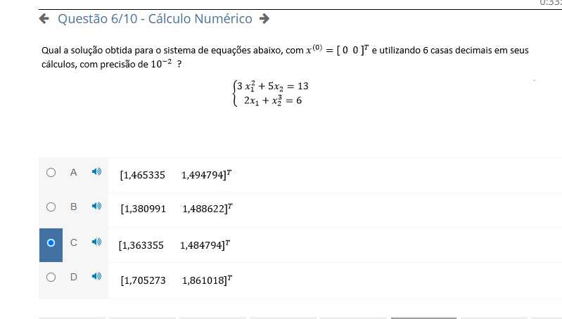 Questão 6/10 - Cálculo Numérico Qual a solução obtida para o sistema de equações abaixo, com =[00] e utilizando 6 casas decimais em seus cálculos, com precisão de 10-2 ? A [1,465335 1,494794] B [1,380991 1,488622] C [1,363355 1,484794] D [1,705273 1,861018]