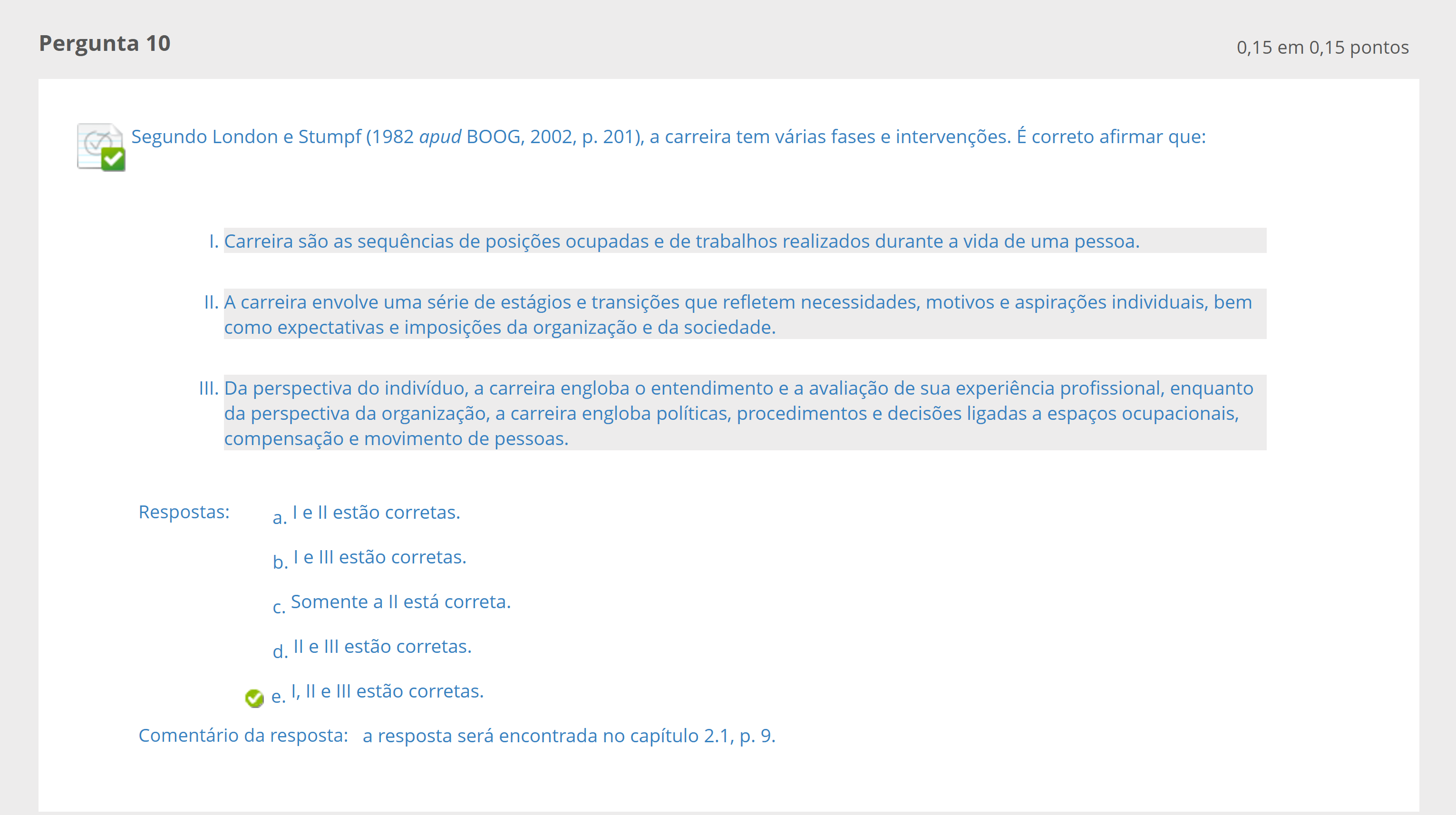 Pergunta 10 0,15 em 0,15 pontos Segundo London e Stumpf (1982 apud BOOG, 2002, p. 201), a carreira tem várias fases e intervenções. É correto afirmar que: I. Carreira são as sequências de posições ocupadas e de trabalhos realizados durante a vida de uma pessoa. II. A carreira envolve uma série de estágios e transições que refletem necessidades, motivos e aspirações individuais, bem como expectativas e imposições da organização e da sociedade. III. Da perspectiva do indivíduo, a carreira engloba entendimento e a avaliação de sua experiência profissional, enquanto da perspectiva da organização, a carreira engloba políticas, procedimentos e decisões ligadas a espaços ocupacionais, compensação e movimento de pessoas. Respostas: a. e estão corretas. b. e III estão corretas. C. Somente a está correta. d. e III estão corretas. e. I, e III estão corretas. Comentário da resposta: a resposta será encontrada no capítulo 2.1, p. 9.