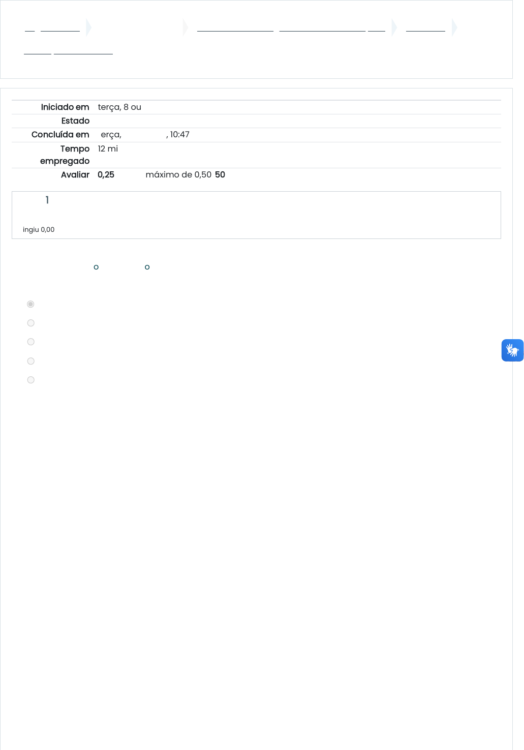 Página inicial Minhas disciplinas 2024/4 - Metodologia e Técnicas de Pesquisa UNIDADE I Avaliação - Unidade I Iniciado em terça, 8 out 2024, 10:35 Estado Finalizada Concluída em terça, 8 out 2024, 10:47 Tempo empregado 12 minutos 14 segundos Avaliar 0,25 de um máximo de 0,50(50%) Questão 1 Incorreto Atingiu 0,00 de 0,05 Queremos saber o motivo pelo qual determinados fatos estão ocorrendo, de forma lógica e racional, e estabelecemos a relação causal entre esses porquês. Estamos, respectivamente, nas fases de: a. Experimentação e Resultados. b. Problematização e Hipóteses. c. Observação e Hipóteses. d. Observação e Problematização. e. Hipóteses e Publicação. A resposta correta é: Problematização e Hipóteses. 26/11/2024, 20:02 Avaliação - Unidade I: Revisão da tentativa https://ambienteonline.uninga.br/mod/quiz/review.php?attempt=3194023&cmid=816815 1/6 https://ambienteonline.uninga.br/ https://ambienteonline.uninga.br/course/view.php?id=28899 https://ambienteonline.uninga.br/course/view.php?id=28899§ion=3 https://ambienteonline.uninga.br/mod/quiz/view.php?id=816815 Questão 2 Incorreto Atingiu 0,00 de 0,05 Questão 3 Incorreto Atingiu 0,00 de 0,05 Um acadêmico de Arquitetura, em fase de escolha do tema para seu trabalho de conclusão de curso, definiu como problema a seguinte pergunta: Como melhorar a questão das moradias na periferia no Sul do Brasil? Diante disso, possivelmente, seu orientador a. ficou entusiasmado, pois o resultado dessa questão seria benéfico a uma grande parcela da população. b. sugeriu que teorias fossem buscadas para o início da introdução do trabalho. c. ficou entusiasmado, pois uma boa pesquisa deve apontar uma forma eficiente de se resolver algo. d. sugeriu a troca da pergunta para: É correto que pessoas de baixa renda construam suas casas de forma irregular? e. sugeriu a troca do problema, por se tratar de um problema de engenharia visando dar respostas diretas ou soluções. A resposta correta é: sugeriu a troca do problema, por se tratar de um problema de engenharia visando dar respostas diretas ou soluções. Faz pesquisa quem consegue realizar estas ações, EXCETO: a. Discutir ideias e fatos relevantes de determinado assunto, partindo de uma fundamentação teórica, com certa utilidade para a ciência ou para a comunidade. b. Fornecer elementos que permitam verificar suas conclusões, documentando os dados, permitindo nítida identificação das fontes. c. Dizer algo que ainda não foi dito: um tema extraordinário, inédito, que não tenha sido trabalhado por ninguém na comunidade acadêmica. d. Comunicar os dados por dedução ou indução, redigindo um texto adequado às normas estabelecidas. e. Ter a capacidade de sistematizar e recriar o material coletado, indicando claramente os procedimentos realizados, relacionando-os sempre com a teoria utilizada. A resposta correta é: Dizer algo que ainda não foi dito: um tema extraordinário, inédito, que não tenha sido trabalhado por ninguém na comunidade acadêmica. 26/11/2024, 20:02 Avaliação - Unidade I: Revisão da tentativa https://ambienteonline.uninga.br/mod/quiz/review.php?attempt=3194023&cmid=816815 2/6 Questão 4 Incorreto Atingiu 0,00 de 0,05 Questão 5 Correto Atingiu 0,05 de 0,05 Lehfeld (2007), para definir a ciência, começa comparando-a com a arte. Assinale a alternativa que NÃO diz respeito a ambas. a. São discutíveis. b. Possuem uma subjetividade, controlada por uma lógica racional e metodológica. c. Projetam inovações e novos modos de compreender a realidade. d. Apresentam visões e concepções do homem e do mundo. e. Permitem apreender e explicar o ser. A resposta correta é: Possuem uma subjetividade, controlada por uma lógica racional e metodológica. Sobre a palavra conhecimento, assinale a alternativa INCORRETA. a. O termo deriva do latim, sendo composto de cune+noscere= cognoscere, significando “procurar saber”, “junto/com o saber”. b. O ato de conhecer possibilita a ação e o controle, realizados de forma autônoma. Podem ser divididos em: conhecimento popular, filosófico, científico e religioso. c. É uma ação natural que ocorre por meio da observação, assimilação de crenças religiosas, sentimentos, motivações, de modo dinâmico, sendo formal ou informal. d. O ato de conhecer possibilita a ação e o controle. É uma palavra plural, pois existem várias formas de conhecimento. Todavia, devido à particularidade de suas regras, um conhecimento impede a coexistência de outro. e. Devido à pluralidade do termo, é possível haver um cientista voltado ao estudo da física, que pode praticar determinada religião, estar filiado a um sistema filosófico e agir segundo conhecimentos provenientes do senso comum. A resposta correta é: O ato de conhecer possibilita a ação e o controle. É uma palavra plural, pois existem várias formas de conhecimento. Todavia, devido à particularidade de suas regras, um conhecimento impede a coexistência de outro. 26/11/2024, 20:02 Avaliação - Unidade I: Revisão da tentativa https://ambienteonline.uninga.br/mod/quiz/review.php?attempt=3194023&cmid=816815 3/6 Questão 6 Correto Atingiu 0,05 de 0,05 Questão 7 Correto Atingiu 0,05 de 0,05 A respeito da definição de pesquisa dada por Gil (2010), assinale a alternativa INCORRETA. a. Na realidade, a pesquisa desenvolve-se ao longo de um processo que envolve inúmeras fases, a se iniciar pela formulação do problema. b. A pesquisa é um procedimento racional e sistemático que tem como objetivo proporcionar respostas aos problemas, algo ruim que precisa ser consertado. c. A pesquisa é requerida quando a informação existente é insuficiente para responder ao problema, ou então quando a informação disponível se encontra desordenada para ser adequadamente relacionada ao problema. d. A pesquisa é desenvolvida mediante os conhecimentos disponíveis e a utilização cuidadosa de métodos e técnicas de investigação 