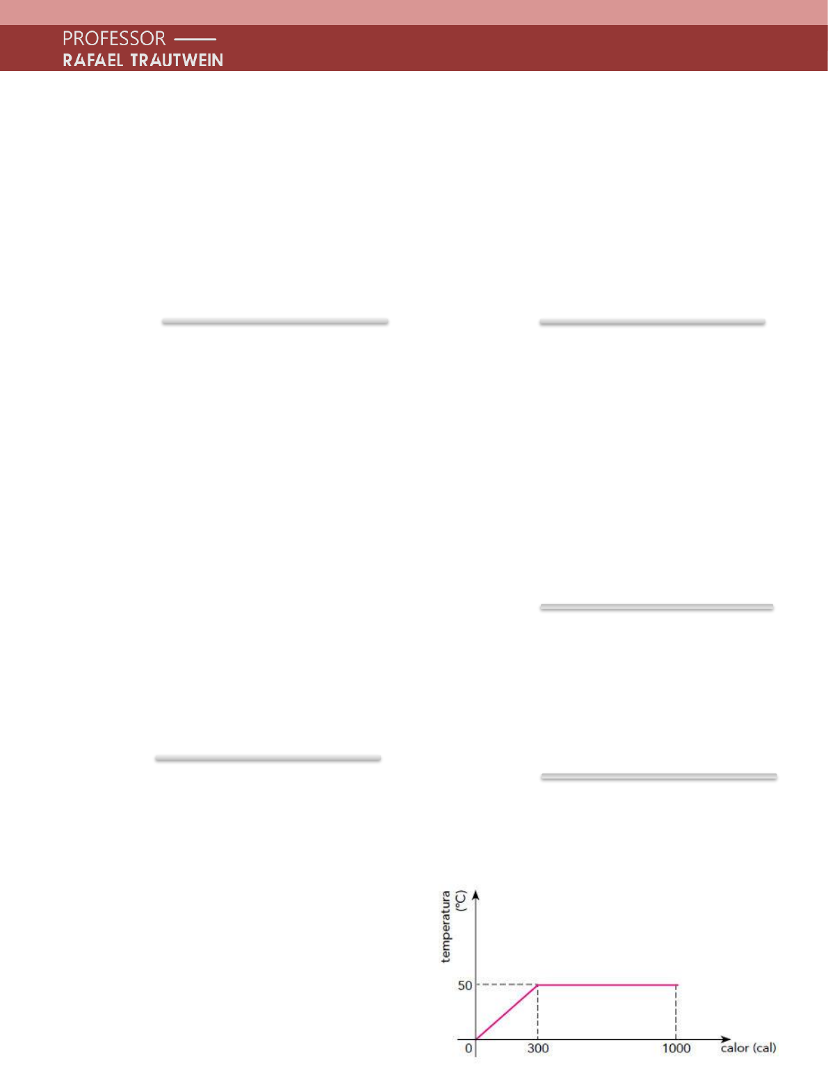 1 Lista de Calorimetria • Calor Sensível • Calor Latente • Princípio das Trocas de Calor Questão 01 Considere um recipiente de alumínio de massa 420g à temperatura de 20 ºC. Colocou-se certa massa de água a 80 ºC. Após certo tempo, a temperatura do conjunto atingiu o equilíbrio em 70 ºC. Considerando que a troca de calor ocorreu apenas entre a água e o recipiente, que não houve perda de calor para o ambiente e que os calores específicos do alumínio e da água sejam, respectivamente, iguais a 0,2 cal/g.ºC e 1,0 cal/g.ºC a quantidade de água colocada no recipiente foi: A) 220 g. B) 520 g. C) 330 g. D) 420 g. Questão 02 (UF - Paraná) Para aquecer 500 g de certa substância de 20 ºC para 70 ºC, foram necessárias 4 000 calorias. A capacidade térmica e o calor específico valem respectivamente: a) 8 cal/ ºC e 0,08 cal/g .ºC b) 80 cal/ ºC e 0,16 cal/g. ºC c) 90 cal/ ºC e 0,09 cal/g. ºC d) 95 cal/ ºC e 0,15 cal/g. ºC e) 120 cal/ ºC e 0,12 cal/g. ºC Questão 03 Em uma garrafa térmica são colocados 400 ml de café a 90 ºC. A garrafa térmica inicialmente estava a 30 ºC e o conjunto atinge equilíbrio térmico a 80 ºC. Determine a capacidade térmica dessa garrafa, considerando o calor específico e densidade do café iguais a 1,0 cal/g ºC e 1 g/ml, respectivamente. A) 70 cal/g ºC B) 80 cal/g ºC C) 90 cal/g ºC D) 30 cal/g ºC Questão 04 Um recipiente contém 800g de azeite (c = 0,5 cal/g.ºC) a 20ºC. Qual a temperatura deve ser colocado uma peça de aluminio (c = 0,22 cal/g.ºC) de 500g para que a temperatura final de equilíbrio seja igual a 25ºC (despreze a capacidade térmica do recipiente). Questão 05 (Uerj) O gráfico abaixo indica o comportamento térmico de 10 g de uma substância que, ao receber calor de uma fonte, passa integralmente da fase sólida para a fase líquida. 2 O calor latente de fusão dessa substância, em cal/g, é igual a: a) 70. b) 80. c) 90. d) 100. Questão 06 (IFPE/2015) Num caldeirão de ferro com 10kg de massa, inicialmente a 10ºC, são colocados 20kg de água também a 10ºC. O calor específico do ferro é 460 J/kgºC e o da água 4.200 J/kgoC. Uma fonte térmica deverá transmitir calor a esse caldeirão para aquecê- lo, juntamente com a água, até 100ºC. Considerando que todo o calor liberado pela fonte será absorvido apenas pelo caldeirão e pela água, qual será essa quantidade de calor, em kJ? A 3.420 B 4.140 C 7.560 D 7.974 E 8.000 Questão 07 Ao receber 250 kcal de calor, uma amostra de determinada substância sofre completa vaporização. Sabendo que a amostra tem 1 kg de massa, determine seu calor latente de vaporização em cal/g. Dado: 1 kcal = 1000 cal; 1 kg = 1000 g a) 200. b) 250. c) 1000. d) 2500. e) 500. Questão 08 (UNESP/2015) A energia contida nos alimentos Para determinar o valor energético de um alimento, podemos queimar certa quantidade desse produto e, com o calor liberado, aquecer determinada massa de água. Em seguida, mede-se a variação de temperatura sofrida pela água depois que todo o produto foi queimado, e determina- se a quantidade de energia liberada na queima do alimento. Essa é a energia que tal alimento nos fornece se for ingerido. No rótulo de um pacote de castanha-de- caju, está impressa a tabela a seguir, com informações nutricionais sobre o produto. (www.brcaju.com.br) Considere que 150 g de castanha tenham sido queimados e que determinada massa m de água, submetida à chama dessa combustão, tenha sido aquecida de 15 ºC para 87 ºC. Sabendo que o calor específico da água líquida é igual a 1 cal/(g · ºC) e que apenas 60% da energia liberada na combustão tenha efetivamente sido utilizada para aquecer a água, é correto afirmar que a massa m, em gramas, de água aquecida era igual a A 10 000. B 5 000. C 12 500. http://www.brcaju.com.br/ 3 D 7 500. E 2 500. Questão 09 10- (UERN/2015) Um corpo constituído por uma substância cujo calor específico é 0,25 cal/g°C absorve de uma fonte térmica 5.000 cal. Sendo a massa do corpo igual a 125 g e sua temperatura inicial de 20°C, então a temperatura atingida no final do aquecimento é de A 150°C. B 180°C. C 210°C. D 250°C. Questão 10 (CEFET MG/2015) Um material possui calor específico igual a 1,0 J/kg °C quando está no estado sólido e 2,5 J/kg °C quando está no estado líquido. Um sistema composto por 0,10 kg desse material recebe energia de forma que sua temperatura varia segundo o gráfico da figura. A razão entre Q1 e Q2 é A 1/3. B 1/5. C 1/6. D 1/8. E 1/16. Questão 11 (Mackenzie SP/2014) Uma panela de ferro de calor específico = 0,1 cal/(g.ºC) que está sobre um armário de 2,10 m de altura cai no piso da cozinha. Admitindo que toda a energia mecânica da panela tenha sido convertida em calor e que 80% dela foi absorvida pela panela, a sua elevação de temperatura será de Adote g = 10 m/s2 e 1 cal = 4,2 J A 0,04 ºC B 0,08 ºC C 0,12 ºC D 0,16 ºC E 0,20 ºC Questão 12 (FPS PE/2014). Uma amostra de 500 ml de água pura está inicialmente na temperatura normal do corpo humano (37ºC). Uma segunda amostra de água pura com volume 1litro e na temperatura 100ºC é adicionada à amostra inicial de água. Considerando que só ocorrem trocas térmicas entre as amostras de água, a temperatura final da mistura será: A 37º C B 73º C C 85º C D 67º C E 79º C 4 Gabarito Questão 01. D Questão 02. B Questão 03. B Questão 04. T = 43,18ºC Questão 05. A Questão 06. D Questão 07. B Questão 08. D Questão 09. D Questão 10. D Questão 11. Questão 12.