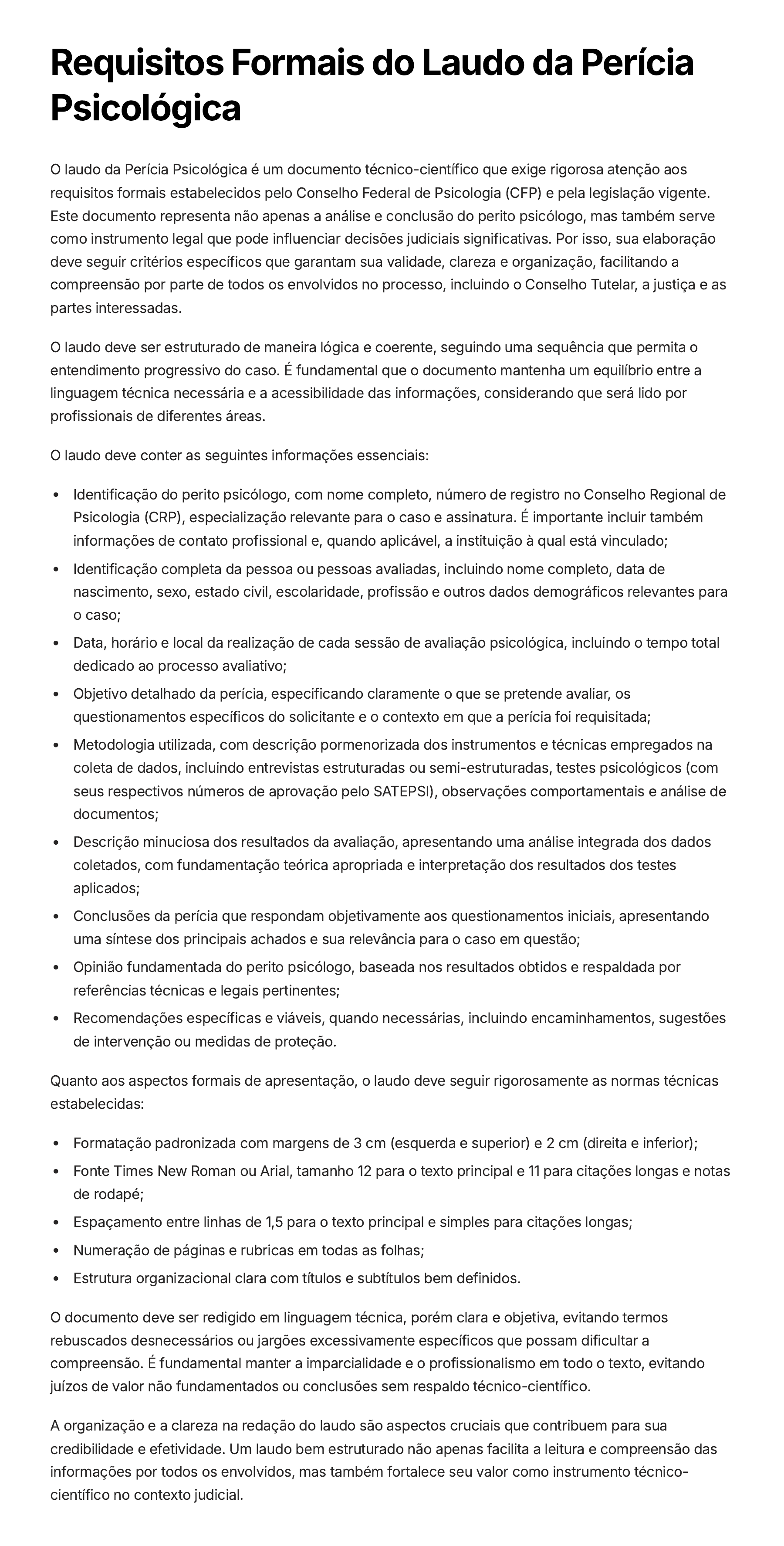 Requisitos Formais do Laudo da Perícia Psicológica O laudo da Perícia Psicológica é um documento técnico-científico que exige rigorosa atenção aos requisitos formais estabelecidos pelo Conselho Federal de Psicologia (CFP) e pela legislação vigente. Este documento representa não apenas a análise e conclusão do perito psicólogo, mas também serve como instrumento legal que pode influenciar decisões judiciais significativas. Por isso, sua elaboração deve seguir critérios específicos que garantam sua validade, clareza e organização, facilitando a compreensão por parte de todos os envolvidos no processo, incluindo o Conselho Tutelar, a justiça e as partes interessadas. O laudo deve ser estruturado de maneira lógica e coerente, seguindo uma sequência que permita o entendimento progressivo do caso. É fundamental que o documento mantenha um equilíbrio entre a linguagem técnica necessária e a acessibilidade das informações, considerando que será lido por profissionais de diferentes áreas. O laudo deve conter as seguintes informações essenciais: Identificação do perito psicólogo, com nome completo, número de registro no Conselho Regional de Psicologia (CRP), especialização relevante para o caso e assinatura. É importante incluir também informações de contato profissional e, quando aplicável, a instituição à qual está vinculado; Identificação completa da pessoa ou pessoas avaliadas, incluindo nome completo, data de nascimento, sexo, estado civil, escolaridade, profissão e outros dados demográficos relevantes para o caso; Data, horário e local da realização de cada sessão de avaliação psicológica, incluindo o tempo total dedicado ao processo avaliativo; Objetivo detalhado da perícia, especificando claramente o que se pretende avaliar, os questionamentos específicos do solicitante e o contexto em que a perícia foi requisitada; Metodologia utilizada, com descrição pormenorizada dos instrumentos e técnicas empregados na coleta de dados, incluindo entrevistas estruturadas ou semi-estruturadas, testes psicológicos (com seus respectivos números de aprovação pelo SATEPSI), observações comportamentais e análise de documentos; Descrição minuciosa dos resultados da avaliação, apresentando uma análise integrada dos dados coletados, com fundamentação teórica apropriada e interpretação dos resultados dos testes aplicados; Conclusões da perícia que respondam objetivamente aos questionamentos iniciais, apresentando uma síntese dos principais achados e sua relevância para o caso em questão; Opinião fundamentada do perito psicólogo, baseada nos resultados obtidos e respaldada por referências técnicas e legais pertinentes; Recomendações específicas e viáveis, quando necessárias, incluindo encaminhamentos, sugestões de intervenção ou medidas de proteção. Quanto aos aspectos formais de apresentação, o laudo deve seguir rigorosamente as normas técnicas estabelecidas: Formatação padronizada com margens de 3 cm (esquerda e superior) e 2 cm (direita e inferior); Fonte Times New Roman ou Arial, tamanho 12 para o texto principal e 11 para citações longas e notas de rodapé; Espaçamento entre linhas de 1,5 para o texto principal e simples para citações longas; Numeração de páginas e rubricas em todas as folhas; Estrutura organizacional clara com títulos e subtítulos bem definidos. O documento deve ser redigido em linguagem técnica, porém clara e objetiva, evitando termos rebuscados desnecessários ou jargões excessivamente específicos que possam dificultar a compreensão. É fundamental manter a imparcialidade e o profissionalismo em todo o texto, evitando juízos de valor não fundamentados ou conclusões sem respaldo técnico-científico. A organização e a clareza na redação do laudo são aspectos cruciais que contribuem para sua credibilidade e efetividade. Um laudo bem estruturado não apenas facilita a leitura e compreensão das informações por todos os envolvidos, mas também fortalece seu valor como instrumento técnico- científico no contexto judicial.