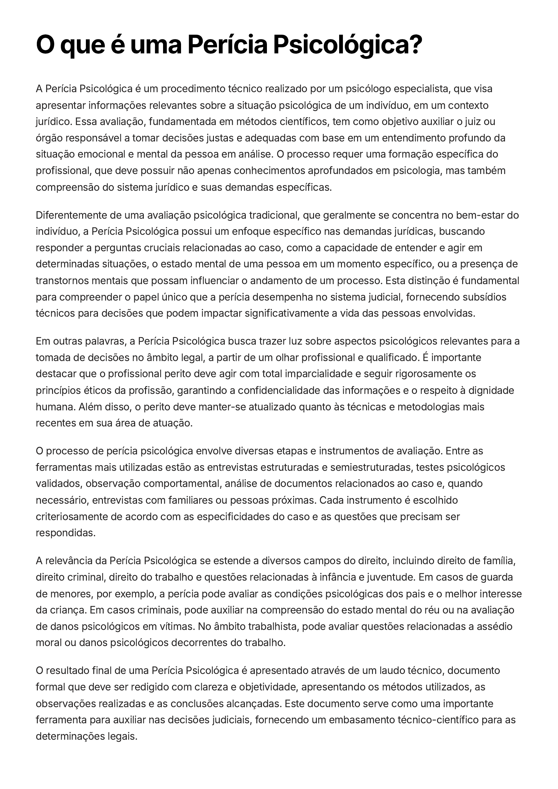 O que é uma Perícia Psicológica? A Perícia Psicológica é um procedimento técnico realizado por um psicólogo especialista, que visa apresentar informações relevantes sobre a situação psicológica de um indivíduo, em um contexto jurídico. Essa avaliação, fundamentada em métodos científicos, tem como objetivo auxiliar o juiz ou órgão responsável a tomar decisões justas e adequadas com base em um entendimento profundo da situação emocional e mental da pessoa em análise. O processo requer uma formação específica do profissional, que deve possuir não apenas conhecimentos aprofundados em psicologia, mas também compreensão do sistema jurídico e suas demandas específicas. Diferentemente de uma avaliação psicológica tradicional, que geralmente se concentra no bem-estar do indivíduo, a Perícia Psicológica possui um enfoque específico nas demandas jurídicas, buscando responder a perguntas cruciais relacionadas ao caso, como a capacidade de entender e agir em determinadas situações, o estado mental de uma pessoa em um momento específico, ou a presença de transtornos mentais que possam influenciar o andamento de um processo. Esta distinção é fundamental para compreender o papel único que a perícia desempenha no sistema judicial, fornecendo subsídios técnicos para decisões que podem impactar significativamente a vida das pessoas envolvidas. Em outras palavras, a Perícia Psicológica busca trazer luz sobre aspectos psicológicos relevantes para a tomada de decisões no âmbito legal, a partir de um olhar profissional e qualificado. É importante destacar que o profissional perito deve agir com total imparcialidade e seguir rigorosamente os princípios éticos da profissão, garantindo a confidencialidade das informações e o respeito à dignidade humana. Além disso, o perito deve manter-se atualizado quanto às técnicas e metodologias mais recentes em sua área de atuação. O processo de perícia psicológica envolve diversas etapas e instrumentos de avaliação. Entre as ferramentas mais utilizadas estão as entrevistas estruturadas e semiestruturadas, testes psicológicos validados, observação comportamental, análise de documentos relacionados ao caso e, quando necessário, entrevistas com familiares ou pessoas próximas. Cada instrumento é escolhido criteriosamente de acordo com as especificidades do caso e as questões que precisam ser respondidas. A relevância da Perícia Psicológica se estende a diversos campos do direito, incluindo direito de família, direito criminal, direito do trabalho e questões relacionadas à infância e juventude. Em casos de guarda de menores, por exemplo, a perícia pode avaliar as condições psicológicas dos pais e o melhor interesse da criança. Em casos criminais, pode auxiliar na compreensão do estado mental do réu ou na avaliação de danos psicológicos em vítimas. No âmbito trabalhista, pode avaliar questões relacionadas a assédio moral ou danos psicológicos decorrentes do trabalho. O resultado final de uma Perícia Psicológica é apresentado através de um laudo técnico, documento formal que deve ser redigido com clareza e objetividade, apresentando os métodos utilizados, as observações realizadas e as conclusões alcançadas. Este documento serve como uma importante ferramenta para auxiliar nas decisões judiciais, fornecendo um embasamento técnico-científico para as determinações legais.