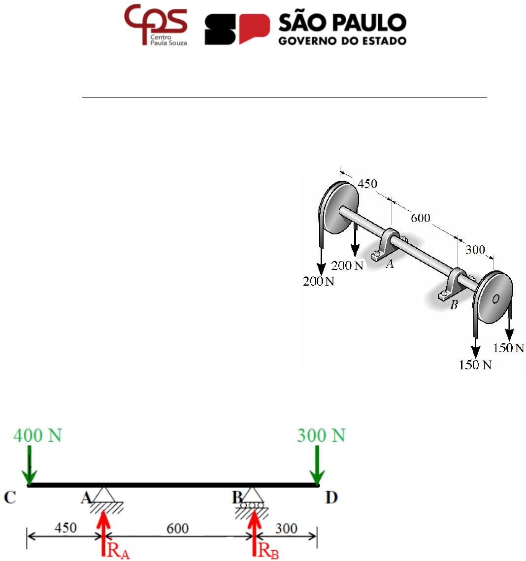 TÉCNICO EM MECÂNICA – RESISTENCIA DOS MATERIAIS NOME: NOTA MÓDULO: 2º DATA: 08 / 10 / 2024 PROF.: VENÂNCIO 6.2 O eixo, mostrado na figura, está submetido às cargas provocadas pelas correias que passam sobre as duas polias nas extremidades. Se os mancais A e B exercem apenas reações verticais sobre o eixo, a tensão limite de escoamento do material do eixo é e = 340 Mpa e o fator de segurança para o projeto é N = 5, então determine: a. as reações nos pontos A e B; b. desenhar os diagramas de esforço cortante e momento fletor; c. determinar o momento fletor máximo; d. determinar o módulo de resistência à flexão; e. o diâmetro do eixo maciço; f. a dimensão do eixo quadrado; g. as dimensões de uma barra retangular para suportar a mesma carga, onde h = 3xb.