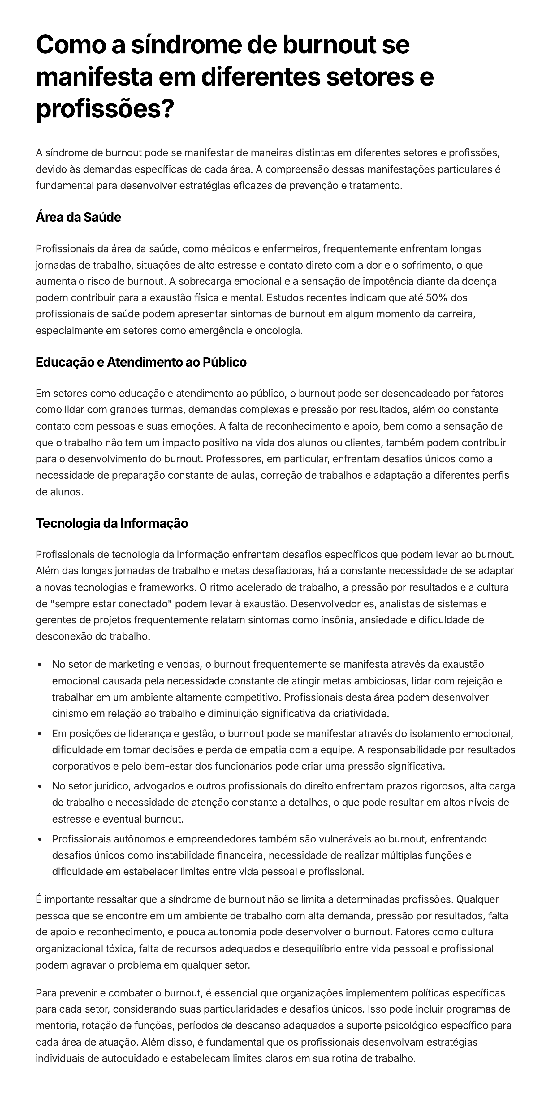 Como a síndrome de burnout se manifesta em diferentes setores e profissões? A síndrome de burnout pode se manifestar de maneiras distintas em diferentes setores e profissões, devido às demandas específicas de cada área. A compreensão dessas manifestações particulares é fundamental para desenvolver estratégias eficazes de prevenção e tratamento. Área da Saúde Profissionais da área da saúde, como médicos e enfermeiros, frequentemente enfrentam longas jornadas de trabalho, situações de alto estresse e contato direto com a dor e o sofrimento, o que aumenta o risco de burnout. A sobrecarga emocional e a sensação de impotência diante da doença podem contribuir para a exaustão física e mental. Estudos recentes indicam que até 50% dos profissionais de saúde podem apresentar sintomas de burnout em algum momento da carreira, especialmente em setores como emergência e oncologia. Educação e Atendimento ao Público Em setores como educação e atendimento ao público, o burnout pode ser desencadeado por fatores como lidar com grandes turmas, demandas complexas e pressão por resultados, além do constante contato com pessoas e suas emoções. A falta de reconhecimento e apoio, bem como a sensação de que o trabalho não tem um impacto positivo na vida dos alunos ou clientes, também podem contribuir para o desenvolvimento do burnout. Professores, em particular, enfrentam desafios únicos como a necessidade de preparação constante de aulas, correção de trabalhos e adaptação a diferentes perfis de alunos. Tecnologia da Informação Profissionais de tecnologia da informação enfrentam desafios específicos que podem levar ao burnout. Além das longas jornadas de trabalho e metas desafiadoras, há a constante necessidade de se adaptar a novas tecnologias e frameworks. O ritmo acelerado de trabalho, a pressão por resultados e a cultura de "sempre estar conectado" podem levar à exaustão. Desenvolvedor es, analistas de sistemas e gerentes de projetos frequentemente relatam sintomas como insônia, ansiedade e dificuldade de desconexão do trabalho. No setor de marketing e vendas, o burnout frequentemente se manifesta através da exaustão emocional causada pela necessidade constante de atingir metas ambiciosas, lidar com rejeição e trabalhar em um ambiente altamente competitivo. Profissionais desta área podem desenvolver cinismo em relação ao trabalho e diminuição significativa da criatividade. Em posições de liderança e gestão, o burnout pode se manifestar através do isolamento emocional, dificuldade em tomar decisões e perda de empatia com a equipe. A responsabilidade por resultados corporativos e pelo bem-estar dos funcionários pode criar uma pressão significativa. No setor jurídico, advogados e outros profissionais do direito enfrentam prazos rigorosos, alta carga de trabalho e necessidade de atenção constante a detalhes, o que pode resultar em altos níveis de estresse e eventual burnout. Profissionais autônomos e empreendedores também são vulneráveis ao burnout, enfrentando desafios únicos como instabilidade financeira, necessidade de realizar múltiplas funções e dificuldade em estabelecer limites entre vida pessoal e profissional. É importante ressaltar que a síndrome de burnout não se limita a determinadas profissões. Qualquer pessoa que se encontre em um ambiente de trabalho com alta demanda, pressão por resultados, falta de apoio e reconhecimento, e pouca autonomia pode desenvolver o burnout. Fatores como cultura organizacional tóxica, falta de recursos adequados e desequilíbrio entre vida pessoal e profissional podem agravar o problema em qualquer setor. Para prevenir e combater o burnout, é essencial que organizações implementem políticas específicas para cada setor, considerando suas particularidades e desafios únicos. Isso pode incluir programas de mentoria, rotação de funções, períodos de descanso adequados e suporte psicológico específico para cada área de atuação. Além disso, é fundamental que os profissionais desenvolvam estratégias individuais de autocuidado e estabelecam limites claros em sua rotina de trabalho.