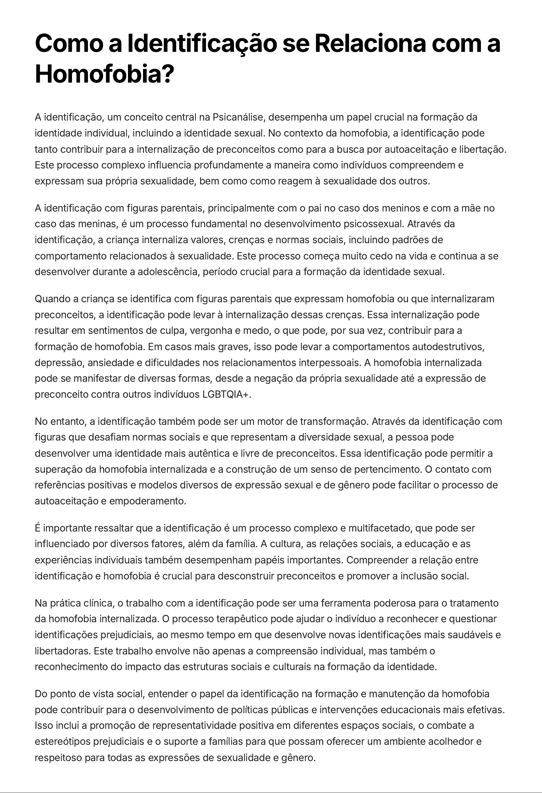 Como a Identificação se Relaciona com a Homofobia? A identificação, um conceito central na Psicanálise, desempenha um papel crucial na formação da identidade individual, incluindo a identidade sexual. No contexto da homofobia, a identificação pode tanto contribuir para a internalização de preconceitos como para a busca por autoaceitação e libertação. Este processo complexo influencia profundamente a maneira como indivíduos compreendem e expressam sua própria sexualidade, bem como como reagem à sexualidade dos outros. A identificação com figuras parentais, principalmente com o pai no caso dos meninos e com a mãe no caso das meninas, é um processo fundamental no desenvolvimento psicossexual. Através da identificação, a criança internaliza valores, crenças e normas sociais, incluindo padrões de comportamento relacionados à sexualidade. Este processo começa muito cedo na vida e continua a se desenvolver durante a adolescência, período crucial para a formação da identidade sexual. Quando a criança se identifica com figuras parentais que expressam homofobia ou que internalizaram preconceitos, a identificação pode levar à internalização dessas crenças. Essa internalização pode resultar em sentimentos de culpa, vergonha e medo, o que pode, por sua vez, contribuir para a formação de homofobia. Em casos mais graves, isso pode levar a comportamentos autodestrutivos, depressão, ansiedade e dificuldades nos relacionamentos interpessoais. A homofobia internalizada pode se manifestar de diversas formas, desde a negação da própria sexualidade até a expressão de preconceito contra outros indivíduos LGBTQIA+. No entanto, a identificação também pode ser um motor de transformação. Através da identificação com figuras que desafiam normas sociais e que representam a diversidade sexual, a pessoa pode desenvolver uma identidade mais autêntica e livre de preconceitos. Essa identificação pode permitir a superação da homofobia internalizada e a construção de um senso de pertencimento. O contato com referências positivas e modelos diversos de expressão sexual e de gênero pode facilitar o processo de autoaceitação e empoderamento. É importante ressaltar que a identificação é um processo complexo e multifacetado, que pode ser influenciado por diversos fatores, além da família. A cultura, as relações sociais, a educação e as experiências individuais também desempenham papéis importantes. Compreender a relação entre identificação e homofobia é crucial para desconstruir preconceitos e promover a inclusão social. Na prática clínica, o trabalho com a identificação pode ser uma ferramenta poderosa para o tratamento da homofobia internalizada. O processo terapêutico pode ajudar o indivíduo a reconhecer e questionar identificações prejudiciais, ao mesmo tempo em que desenvolve novas identificações mais saudáveis e libertadoras. Este trabalho envolve não apenas a compreensão individual, mas também o reconhecimento do impacto das estruturas sociais e culturais na formação da identidade. Do ponto de vista social, entender o papel da identificação na formação e manutenção da homofobia pode contribuir para o desenvolvimento de políticas públicas e intervenções educacionais mais efetivas. Isso inclui a promoção de representatividade positiva em diferentes espaços sociais, o combate a estereótipos prejudiciais e o suporte a famílias para que possam oferecer um ambiente acolhedor e respeitoso para todas as expressões de sexualidade e gênero.