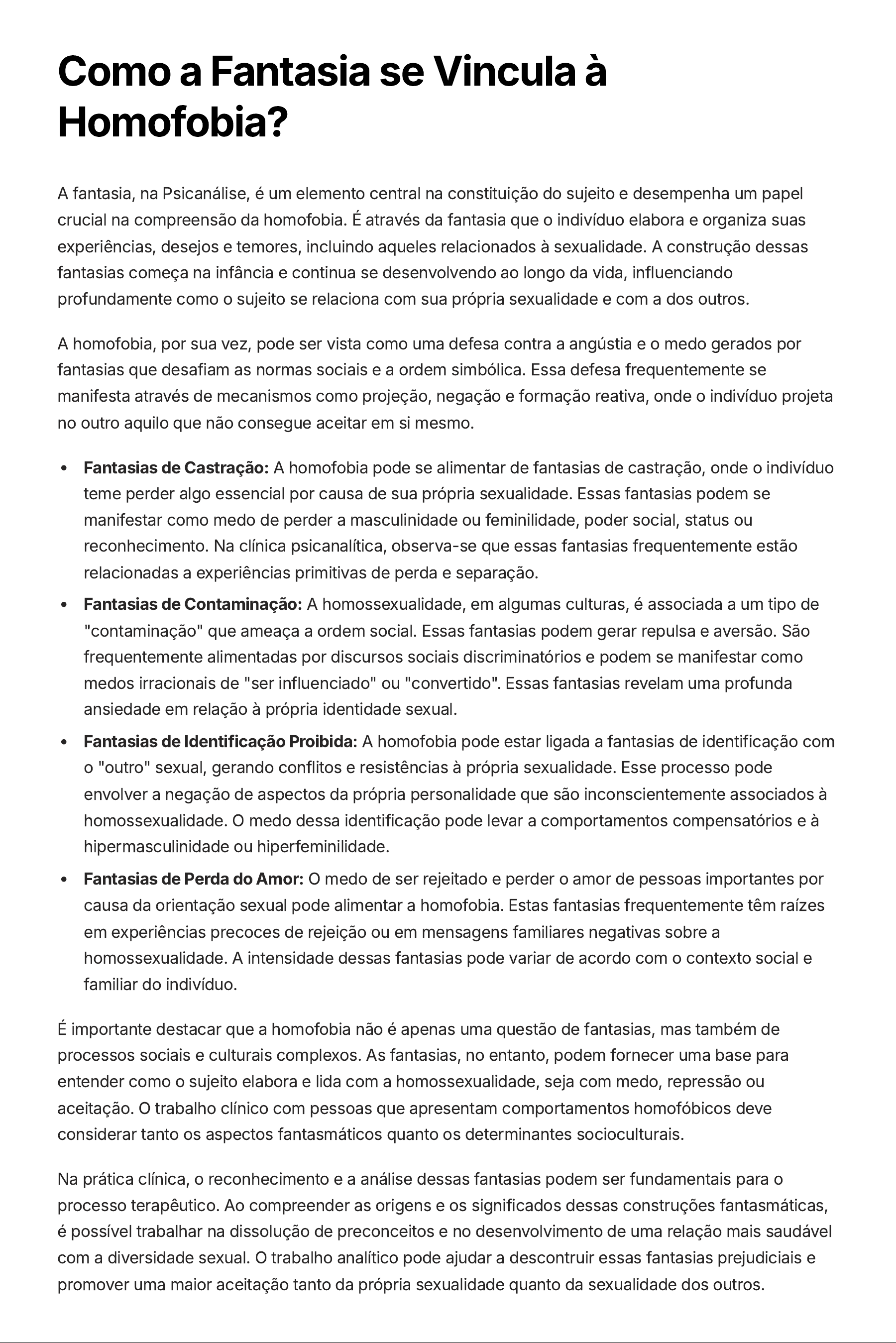 Como a Fantasia se Vincula à Homofobia? A fantasia, na Psicanálise, é um elemento central na constituição do sujeito e desempenha um papel crucial na compreensão da homofobia. É através da fantasia que o indivíduo elabora e organiza suas experiências, desejos e temores, incluindo aqueles relacionados à sexualidade. A construção dessas fantasias começa na infância e continua se desenvolvendo ao longo da vida, influenciando profundamente como o sujeito se relaciona com sua própria sexualidade e com a dos outros. A homofobia, por sua vez, pode ser vista como uma defesa contra a angústia e o medo gerados por fantasias que desafiam as normas sociais e a ordem simbólica. Essa defesa frequentemente se manifesta através de mecanismos como projeção, negação e formação reativa, onde o indivíduo projeta no outro aquilo que não consegue aceitar em si mesmo. Fantasias de Castração: A homofobia pode se alimentar de fantasias de castração, onde o indivíduo teme perder algo essencial por causa de sua própria sexualidade. Essas fantasias podem se manifestar como medo de perder a masculinidade ou feminilidade, poder social, status ou reconhecimento. Na clínica psicanalítica, observa-se que essas fantasias frequentemente estão relacionadas a experiências primitivas de perda e separação. Fantasias de Contaminação: A homossexualidade, em algumas culturas, é associada a um tipo de "contaminação" que ameaça a ordem social. Essas fantasias podem gerar repulsa e aversão. São frequentemente alimentadas por discursos sociais discriminatórios e podem se manifestar como medos irracionais de "ser influenciado" ou "convertido". Essas fantasias revelam uma profunda ansiedade em relação à própria identidade sexual. Fantasias de Identificação Proibida: A homofobia pode estar ligada a fantasias de identificação com o "outro" sexual, gerando conflitos e resistências à própria sexualidade. Esse processo pode envolver a negação de aspectos da própria personalidade que são inconscientemente associados à homossexualidade. O medo dessa identificação pode levar a comportamentos compensatórios e à hipermasculinidade ou hiperfeminilidade. Fantasias de Perda do Amor: O medo de ser rejeitado e perder o amor de pessoas importantes por causa da orientação sexual pode alimentar a homofobia. Estas fantasias frequentemente têm raízes em experiências precoces de rejeição ou em mensagens familiares negativas sobre a homossexualidade. A intensidade dessas fantasias pode variar de acordo com o contexto social e familiar do indivíduo. É importante destacar que a homofobia não é apenas uma questão de fantasias, mas também de processos sociais e culturais complexos. As fantasias, no entanto, podem fornecer uma base para entender como o sujeito elabora e lida com a homossexualidade, seja com medo, repressão ou aceitação. O trabalho clínico com pessoas que apresentam comportamentos homofóbicos deve considerar tanto os aspectos fantasmáticos quanto os determinantes socioculturais. Na prática clínica, o reconhecimento e a análise dessas fantasias podem ser fundamentais para o processo terapêutico. Ao compreender as origens e os significados dessas construções fantasmáticas, é possível trabalhar na dissolução de preconceitos e no desenvolvimento de uma relação mais saudável com a diversidade sexual. O trabalho analítico pode ajudar a descontruir essas fantasias prejudiciais e promover uma maior aceitação tanto da própria sexualidade quanto da sexualidade dos outros.