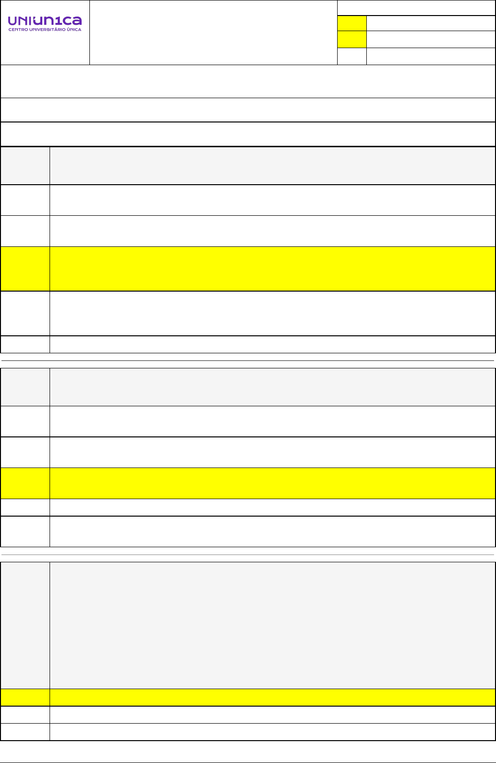 Pincel Atômico - 22/11/2024 21:15:08 1/3 GABRIELA ROCHA LIMA Exercício Caminho do Conhecimento - Etapa 10 (23077) Atividade finalizada em 06/11/2024 09:07:48 (2972255 / 1) LEGENDA Resposta correta na questão # Resposta correta - Questão Anulada X Resposta selecionada pelo Aluno Disciplina: BASE NACIONAL COMUM CURRICULAR(BNCC): HISTÓRIA, CONCEPÇÃO, POLÍTICA E REFERENCIAIS PEDAGÓGICOS [1289365] - Avaliação com 8 questões, com o peso total de 3,33 pontos [capítulos - 5] Turma: Segunda Graduação: Segunda Graduação 6 meses - Licenciatura em História - Grupo: FPD-AGO/2024 - SGegu0A300824 [141563] Aluno(a): 91668926 - GABRIELA ROCHA LIMA - Respondeu 8 questões corretas, obtendo um total de 3,33 pontos como nota [359879_1522 59] Questão 001 Sobre as Diretrizes Curriculares Nacionais - DCNs, assinale a alternativa correta. As DCNs têm como propósito orientar a flexibilização, e o desempenho dos alunos e de todo o sistema de ensino brasileiro. As DCNs apresentam diretrizes curriculares com uma base nacional comum a alguns estados e regiões. X A DCNs apresentam diretrizes curriculares com uma base nacional comum, com o propósito de orientar a organização, a articulação, o desenvolvimento e a avaliação das propostas pedagógicas de todo o sistema de ensino brasileiro. As DCNs buscam auxiliar os professores e gestores educacionais socializando questões que buscam a potencialização da aprendizagem e de forma ampla, a melhoria da educação escolar. As DCNs apresentam propostas baseadas na BNCC para o Ensino Médio. [359879_1527 96] Questão 002 O Estatuto da Criança e do Adolescente – ECA, tem como objetivo fundamental: Contribuir na resolução de problemas de todas as famílias que passam por dificuldades com crianças e adolescentes. Promover a educação especial e continuada para crianças e adolescentes para que elas sejam inseridas no mercado de trabalho. X Tratar de assuntos relacionados aos direitos e segurança da criança e adolescente diante do ambiente familiar e convívio social. Colaborar com a elaboração do currículo escolar das crianças e adolescentes. Educar e orientar as crianças e adolescentes tornando-as aptas para a convivência no meio escolar, social e mercado de trabalho. [359881_1522 73] Questão 003 Considerando esse contexto, avalie as seguintes asserções e a relação proposta entre elas. I. O Estatuto da Criança e do Adolescente – ECA, que foi criado em 1990, por meio da Lei nº 8.069 em de 13 de julho e “dispõe sobre a proteção integral ao idoso e ao adolescente” (art. 1º ECA, 1990). PORQUE II. no ECA, considera-se crianças: as pessoas com idade de até 15 anos incompletos e adolescentes: as pessoas com idades entre 15 e 25 anos. A respeito dessas asserções, assinale a opção correta. X As asserções I e II são proposições falsas. As asserções I e II são proposições verdadeiras, mas a II não é uma justificativa da I. As asserções I e II são proposições verdadeiras, e a II é uma justificativa da I. Pincel Atômico - 22/11/2024 21:15:08 2/3 A asserção I é uma proposição falsa, e a II é uma proposição verdadeira. A asserção I é uma proposição verdadeira, e a II é uma proposição falsa. [359879_1527 91] Questão 004 Analise as afirmativas a seguir e aponte qual delas expressa uma definição crítica em relação a Base Nacional Comum Curricular (BNCC): Trata-se de uma proposta nacional que auxilia o professor na sua prática pedagógica, na elaboração das avaliações e no desenvolvimento cultural e científico da comunidade escolar. Trata-se de uma padronização dos conteúdos curriculares da educação básica. Trata-se de uma proposta de organização da educação básica, já que a mesma não conta com nenhuma diretriz que oriente as escolas para a elaboração de seus currículos e práticas educativas. X Trata-se de documento norteador para a elaboração dos currículos da educação básica, tanto para as instituições públicas quanto para as instituições privadas de todo o território nacional. Trata-se de uma proposta de elaboração de currículo de toda a rede pública do ensino na educação básica, para que a educação escolar tenha a mesma qualidade em todo o país [359880_1522 65] Questão 005 Sobre o Plano Nacional de Educação – PNE, está CORRETO apenas o que se afirma em: I. O PNE foi promulgado através da Lei n° 13005/2014 e determina estratégias e diretrizes para as políticas educacionais no decênio 2014 – 2024. II. O PNE traz essencialmente vinte metas previstas para serem executadas no período de vigência do documento (2014 - 2024). III. O PNE apresenta diretrizes curriculares com uma base nacional comum, com o propósito de orientar a organização, a articulação, o desenvolvimento e a avaliação das propostas pedagógicas de todo o sistema de ensino brasileiro. X I e II. I. III. I e III. II [359879_1522 55] Questão 006 Sobre os Parâmetros Curriculares Nacionais – PCNs, assinale a alternativa correta. Os PCNs buscam auxiliar os alunos socializando questões que buscam a potencialização da aprendizagem e de forma ampla, a melhoria da educação escolar. Os PCNs buscam auxiliar as famílias socializando questões que buscam a potencialização da aprendizagem e de forma ampla, a melhoria da educação escolar. É um documento referencial, criado em 1997, que orienta as decisões relacionadas à elaboração dos currículos regionais para a educação no Ensino Infantil. Os documentos referentes aos PCNs são divididos em volumes para facilitar o desenvolvimento dos trabalhos dos coordenadores pedagógicos e diretores de escolas que os utilizam e abordam as áreas de conhecimento da tecnologia. X É um documento referencial, criado em 1997, que orienta as decisões relacionadas à elaboração dos currículos regionais para a educação no Ensino Fundamental. Pincel Atômico - 22/11/2024 21:15:08 3/3 [359879_1527 89] Questão 007 (