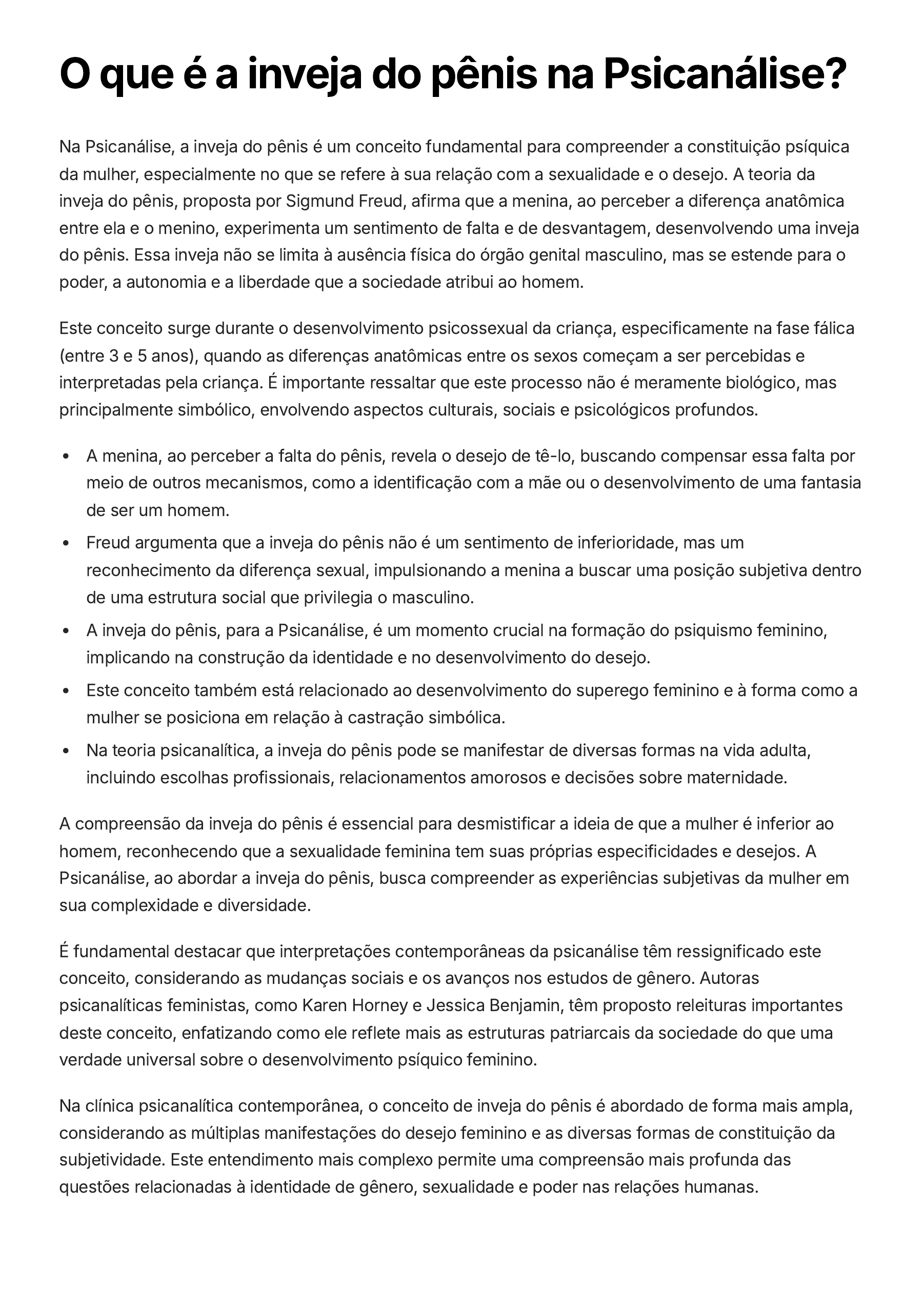 O que é a inveja do pênis na Psicanálise? Na Psicanálise, a inveja do pênis é um conceito fundamental para compreender a constituição psíquica da mulher, especialmente no que se refere à sua relação com a sexualidade e o desejo. A teoria da inveja do pênis, proposta por Sigmund Freud, afirma que a menina, ao perceber a diferença anatômica entre ela e o menino, experimenta um sentimento de falta e de desvantagem, desenvolvendo uma inveja do pênis. Essa inveja não se limita à ausência física do órgão genital masculino, mas se estende para o poder, a autonomia e a liberdade que a sociedade atribui ao homem. Este conceito surge durante o desenvolvimento psicossexual da criança, especificamente na fase fálica (entre 3 e 5 anos), quando as diferenças anatômicas entre os sexos começam a ser percebidas e interpretadas pela criança. É importante ressaltar que este processo não é meramente biológico, mas principalmente simbólico, envolvendo aspectos culturais, sociais e psicológicos profundos. A menina, ao perceber a falta do pênis, revela o desejo de tê-lo, buscando compensar essa falta por meio de outros mecanismos, como a identificação com a mãe ou o desenvolvimento de uma fantasia de ser um homem. Freud argumenta que a inveja do pênis não é um sentimento de inferioridade, mas um reconhecimento da diferença sexual, impulsionando a menina a buscar uma posição subjetiva dentro de uma estrutura social que privilegia o masculino. A inveja do pênis, para a Psicanálise, é um momento crucial na formação do psiquismo feminino, implicando na construção da identidade e no desenvolvimento do desejo. Este conceito também está relacionado ao desenvolvimento do superego feminino e à forma como a mulher se posiciona em relação à castração simbólica. Na teoria psicanalítica, a inveja do pênis pode se manifestar de diversas formas na vida adulta, incluindo escolhas profissionais, relacionamentos amorosos e decisões sobre maternidade. A compreensão da inveja do pênis é essencial para desmistificar a ideia de que a mulher é inferior ao homem, reconhecendo que a sexualidade feminina tem suas próprias especificidades e desejos. A Psicanálise, ao abordar a inveja do pênis, busca compreender as experiências subjetivas da mulher em sua complexidade e diversidade. É fundamental destacar que interpretações contemporâneas da psicanálise têm ressignificado este conceito, considerando as mudanças sociais e os avanços nos estudos de gênero. Autoras psicanalíticas feministas, como Karen Horney e Jessica Benjamin, têm proposto releituras importantes deste conceito, enfatizando como ele reflete mais as estruturas patriarcais da sociedade do que uma verdade universal sobre o desenvolvimento psíquico feminino. Na clínica psicanalítica contemporânea, o conceito de inveja do pênis é abordado de forma mais ampla, considerando as múltiplas manifestações do desejo feminino e as diversas formas de constituição da subjetividade. Este entendimento mais complexo permite uma compreensão mais profunda das questões relacionadas à identidade de gênero, sexualidade e poder nas relações humanas.