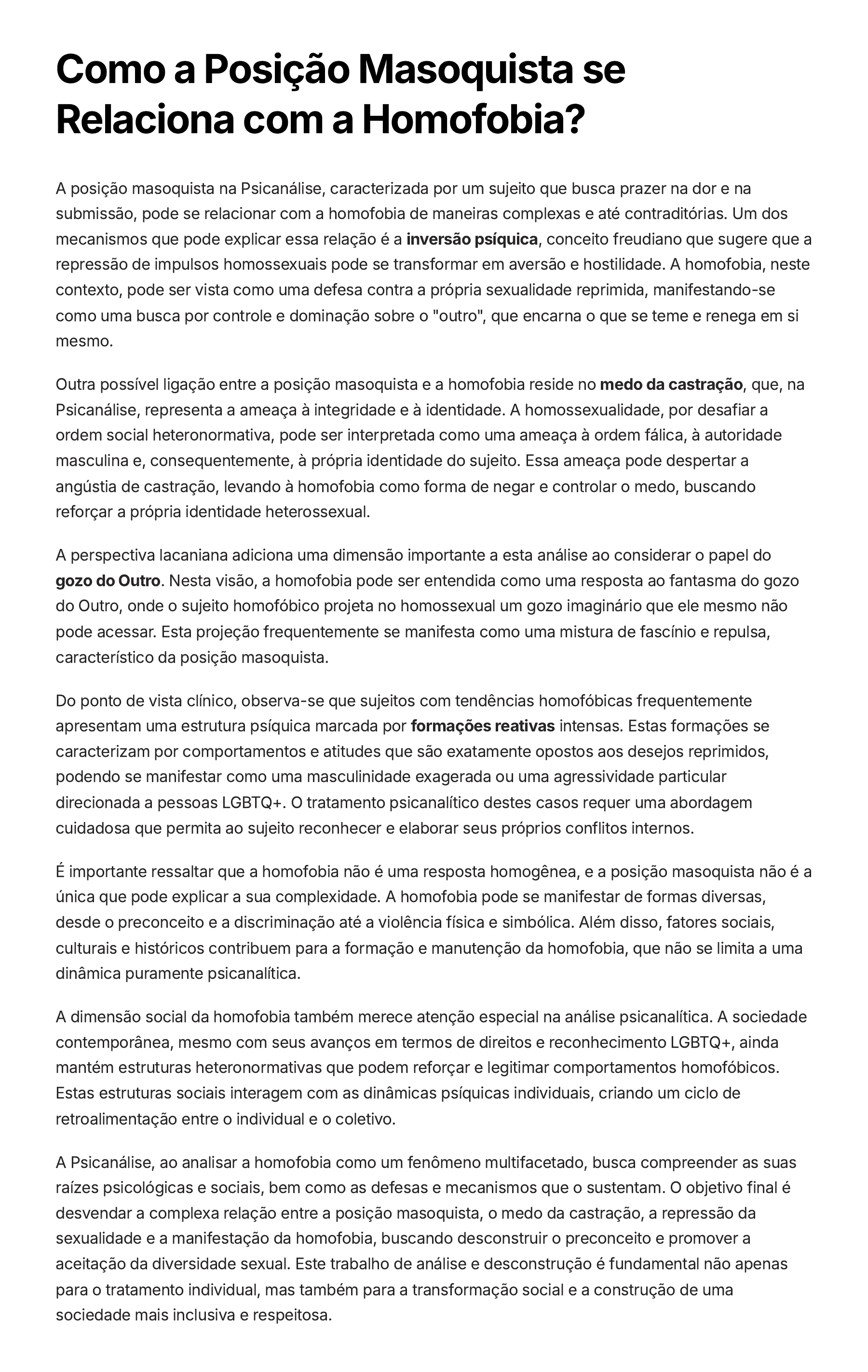 Como a Posição Masoquista se Relaciona com a Homofobia? A posição masoquista na Psicanálise, caracterizada por um sujeito que busca prazer na dor e na submissão, pode se relacionar com a homofobia de maneiras complexas e até contraditórias. Um dos mecanismos que pode explicar essa relação é a inversão psíquica, conceito freudiano que sugere que a repressão de impulsos homossexuais pode se transformar em aversão e hostilidade. A homofobia, neste contexto, pode ser vista como uma defesa contra a própria sexualidade reprimida, manifestando-se como uma busca por controle e dominação sobre o "outro", que encarna o que se teme e renega em si mesmo. Outra possível ligação entre a posição masoquista e a homofobia reside no medo da castração, que, na Psicanálise, representa a ameaça à integridade e à identidade. A homossexualidade, por desafiar a ordem social heteronormativa, pode ser interpretada como uma ameaça à ordem fálica, à autoridade masculina e, consequentemente, à própria identidade do sujeito. Essa ameaça pode despertar a angústia de castração, levando à homofobia como forma de negar e controlar o medo, buscando reforçar a própria identidade heterossexual. A perspectiva lacaniana adiciona uma dimensão importante a esta análise ao considerar o papel do gozo do Outro. Nesta visão, a homofobia pode ser entendida como uma resposta ao fantasma do gozo do Outro, onde o sujeito homofóbico projeta no homossexual um gozo imaginário que ele mesmo não pode acessar. Esta projeção frequentemente se manifesta como uma mistura de fascínio e repulsa, característico da posição masoquista. Do ponto de vista clínico, observa-se que sujeitos com tendências homofóbicas frequentemente apresentam uma estrutura psíquica marcada por formações reativas intensas. Estas formações se caracterizam por comportamentos e atitudes que são exatamente opostos aos desejos reprimidos, podendo se manifestar como uma masculinidade exagerada ou uma agressividade particular direcionada a pessoas LGBTQ+. O tratamento psicanalítico destes casos requer uma abordagem cuidadosa que permita ao sujeito reconhecer e elaborar seus próprios conflitos internos. É importante ressaltar que a homofobia não é uma resposta homogênea, e a posição masoquista não é a única que pode explicar a sua complexidade. A homofobia pode se manifestar de formas diversas, desde o preconceito e a discriminação até a violência física e simbólica. Além disso, fatores sociais, culturais e históricos contribuem para a formação e manutenção da homofobia, que não se limita a uma dinâmica puramente psicanalítica. A dimensão social da homofobia também merece atenção especial na análise psicanalítica. A sociedade contemporânea, mesmo com seus avanços em termos de direitos e reconhecimento LGBTQ+, ainda mantém estruturas heteronormativas que podem reforçar e legitimar comportamentos homofóbicos. Estas estruturas sociais interagem com as dinâmicas psíquicas individuais, criando um ciclo de retroalimentação entre o individual e o coletivo. A Psicanálise, ao analisar a homofobia como um fenômeno multifacetado, busca compreender as suas raízes psicológicas e sociais, bem como as defesas e mecanismos que o sustentam. O objetivo final é desvendar a complexa relação entre a posição masoquista, o medo da castração, a repressão da sexualidade e a manifestação da homofobia, buscando desconstruir o preconceito e promover a aceitação da diversidade sexual. Este trabalho de análise e desconstrução é fundamental não apenas para o tratamento individual, mas também para a transformação social e a construção de uma sociedade mais inclusiva e respeitosa.