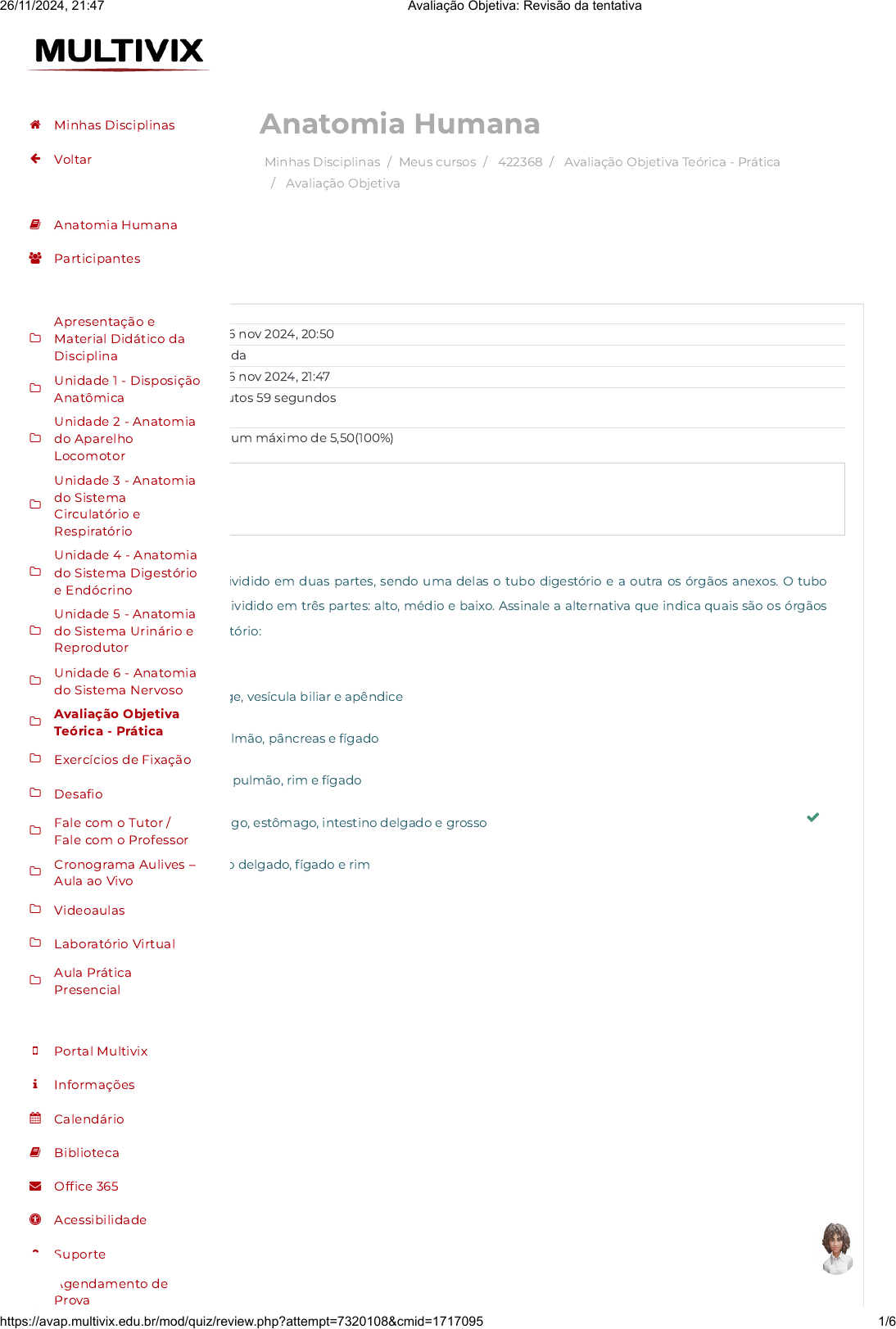 Minhas Disciplinas / Meus cursos / 422368 / Avaliação Objetiva Teórica - Prática / Avaliação Objetiva Anatomia Humana Iniciado em terça, 26 nov 2024, 20:50 Estado Finalizada Concluída em terça, 26 nov 2024, 21:47 Tempo empregado 56 minutos 59 segundos Avaliar 5,50 de um máximo de 5,50(100%) Questão 1 Correto Atingiu 0,55 de 0,55 O Sistema Digestório é dividido em duas partes, sendo uma delas o tubo digestório e a outra os órgãos anexos. O tubo digestório por sua vez é dividido em três partes: alto, médio e baixo. Assinale a alternativa que indica quais são os órgãos que formam o tubo digestório: Escolha uma opção: a. Boca, laringe, faringe, vesícula biliar e apêndice b. Faringe, laringe, pulmão, pâncreas e fígado c. Laringe, estômago, pulmão, rim e fígado d. Boca, faringe, esôfago, estômago, intestino delgado e grosso e. Estômago, intestino delgado, fígado e rim Minhas Disciplinas Voltar Anatomia Humana Participantes Apresentação e Material Didático da Disciplina Unidade 1 - Disposição Anatômica Unidade 2 - Anatomia do Aparelho Locomotor Unidade 3 - Anatomia do Sistema Circulatório e Respiratório Unidade 4 - Anatomia do Sistema Digestório e Endócrino Unidade 5 - Anatomia do Sistema Urinário e Reprodutor Unidade 6 - Anatomia do Sistema Nervoso Avaliação Objetiva Teórica - Prática Exercícios de Fixação Desafio Fale com o Tutor / Fale com o Professor Cronograma Aulives – Aula ao Vivo Videoaulas Laboratório Virtual Aula Prática Presencial Portal Multivix Informações Calendário Biblioteca Office 365 Acessibilidade Suporte Agendamento de Prova 26/11/2024, 21:47 Avaliação Objetiva: Revisão da tentativa https://avap.multivix.edu.br/mod/quiz/review.php?attempt=7320108&cmid=1717095 1/6 https://avap.multivix.edu.br/my/ https://avap.multivix.edu.br/course/view.php?id=29432 https://avap.multivix.edu.br/course/view.php?id=29432§ion=8 https://avap.multivix.edu.br/mod/quiz/view.php?id=1717095 https://avap.multivix.edu.br/mod/lti/view.php?id=1717106 https://avap.multivix.edu.br/my/ https://avap.multivix.edu.br/course/view.php?id=29432 https://avap.multivix.edu.br/user/index.php?id=29432 https://avap.multivix.edu.br/course/view.php?id=29432§ion=1 https://avap.multivix.edu.br/course/view.php?id=29432§ion=2 https://avap.multivix.edu.br/course/view.php?id=29432§ion=3 https://avap.multivix.edu.br/course/view.php?id=29432§ion=4 https://avap.multivix.edu.br/course/view.php?id=29432§ion=5 https://avap.multivix.edu.br/course/view.php?id=29432§ion=6 https://avap.multivix.edu.br/course/view.php?id=29432§ion=7 https://avap.multivix.edu.br/course/view.php?id=29432§ion=8 https://avap.multivix.edu.br/course/view.php?id=29432§ion=9 https://avap.multivix.edu.br/course/view.php?id=29432§ion=10 https://avap.multivix.edu.br/course/view.php?id=29432§ion=11 https://avap.multivix.edu.br/course/view.php?id=29432§ion=12 https://avap.multivix.edu.br/course/view.php?id=29432§ion=13 https://avap.multivix.edu.br/course/view.php?id=29432§ion=14 https://avap.multivix.edu.br/course/view.php?id=29432§ion=15 https://avap.multivix.edu.br/hooks/portal/ https://avap.multivix.edu.br/mod/page/view.php?id=1252%2F%22%20target%3D%22_blank https://avap.multivix.edu.br/calendar/view.php/ https://avap.multivix.edu.br/local/staticpage/view.php?page=biblioteca https://multivix.edu.br/office-365/ https://multivix.edu.br/acessibilidade/ https://avap.multivix.edu.br/mod/page/view.php?id=7%2F%22%20target%3D%22_blank https://docs.google.com/forms/d/e/1FAIpQLSfyH1O0KRhpI8B0cFqDv3aXT41lziF0mULzRNTBk2x0miNkNA/viewform https://avap.multivix.edu.br/ https://avap.multivix.edu.br/ https://avap.multivix.edu.br/ https://avap.multivix.edu.br/ https://avap.multivix.edu.br/ https://avap.multivix.edu.br/ https://avap.multivix.edu.br/ Questão 2 Correto Atingiu 0,55 de 0,55 Questão 3 Correto Atingiu 0,55 de 0,55 A membrana interóssea não só evita um deslocamento paralelo, entre o rádio e a ulna, mas também transmite as pressões e trações de um osso para outro. A membrana interóssea é uma articulação do tipo : Escolha uma opção: a. Sindesmose b. Sín�se c. Sinovial d. Cartilagínea e. Sincondrose Os músculos lumbricais (lumbricidae – latim = minhoca) são quatro pequenos músculos da mão localizados em uma região especí�ca do membro superior, profundo da fáscia palmar. Estes músculos originam-se dos tendões do músculo �exor profundo dos dedos, inserem-se nas aponeuroses dorsais dos respectivos dedos e são inervados pelos nervos mediano e ulnar. Onde são localizados os músculos lumbricais? Escolha uma opção: a. No pescoço b. Na coluna vertebral c. No braço d. Na perna e. Na mão Minhas Disciplinas Voltar Anatomia Humana Participantes Apresentação e Material Didático da Disciplina Unidade 1 - Disposição Anatômica Unidade 2 - Anatomia do Aparelho Locomotor Unidade 3 - Anatomia do Sistema Circulatório e Respiratório Unidade 4 - Anatomia do Sistema Digestório e Endócrino Unidade 5 - Anatomia do Sistema Urinário e Reprodutor Unidade 6 - Anatomia do Sistema Nervoso Avaliação Objetiva Teórica - Prática Exercícios de Fixação Desafio Fale com o Tutor / Fale com o Professor Cronograma Aulives – Aula ao Vivo Videoaulas Laboratório Virtual Aula Prática Presencial Portal Multivix Informações Calendário Biblioteca Office 365 Acessibilidade Suporte Agendamento de Prova 26/11/2024, 21:47 Avaliação Objetiva: Revisão da tentativa https://avap.multivix.edu.br/mod/quiz/review.php?attempt=7320108&cmid=1717095 2/6 https://www.kenhub.com/pt/library/anatomia/musculo-flexor-profundo-dos-dedos https://www.kenhub.com/pt/library/anatomia/musculo-flexor-profundo-dos-dedos https://avap.multivix.edu.br/my/ https://avap.multivix.edu.br/course/view.php?id=29432 https://avap.multivix.edu.br/user/index.php?id=29432 https://avap.multivix.edu.br/course/view.php?id=29432§ion=1 https://avap.multivix.edu.br/course/view.php?id=29432§ion=2 https://avap.multivix.edu
