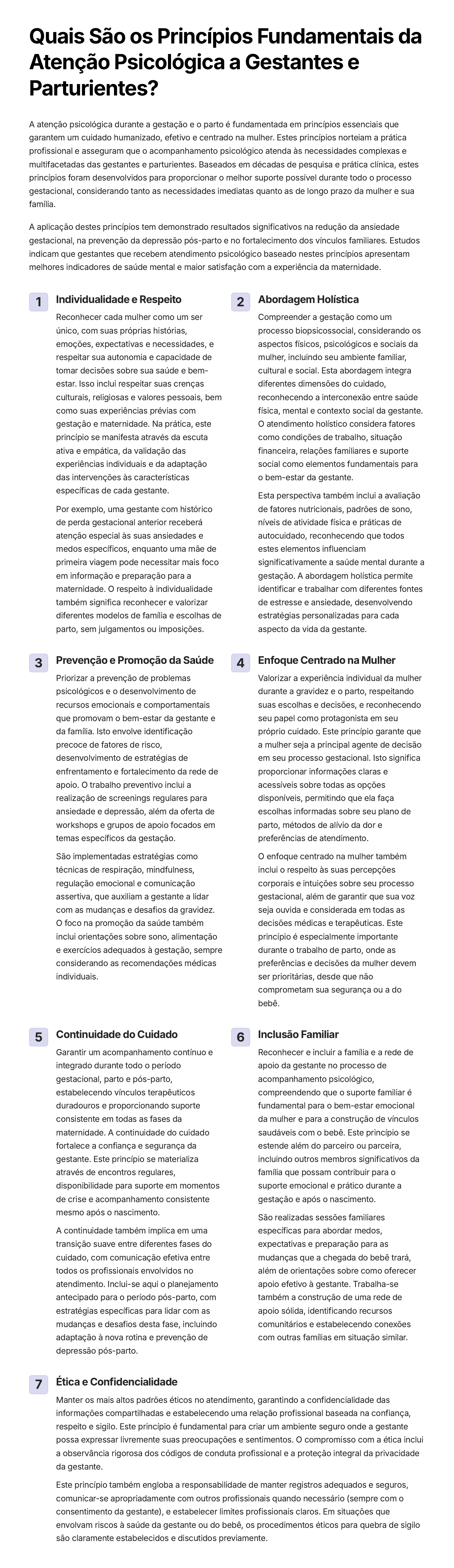 Quais São os Princípios Fundamentais da Atenção Psicológica a Gestantes e Parturientes? A atenção psicológica durante a gestação e o parto é fundamentada em princípios essenciais que garantem um cuidado humanizado, efetivo e centrado na mulher. Estes princípios norteiam a prática profissional e asseguram que o acompanhamento psicológico atenda às necessidades complexas e multifacetadas das gestantes e parturientes. Baseados em décadas de pesquisa e prática clínica, estes princípios foram desenvolvidos para proporcionar o melhor suporte possível durante todo o processo gestacional, considerando tanto as necessidades imediatas quanto as de longo prazo da mulher e sua família. A aplicação destes princípios tem demonstrado resultados significativos na redução da ansiedade gestacional, na prevenção da depressão pós-parto e no fortalecimento dos vínculos familiares. Estudos indicam que gestantes que recebem atendimento psicológico baseado nestes princípios apresentam melhores indicadores de saúde mental e maior satisfação com a experiência da maternidade. 1 Individualidade e Respeito Reconhecer cada mulher como um ser único, com suas próprias histórias, emoções, expectativas e necessidades, e respeitar sua autonomia e capacidade de tomar decisões sobre sua saúde e bem- estar. Isso inclui respeitar suas crenças culturais, religiosas e valores pessoais, bem como suas experiências prévias com gestação e maternidade. Na prática, este princípio se manifesta através da escuta ativa e empática, da validação das experiências individuais e da adaptação das intervenções às características específicas de cada gestante. Por exemplo, uma gestante com histórico de perda gestacional anterior receberá atenção especial às suas ansiedades e medos específicos, enquanto uma mãe de primeira viagem pode necessitar mais foco em informação e preparação para a maternidade. O respeito à individualidade também significa reconhecer e valorizar diferentes modelos de família e escolhas de parto, sem julgamentos ou imposições. 2 Abordagem Holística Compreender a gestação como um processo biopsicossocial, considerando os aspectos físicos, psicológicos e sociais da mulher, incluindo seu ambiente familiar, cultural e social. Esta abordagem integra diferentes dimensões do cuidado, reconhecendo a interconexão entre saúde física, mental e contexto social da gestante. O atendimento holístico considera fatores como condições de trabalho, situação financeira, relações familiares e suporte social como elementos fundamentais para o bem-estar da gestante. Esta perspectiva também inclui a avaliação de fatores nutricionais, padrões de sono, níveis de atividade física e práticas de autocuidado, reconhecendo que todos estes elementos influenciam significativamente a saúde mental durante a gestação. A abordagem holística permite identificar e trabalhar com diferentes fontes de estresse e ansiedade, desenvolvendo estratégias personalizadas para cada aspecto da vida da gestante. 3 Prevenção e Promoção da Saúde Priorizar a prevenção de problemas psicológicos e o desenvolvimento de recursos emocionais e comportamentais que promovam o bem-estar da gestante e da família. Isto envolve identificação precoce de fatores de risco, desenvolvimento de estratégias de enfrentamento e fortalecimento da rede de apoio. O trabalho preventivo inclui a realização de screenings regulares para ansiedade e depressão, além da oferta de workshops e grupos de apoio focados em temas específicos da gestação. São implementadas estratégias como técnicas de respiração, mindfulness, regulação emocional e comunicação assertiva, que auxiliam a gestante a lidar com as mudanças e desafios da gravidez. O foco na promoção da saúde também inclui orientações sobre sono, alimentação e exercícios adequados à gestação, sempre considerando as recomendações médicas individuais. 4 Enfoque Centrado na Mulher Valorizar a experiência individual da mulher durante a gravidez e o parto, respeitando suas escolhas e decisões, e reconhecendo seu papel como protagonista em seu próprio cuidado. Este princípio garante que a mulher seja a principal agente de decisão em seu processo gestacional. Isto significa proporcionar informações claras e acessíveis sobre todas as opções disponíveis, permitindo que ela faça escolhas informadas sobre seu plano de parto, métodos de alívio da dor e preferências de atendimento. O enfoque centrado na mulher também inclui o respeito às suas percepções corporais e intuições sobre seu processo gestacional, além de garantir que sua voz seja ouvida e considerada em todas as decisões médicas e terapêuticas. Este princípio é especialmente importante durante o trabalho de parto, onde as preferências e decisões da mulher devem ser prioritárias, desde que não comprometam sua segurança ou a do bebê. 5 Continuidade do Cuidado Garantir um acompanhamento contínuo e integrado durante todo o período gestacional, parto e pós-parto, estabelecendo vínculos terapêuticos duradouros e proporcionando suporte consistente em todas as fases da maternidade. A continuidade do cuidado fortalece a confiança e segurança da gestante. Este princípio se materializa através de encontros regulares, disponibilidade para suporte em momentos de crise e acompanhamento consistente mesmo após o nascimento. A continuidade também implica em uma transição suave entre diferentes fases do cuidado, com comunicação efetiva entre todos os profissionais envolvidos no atendimento. Inclui-se aqui o planejamento antecipado para o período pós-parto, com estratégias específicas para lidar com as mudanças e desafios desta fase, incluindo adaptação à nova rotina e prevenção de depressão pós-parto. 6 Inclusão Familiar Reconhecer e incluir a família e a rede de apoio da gestante no processo de acompanhamento psicol