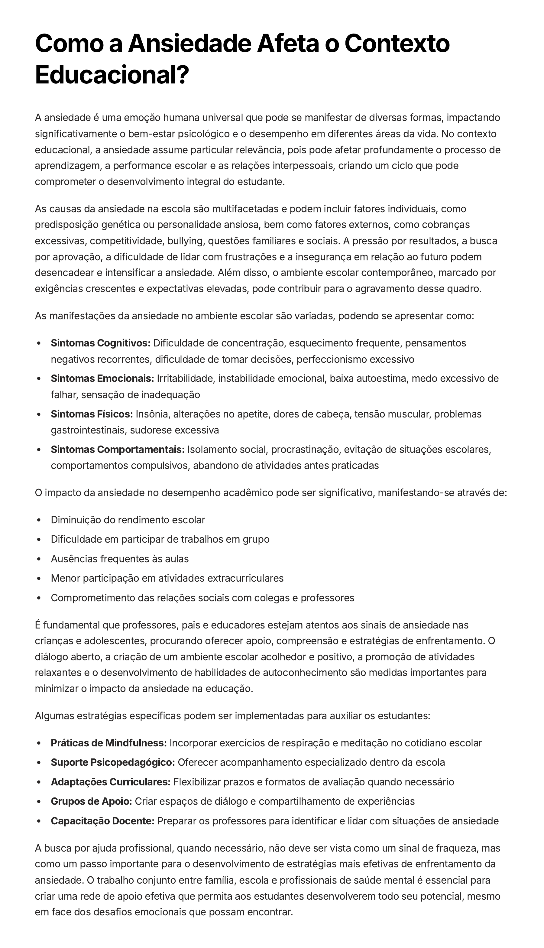 Como a Ansiedade Afeta o Contexto Educacional? A ansiedade é uma emoção humana universal que pode se manifestar de diversas formas, impactando significativamente o bem-estar psicológico e o desempenho em diferentes áreas da vida. No contexto educacional, a ansiedade assume particular relevância, pois pode afetar profundamente o processo de aprendizagem, a performance escolar e as relações interpessoais, criando um ciclo que pode comprometer o desenvolvimento integral do estudante. As causas da ansiedade na escola são multifacetadas e podem incluir fatores individuais, como predisposição genética ou personalidade ansiosa, bem como fatores externos, como cobranças excessivas, competitividade, bullying, questões familiares e sociais. A pressão por resultados, a busca por aprovação, a dificuldade de lidar com frustrações e a insegurança em relação ao futuro podem desencadear e intensificar a ansiedade. Além disso, o ambiente escolar contemporâneo, marcado por exigências crescentes e expectativas elevadas, pode contribuir para o agravamento desse quadro. As manifestações da ansiedade no ambiente escolar são variadas, podendo se apresentar como: Sintomas Cognitivos: Dificuldade de concentração, esquecimento frequente, pensamentos negativos recorrentes, dificuldade de tomar decisões, perfeccionismo excessivo Sintomas Emocionais: Irritabilidade, instabilidade emocional, baixa autoestima, medo excessivo de falhar, sensação de inadequação Sintomas Físicos: Insônia, alterações no apetite, dores de cabeça, tensão muscular, problemas gastrointestinais, sudorese excessiva Sintomas Comportamentais: Isolamento social, procrastinação, evitação de situações escolares, comportamentos compulsivos, abandono de atividades antes praticadas O impacto da ansiedade no desempenho acadêmico pode ser significativo, manifestando-se através de: Diminuição do rendimento escolar Dificuldade em participar de trabalhos em grupo Ausências frequentes às aulas Menor participação em atividades extracurriculares Comprometimento das relações sociais com colegas e professores É fundamental que professores, pais e educadores estejam atentos aos sinais de ansiedade nas crianças e adolescentes, procurando oferecer apoio, compreensão e estratégias de enfrentamento. O diálogo aberto, a criação de um ambiente escolar acolhedor e positivo, a promoção de atividades relaxantes e o desenvolvimento de habilidades de autoconhecimento são medidas importantes para minimizar o impacto da ansiedade na educação. Algumas estratégias específicas podem ser implementadas para auxiliar os estudantes: Práticas de Mindfulness: Incorporar exercícios de respiração e meditação no cotidiano escolar Suporte Psicopedagógico: Oferecer acompanhamento especializado dentro da escola Adaptações Curriculares: Flexibilizar prazos e formatos de avaliação quando necessário Grupos de Apoio: Criar espaços de diálogo e compartilhamento de experiências Capacitação Docente: Preparar os professores para identificar e lidar com situações de ansiedade A busca por ajuda profissional, quando necessário, não deve ser vista como um sinal de fraqueza, mas como um passo importante para o desenvolvimento de estratégias mais efetivas de enfrentamento da ansiedade. O trabalho conjunto entre família, escola e profissionais de saúde mental é essencial para criar uma rede de apoio efetiva que permita aos estudantes desenvolverem todo seu potencial, mesmo em face dos desafios emocionais que possam encontrar.