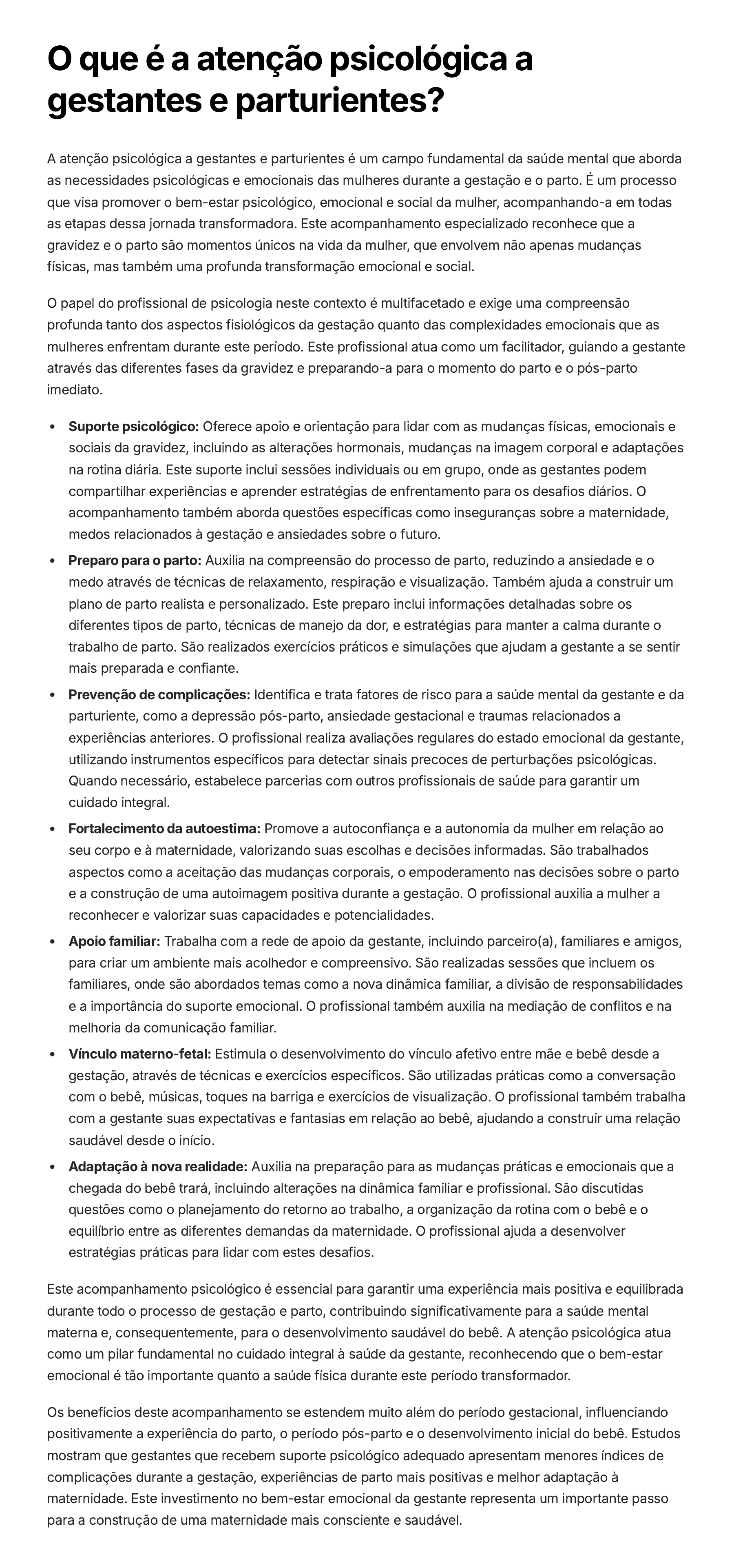 O que é a atenção psicológica a gestantes e parturientes? A atenção psicológica a gestantes e parturientes é um campo fundamental da saúde mental que aborda as necessidades psicológicas e emocionais das mulheres durante a gestação e o parto. É um processo que visa promover o bem-estar psicológico, emocional e social da mulher, acompanhando-a em todas as etapas dessa jornada transformadora. Este acompanhamento especializado reconhece que a gravidez e o parto são momentos únicos na vida da mulher, que envolvem não apenas mudanças físicas, mas também uma profunda transformação emocional e social. O papel do profissional de psicologia neste contexto é multifacetado e exige uma compreensão profunda tanto dos aspectos fisiológicos da gestação quanto das complexidades emocionais que as mulheres enfrentam durante este período. Este profissional atua como um facilitador, guiando a gestante através das diferentes fases da gravidez e preparando-a para o momento do parto e o pós-parto imediato. Suporte psicológico: Oferece apoio e orientação para lidar com as mudanças físicas, emocionais e sociais da gravidez, incluindo as alterações hormonais, mudanças na imagem corporal e adaptações na rotina diária. Este suporte inclui sessões individuais ou em grupo, onde as gestantes podem compartilhar experiências e aprender estratégias de enfrentamento para os desafios diários. O acompanhamento também aborda questões específicas como inseguranças sobre a maternidade, medos relacionados à gestação e ansiedades sobre o futuro. Preparo para o parto: Auxilia na compreensão do processo de parto, reduzindo a ansiedade e o medo através de técnicas de relaxamento, respiração e visualização. Também ajuda a construir um plano de parto realista e personalizado. Este preparo inclui informações detalhadas sobre os diferentes tipos de parto, técnicas de manejo da dor, e estratégias para manter a calma durante o trabalho de parto. São realizados exercícios práticos e simulações que ajudam a gestante a se sentir mais preparada e confiante. Prevenção de complicações: Identifica e trata fatores de risco para a saúde mental da gestante e da parturiente, como a depressão pós-parto, ansiedade gestacional e traumas relacionados a experiências anteriores. O profissional realiza avaliações regulares do estado emocional da gestante, utilizando instrumentos específicos para detectar sinais precoces de perturbações psicológicas. Quando necessário, estabelece parcerias com outros profissionais de saúde para garantir um cuidado integral. Fortalecimento da autoestima: Promove a autoconfiança e a autonomia da mulher em relação ao seu corpo e à maternidade, valorizando suas escolhas e decisões informadas. São trabalhados aspectos como a aceitação das mudanças corporais, o empoderamento nas decisões sobre o parto e a construção de uma autoimagem positiva durante a gestação. O profissional auxilia a mulher a reconhecer e valorizar suas capacidades e potencialidades. Apoio familiar: Trabalha com a rede de apoio da gestante, incluindo parceiro(a), familiares e amigos, para criar um ambiente mais acolhedor e compreensivo. São realizadas sessões que incluem os familiares, onde são abordados temas como a nova dinâmica familiar, a divisão de responsabilidades e a importância do suporte emocional. O profissional também auxilia na mediação de conflitos e na melhoria da comunicação familiar. Vínculo materno-fetal: Estimula o desenvolvimento do vínculo afetivo entre mãe e bebê desde a gestação, através de técnicas e exercícios específicos. São utilizadas práticas como a conversação com o bebê, músicas, toques na barriga e exercícios de visualização. O profissional também trabalha com a gestante suas expectativas e fantasias em relação ao bebê, ajudando a construir uma relação saudável desde o início. Adaptação à nova realidade: Auxilia na preparação para as mudanças práticas e emocionais que a chegada do bebê trará, incluindo alterações na dinâmica familiar e profissional. São discutidas questões como o planejamento do retorno ao trabalho, a organização da rotina com o bebê e o equilíbrio entre as diferentes demandas da maternidade. O profissional ajuda a desenvolver estratégias práticas para lidar com estes desafios. Este acompanhamento psicológico é essencial para garantir uma experiência mais positiva e equilibrada durante todo o processo de gestação e parto, contribuindo significativamente para a saúde mental materna e, consequentemente, para o desenvolvimento saudável do bebê. A atenção psicológica atua como um pilar fundamental no cuidado integral à saúde da gestante, reconhecendo que o bem-estar emocional é tão importante quanto a saúde física durante este período transformador. Os benefícios deste acompanhamento se estendem muito além do período gestacional, influenciando positivamente a experiência do parto, o período pós-parto e o desenvolvimento inicial do bebê. Estudos mostram que gestantes que recebem suporte psicológico adequado apresentam menores índices de complicações durante a gestação, experiências de parto mais positivas e melhor adaptação à maternidade. Este investimento no bem-estar emocional da gestante representa um importante passo para a construção de uma maternidade mais consciente e saudável.