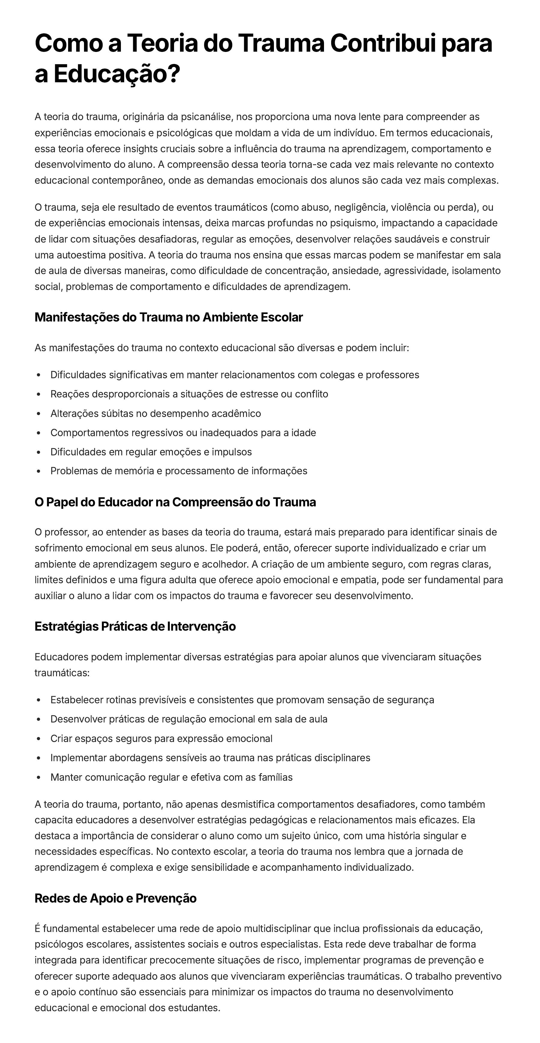 Como a Teoria do Trauma Contribui para a Educação? A teoria do trauma, originária da psicanálise, nos proporciona uma nova lente para compreender as experiências emocionais e psicológicas que moldam a vida de um indivíduo. Em termos educacionais, essa teoria oferece insights cruciais sobre a influência do trauma na aprendizagem, comportamento e desenvolvimento do aluno. A compreensão dessa teoria torna-se cada vez mais relevante no contexto educacional contemporâneo, onde as demandas emocionais dos alunos são cada vez mais complexas. O trauma, seja ele resultado de eventos traumáticos (como abuso, negligência, violência ou perda), ou de experiências emocionais intensas, deixa marcas profundas no psiquismo, impactando a capacidade de lidar com situações desafiadoras, regular as emoções, desenvolver relações saudáveis e construir uma autoestima positiva. A teoria do trauma nos ensina que essas marcas podem se manifestar em sala de aula de diversas maneiras, como dificuldade de concentração, ansiedade, agressividade, isolamento social, problemas de comportamento e dificuldades de aprendizagem. Manifestações do Trauma no Ambiente Escolar As manifestações do trauma no contexto educacional são diversas e podem incluir: Dificuldades significativas em manter relacionamentos com colegas e professores Reações desproporcionais a situações de estresse ou conflito Alterações súbitas no desempenho acadêmico Comportamentos regressivos ou inadequados para a idade Dificuldades em regular emoções e impulsos Problemas de memória e processamento de informações O Papel do Educador na Compreensão do Trauma O professor, ao entender as bases da teoria do trauma, estará mais preparado para identificar sinais de sofrimento emocional em seus alunos. Ele poderá, então, oferecer suporte individualizado e criar um ambiente de aprendizagem seguro e acolhedor. A criação de um ambiente seguro, com regras claras, limites definidos e uma figura adulta que oferece apoio emocional e empatia, pode ser fundamental para auxiliar o aluno a lidar com os impactos do trauma e favorecer seu desenvolvimento. Estratégias Práticas de Intervenção Educadores podem implementar diversas estratégias para apoiar alunos que vivenciaram situações traumáticas: Estabelecer rotinas previsíveis e consistentes que promovam sensação de segurança Desenvolver práticas de regulação emocional em sala de aula Criar espaços seguros para expressão emocional Implementar abordagens sensíveis ao trauma nas práticas disciplinares Manter comunicação regular e efetiva com as famílias A teoria do trauma, portanto, não apenas desmistifica comportamentos desafiadores, como também capacita educadores a desenvolver estratégias pedagógicas e relacionamentos mais eficazes. Ela destaca a importância de considerar o aluno como um sujeito único, com uma história singular e necessidades específicas. No contexto escolar, a teoria do trauma nos lembra que a jornada de aprendizagem é complexa e exige sensibilidade e acompanhamento individualizado. Redes de Apoio e Prevenção É fundamental estabelecer uma rede de apoio multidisciplinar que inclua profissionais da educação, psicólogos escolares, assistentes sociais e outros especialistas. Esta rede deve trabalhar de forma integrada para identificar precocemente situações de risco, implementar programas de prevenção e oferecer suporte adequado aos alunos que vivenciaram experiências traumáticas. O trabalho preventivo e o apoio contínuo são essenciais para minimizar os impactos do trauma no desenvolvimento educacional e emocional dos estudantes.