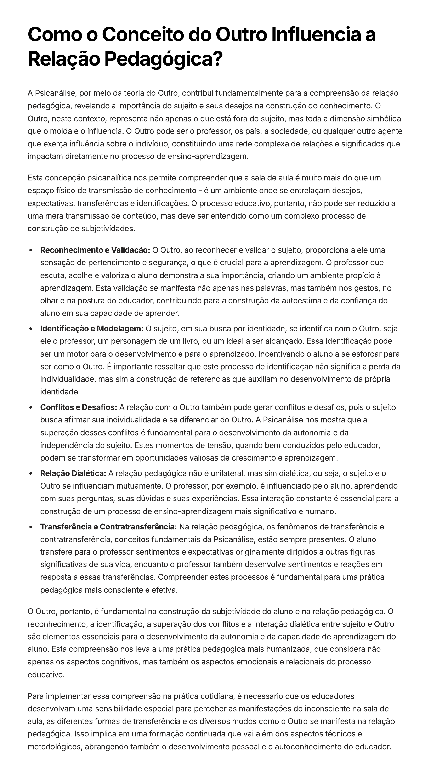Como o Conceito do Outro Influencia a Relação Pedagógica? A Psicanálise, por meio da teoria do Outro, contribui fundamentalmente para a compreensão da relação pedagógica, revelando a importância do sujeito e seus desejos na construção do conhecimento. O Outro, neste contexto, representa não apenas o que está fora do sujeito, mas toda a dimensão simbólica que o molda e o influencia. O Outro pode ser o professor, os pais, a sociedade, ou qualquer outro agente que exerça influência sobre o indivíduo, constituindo uma rede complexa de relações e significados que impactam diretamente no processo de ensino-aprendizagem. Esta concepção psicanalítica nos permite compreender que a sala de aula é muito mais do que um espaço físico de transmissão de conhecimento - é um ambiente onde se entrelaçam desejos, expectativas, transferências e identificações. O processo educativo, portanto, não pode ser reduzido a uma mera transmissão de conteúdo, mas deve ser entendido como um complexo processo de construção de subjetividades. Reconhecimento e Validação: O Outro, ao reconhecer e validar o sujeito, proporciona a ele uma sensação de pertencimento e segurança, o que é crucial para a aprendizagem. O professor que escuta, acolhe e valoriza o aluno demonstra a sua importância, criando um ambiente propício à aprendizagem. Esta validação se manifesta não apenas nas palavras, mas também nos gestos, no olhar e na postura do educador, contribuindo para a construção da autoestima e da confiança do aluno em sua capacidade de aprender. Identificação e Modelagem: O sujeito, em sua busca por identidade, se identifica com o Outro, seja ele o professor, um personagem de um livro, ou um ideal a ser alcançado. Essa identificação pode ser um motor para o desenvolvimento e para o aprendizado, incentivando o aluno a se esforçar para ser como o Outro. É importante ressaltar que este processo de identificação não significa a perda da individualidade, mas sim a construção de referencias que auxiliam no desenvolvimento da própria identidade. Conflitos e Desafios: A relação com o Outro também pode gerar conflitos e desafios, pois o sujeito busca afirmar sua individualidade e se diferenciar do Outro. A Psicanálise nos mostra que a superação desses conflitos é fundamental para o desenvolvimento da autonomia e da independência do sujeito. Estes momentos de tensão, quando bem conduzidos pelo educador, podem se transformar em oportunidades valiosas de crescimento e aprendizagem. Relação Dialética: A relação pedagógica não é unilateral, mas sim dialética, ou seja, o sujeito e o Outro se influenciam mutuamente. O professor, por exemplo, é influenciado pelo aluno, aprendendo com suas perguntas, suas dúvidas e suas experiências. Essa interação constante é essencial para a construção de um processo de ensino-aprendizagem mais significativo e humano. Transferência e Contratransferência: Na relação pedagógica, os fenômenos de transferência e contratransferência, conceitos fundamentais da Psicanálise, estão sempre presentes. O aluno transfere para o professor sentimentos e expectativas originalmente dirigidos a outras figuras significativas de sua vida, enquanto o professor também desenvolve sentimentos e reações em resposta a essas transferências. Compreender estes processos é fundamental para uma prática pedagógica mais consciente e efetiva. O Outro, portanto, é fundamental na construção da subjetividade do aluno e na relação pedagógica. O reconhecimento, a identificação, a superação dos conflitos e a interação dialética entre sujeito e Outro são elementos essenciais para o desenvolvimento da autonomia e da capacidade de aprendizagem do aluno. Esta compreensão nos leva a uma prática pedagógica mais humanizada, que considera não apenas os aspectos cognitivos, mas também os aspectos emocionais e relacionais do processo educativo. Para implementar essa compreensão na prática cotidiana, é necessário que os educadores desenvolvam uma sensibilidade especial para perceber as manifestações do inconsciente na sala de aula, as diferentes formas de transferência e os diversos modos como o Outro se manifesta na relação pedagógica. Isso implica em uma formação continuada que vai além dos aspectos técnicos e metodológicos, abrangendo também o desenvolvimento pessoal e o autoconhecimento do educador.