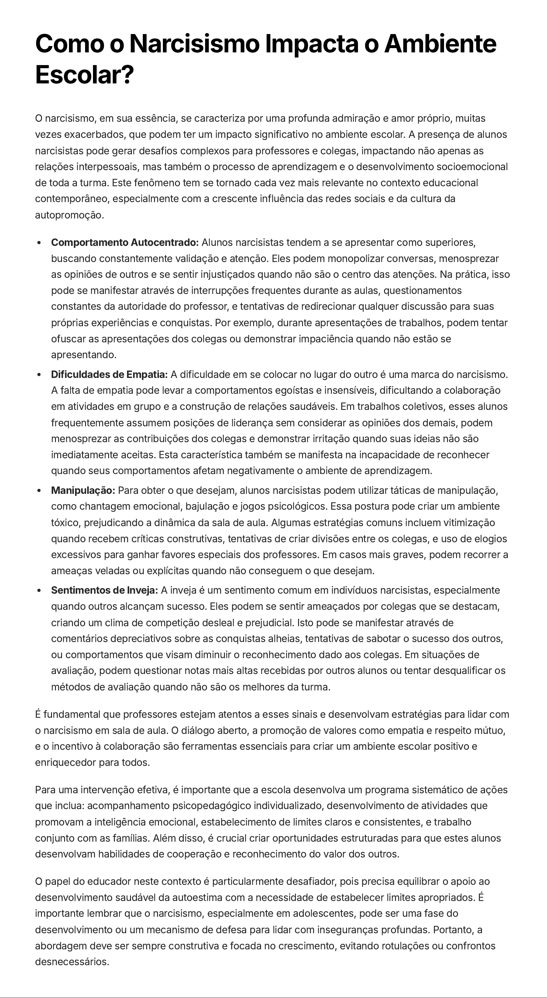 Como o Narcisismo Impacta o Ambiente Escolar? O narcisismo, em sua essência, se caracteriza por uma profunda admiração e amor próprio, muitas vezes exacerbados, que podem ter um impacto significativo no ambiente escolar. A presença de alunos narcisistas pode gerar desafios complexos para professores e colegas, impactando não apenas as relações interpessoais, mas também o processo de aprendizagem e o desenvolvimento socioemocional de toda a turma. Este fenômeno tem se tornado cada vez mais relevante no contexto educacional contemporâneo, especialmente com a crescente influência das redes sociais e da cultura da autopromoção. Comportamento Autocentrado: Alunos narcisistas tendem a se apresentar como superiores, buscando constantemente validação e atenção. Eles podem monopolizar conversas, menosprezar as opiniões de outros e se sentir injustiçados quando não são o centro das atenções. Na prática, isso pode se manifestar através de interrupções frequentes durante as aulas, questionamentos constantes da autoridade do professor, e tentativas de redirecionar qualquer discussão para suas próprias experiências e conquistas. Por exemplo, durante apresentações de trabalhos, podem tentar ofuscar as apresentações dos colegas ou demonstrar impaciência quando não estão se apresentando. Dificuldades de Empatia: A dificuldade em se colocar no lugar do outro é uma marca do narcisismo. A falta de empatia pode levar a comportamentos egoístas e insensíveis, dificultando a colaboração em atividades em grupo e a construção de relações saudáveis. Em trabalhos coletivos, esses alunos frequentemente assumem posições de liderança sem considerar as opiniões dos demais, podem menosprezar as contribuições dos colegas e demonstrar irritação quando suas ideias não são imediatamente aceitas. Esta característica também se manifesta na incapacidade de reconhecer quando seus comportamentos afetam negativamente o ambiente de aprendizagem. Manipulação: Para obter o que desejam, alunos narcisistas podem utilizar táticas de manipulação, como chantagem emocional, bajulação e jogos psicológicos. Essa postura pode criar um ambiente tóxico, prejudicando a dinâmica da sala de aula. Algumas estratégias comuns incluem vitimização quando recebem críticas construtivas, tentativas de criar divisões entre os colegas, e uso de elogios excessivos para ganhar favores especiais dos professores. Em casos mais graves, podem recorrer a ameaças veladas ou explícitas quando não conseguem o que desejam. Sentimentos de Inveja: A inveja é um sentimento comum em indivíduos narcisistas, especialmente quando outros alcançam sucesso. Eles podem se sentir ameaçados por colegas que se destacam, criando um clima de competição desleal e prejudicial. Isto pode se manifestar através de comentários depreciativos sobre as conquistas alheias, tentativas de sabotar o sucesso dos outros, ou comportamentos que visam diminuir o reconhecimento dado aos colegas. Em situações de avaliação, podem questionar notas mais altas recebidas por outros alunos ou tentar desqualificar os métodos de avaliação quando não são os melhores da turma. É fundamental que professores estejam atentos a esses sinais e desenvolvam estratégias para lidar com o narcisismo em sala de aula. O diálogo aberto, a promoção de valores como empatia e respeito mútuo, e o incentivo à colaboração são ferramentas essenciais para criar um ambiente escolar positivo e enriquecedor para todos. Para uma intervenção efetiva, é importante que a escola desenvolva um programa sistemático de ações que inclua: acompanhamento psicopedagógico individualizado, desenvolvimento de atividades que promovam a inteligência emocional, estabelecimento de limites claros e consistentes, e trabalho conjunto com as famílias. Além disso, é crucial criar oportunidades estruturadas para que estes alunos desenvolvam habilidades de cooperação e reconhecimento do valor dos outros. O papel do educador neste contexto é particularmente desafiador, pois precisa equilibrar o apoio ao desenvolvimento saudável da autoestima com a necessidade de estabelecer limites apropriados. É importante lembrar que o narcisismo, especialmente em adolescentes, pode ser uma fase do desenvolvimento ou um mecanismo de defesa para lidar com inseguranças profundas. Portanto, a abordagem deve ser sempre construtiva e focada no crescimento, evitando rotulações ou confrontos desnecessários.