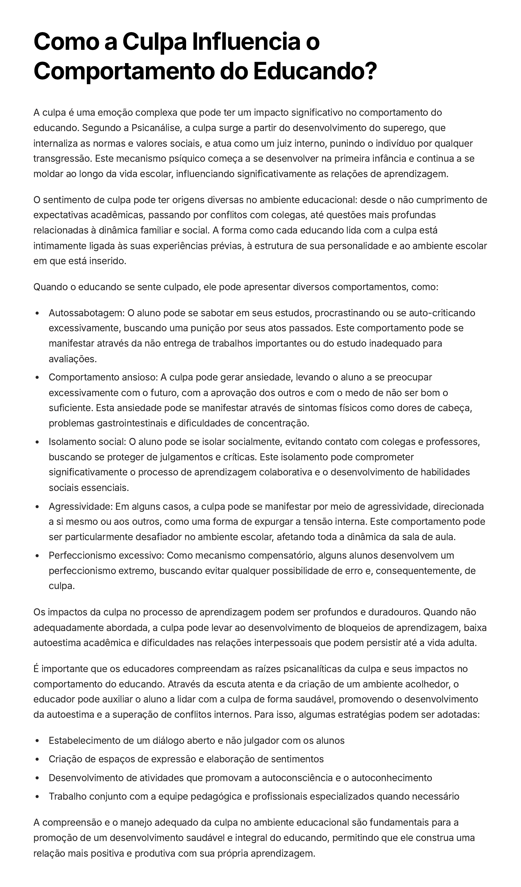 Como a Culpa Influencia o Comportamento do Educando? A culpa é uma emoção complexa que pode ter um impacto significativo no comportamento do educando. Segundo a Psicanálise, a culpa surge a partir do desenvolvimento do superego, que internaliza as normas e valores sociais, e atua como um juiz interno, punindo o indivíduo por qualquer transgressão. Este mecanismo psíquico começa a se desenvolver na primeira infância e continua a se moldar ao longo da vida escolar, influenciando significativamente as relações de aprendizagem. O sentimento de culpa pode ter origens diversas no ambiente educacional: desde o não cumprimento de expectativas acadêmicas, passando por conflitos com colegas, até questões mais profundas relacionadas à dinâmica familiar e social. A forma como cada educando lida com a culpa está intimamente ligada às suas experiências prévias, à estrutura de sua personalidade e ao ambiente escolar em que está inserido. Quando o educando se sente culpado, ele pode apresentar diversos comportamentos, como: Autossabotagem: O aluno pode se sabotar em seus estudos, procrastinando ou se auto-criticando excessivamente, buscando uma punição por seus atos passados. Este comportamento pode se manifestar através da não entrega de trabalhos importantes ou do estudo inadequado para avaliações. Comportamento ansioso: A culpa pode gerar ansiedade, levando o aluno a se preocupar excessivamente com o futuro, com a aprovação dos outros e com o medo de não ser bom o suficiente. Esta ansiedade pode se manifestar através de sintomas físicos como dores de cabeça, problemas gastrointestinais e dificuldades de concentração. Isolamento social: O aluno pode se isolar socialmente, evitando contato com colegas e professores, buscando se proteger de julgamentos e críticas. Este isolamento pode comprometer significativamente o processo de aprendizagem colaborativa e o desenvolvimento de habilidades sociais essenciais. Agressividade: Em alguns casos, a culpa pode se manifestar por meio de agressividade, direcionada a si mesmo ou aos outros, como uma forma de expurgar a tensão interna. Este comportamento pode ser particularmente desafiador no ambiente escolar, afetando toda a dinâmica da sala de aula. Perfeccionismo excessivo: Como mecanismo compensatório, alguns alunos desenvolvem um perfeccionismo extremo, buscando evitar qualquer possibilidade de erro e, consequentemente, de culpa. Os impactos da culpa no processo de aprendizagem podem ser profundos e duradouros. Quando não adequadamente abordada, a culpa pode levar ao desenvolvimento de bloqueios de aprendizagem, baixa autoestima acadêmica e dificuldades nas relações interpessoais que podem persistir até a vida adulta. É importante que os educadores compreendam as raízes psicanalíticas da culpa e seus impactos no comportamento do educando. Através da escuta atenta e da criação de um ambiente acolhedor, o educador pode auxiliar o aluno a lidar com a culpa de forma saudável, promovendo o desenvolvimento da autoestima e a superação de conflitos internos. Para isso, algumas estratégias podem ser adotadas: Estabelecimento de um diálogo aberto e não julgador com os alunos Criação de espaços de expressão e elaboração de sentimentos Desenvolvimento de atividades que promovam a autoconsciência e o autoconhecimento Trabalho conjunto com a equipe pedagógica e profissionais especializados quando necessário A compreensão e o manejo adequado da culpa no ambiente educacional são fundamentais para a promoção de um desenvolvimento saudável e integral do educando, permitindo que ele construa uma relação mais positiva e produtiva com sua própria aprendizagem.