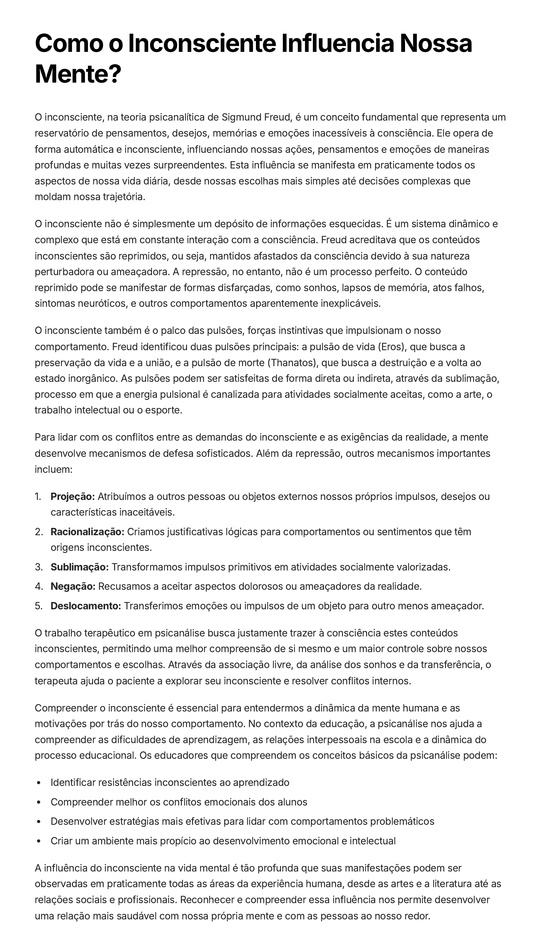 Como o Inconsciente Influencia Nossa Mente? O inconsciente, na teoria psicanalítica de Sigmund Freud, é um conceito fundamental que representa um reservatório de pensamentos, desejos, memórias e emoções inacessíveis à consciência. Ele opera de forma automática e inconsciente, influenciando nossas ações, pensamentos e emoções de maneiras profundas e muitas vezes surpreendentes. Esta influência se manifesta em praticamente todos os aspectos de nossa vida diária, desde nossas escolhas mais simples até decisões complexas que moldam nossa trajetória. O inconsciente não é simplesmente um depósito de informações esquecidas. É um sistema dinâmico e complexo que está em constante interação com a consciência. Freud acreditava que os conteúdos inconscientes são reprimidos, ou seja, mantidos afastados da consciência devido à sua natureza perturbadora ou ameaçadora. A repressão, no entanto, não é um processo perfeito. O conteúdo reprimido pode se manifestar de formas disfarçadas, como sonhos, lapsos de memória, atos falhos, sintomas neuróticos, e outros comportamentos aparentemente inexplicáveis. O inconsciente também é o palco das pulsões, forças instintivas que impulsionam o nosso comportamento. Freud identificou duas pulsões principais: a pulsão de vida (Eros), que busca a preservação da vida e a união, e a pulsão de morte (Thanatos), que busca a destruição e a volta ao estado inorgânico. As pulsões podem ser satisfeitas de forma direta ou indireta, através da sublimação, processo em que a energia pulsional é canalizada para atividades socialmente aceitas, como a arte, o trabalho intelectual ou o esporte. Para lidar com os conflitos entre as demandas do inconsciente e as exigências da realidade, a mente desenvolve mecanismos de defesa sofisticados. Além da repressão, outros mecanismos importantes incluem: Projeção: Atribuímos a outros pessoas ou objetos externos nossos próprios impulsos, desejos ou características inaceitáveis. 1. Racionalização: Criamos justificativas lógicas para comportamentos ou sentimentos que têm origens inconscientes. 2. Sublimação: Transformamos impulsos primitivos em atividades socialmente valorizadas.3. Negação: Recusamos a aceitar aspectos dolorosos ou ameaçadores da realidade.4. Deslocamento: Transferimos emoções ou impulsos de um objeto para outro menos ameaçador.5. O trabalho terapêutico em psicanálise busca justamente trazer à consciência estes conteúdos inconscientes, permitindo uma melhor compreensão de si mesmo e um maior controle sobre nossos comportamentos e escolhas. Através da associação livre, da análise dos sonhos e da transferência, o terapeuta ajuda o paciente a explorar seu inconsciente e resolver conflitos internos. Compreender o inconsciente é essencial para entendermos a dinâmica da mente humana e as motivações por trás do nosso comportamento. No contexto da educação, a psicanálise nos ajuda a compreender as dificuldades de aprendizagem, as relações interpessoais na escola e a dinâmica do processo educacional. Os educadores que compreendem os conceitos básicos da psicanálise podem: Identificar resistências inconscientes ao aprendizado Compreender melhor os conflitos emocionais dos alunos Desenvolver estratégias mais efetivas para lidar com comportamentos problemáticos Criar um ambiente mais propício ao desenvolvimento emocional e intelectual A influência do inconsciente na vida mental é tão profunda que suas manifestações podem ser observadas em praticamente todas as áreas da experiência humana, desde as artes e a literatura até as relações sociais e profissionais. Reconhecer e compreender essa influência nos permite desenvolver uma relação mais saudável com nossa própria mente e com as pessoas ao nosso redor.