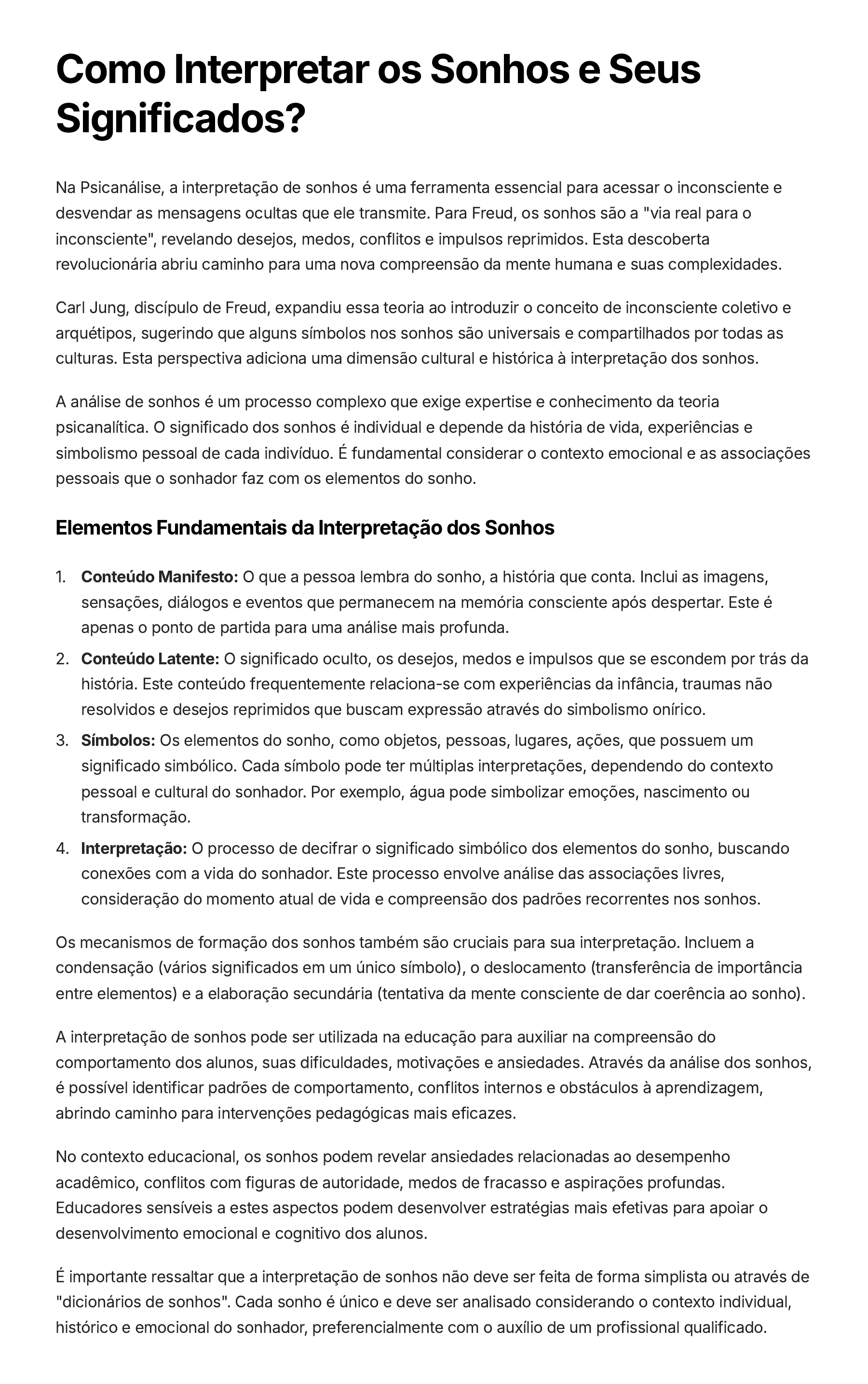 Como Interpretar os Sonhos e Seus Significados? Na Psicanálise, a interpretação de sonhos é uma ferramenta essencial para acessar o inconsciente e desvendar as mensagens ocultas que ele transmite. Para Freud, os sonhos são a "via real para o inconsciente", revelando desejos, medos, conflitos e impulsos reprimidos. Esta descoberta revolucionária abriu caminho para uma nova compreensão da mente humana e suas complexidades. Carl Jung, discípulo de Freud, expandiu essa teoria ao introduzir o conceito de inconsciente coletivo e arquétipos, sugerindo que alguns símbolos nos sonhos são universais e compartilhados por todas as culturas. Esta perspectiva adiciona uma dimensão cultural e histórica à interpretação dos sonhos. A análise de sonhos é um processo complexo que exige expertise e conhecimento da teoria psicanalítica. O significado dos sonhos é individual e depende da história de vida, experiências e simbolismo pessoal de cada indivíduo. É fundamental considerar o contexto emocional e as associações pessoais que o sonhador faz com os elementos do sonho. Elementos Fundamentais da Interpretação dos Sonhos Conteúdo Manifesto: O que a pessoa lembra do sonho, a história que conta. Inclui as imagens, sensações, diálogos e eventos que permanecem na memória consciente após despertar. Este é apenas o ponto de partida para uma análise mais profunda. 1. Conteúdo Latente: O significado oculto, os desejos, medos e impulsos que se escondem por trás da história. Este conteúdo frequentemente relaciona-se com experiências da infância, traumas não resolvidos e desejos reprimidos que buscam expressão através do simbolismo onírico. 2. Símbolos: Os elementos do sonho, como objetos, pessoas, lugares, ações, que possuem um significado simbólico. Cada símbolo pode ter múltiplas interpretações, dependendo do contexto pessoal e cultural do sonhador. Por exemplo, água pode simbolizar emoções, nascimento ou transformação. 3. Interpretação: O processo de decifrar o significado simbólico dos elementos do sonho, buscando conexões com a vida do sonhador. Este processo envolve análise das associações livres, consideração do momento atual de vida e compreensão dos padrões recorrentes nos sonhos. 4. Os mecanismos de formação dos sonhos também são cruciais para sua interpretação. Incluem a condensação (vários significados em um único símbolo), o deslocamento (transferência de importância entre elementos) e a elaboração secundária (tentativa da mente consciente de dar coerência ao sonho). A interpretação de sonhos pode ser utilizada na educação para auxiliar na compreensão do comportamento dos alunos, suas dificuldades, motivações e ansiedades. Através da análise dos sonhos, é possível identificar padrões de comportamento, conflitos internos e obstáculos à aprendizagem, abrindo caminho para intervenções pedagógicas mais eficazes. No contexto educacional, os sonhos podem revelar ansiedades relacionadas ao desempenho acadêmico, conflitos com figuras de autoridade, medos de fracasso e aspirações profundas. Educadores sensíveis a estes aspectos podem desenvolver estratégias mais efetivas para apoiar o desenvolvimento emocional e cognitivo dos alunos. É importante ressaltar que a interpretação de sonhos não deve ser feita de forma simplista ou através de "dicionários de sonhos". Cada sonho é único e deve ser analisado considerando o contexto individual, histórico e emocional do sonhador, preferencialmente com o auxílio de um profissional qualificado.