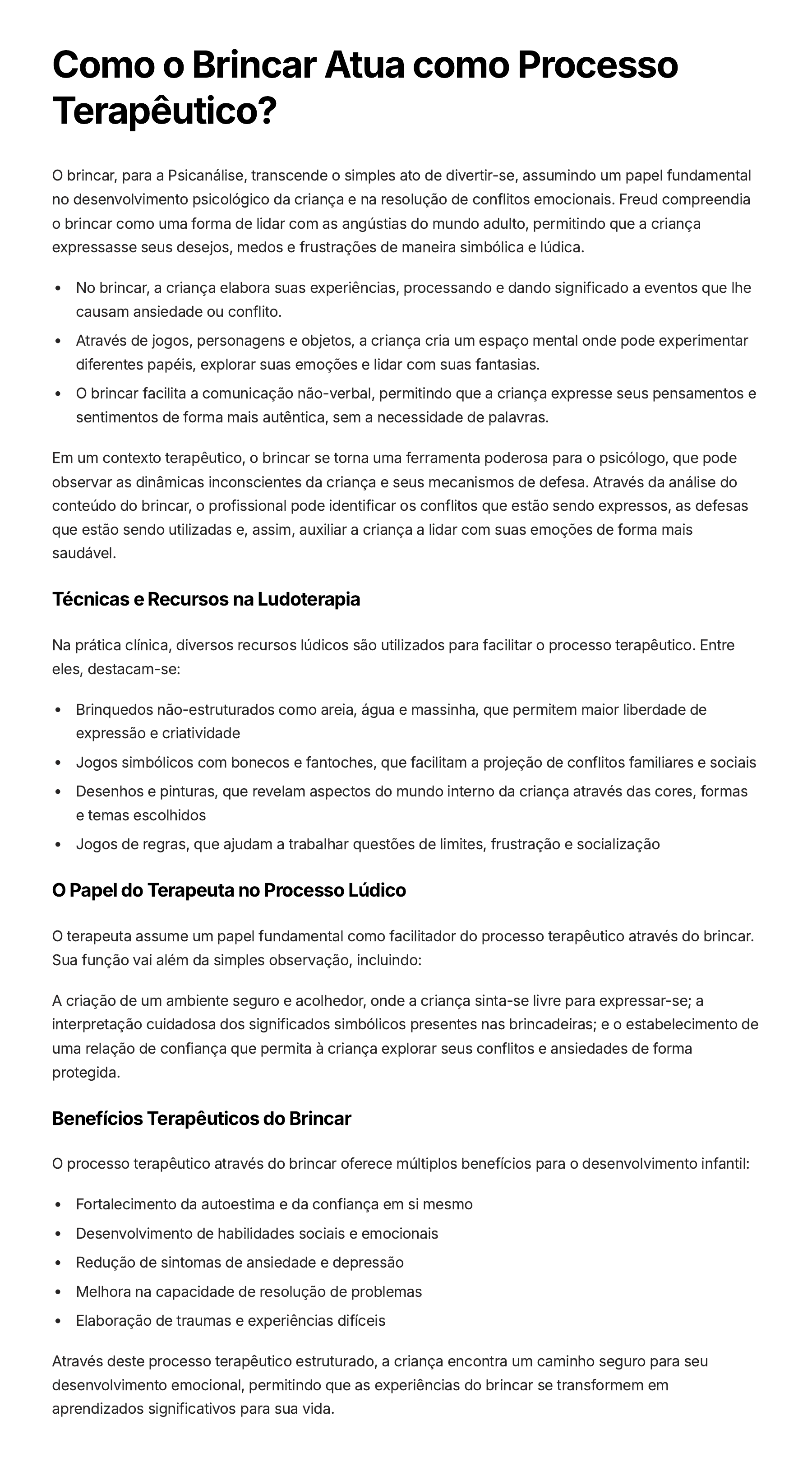 Como o Brincar Atua como Processo Terapêutico? O brincar, para a Psicanálise, transcende o simples ato de divertir-se, assumindo um papel fundamental no desenvolvimento psicológico da criança e na resolução de conflitos emocionais. Freud compreendia o brincar como uma forma de lidar com as angústias do mundo adulto, permitindo que a criança expressasse seus desejos, medos e frustrações de maneira simbólica e lúdica. No brincar, a criança elabora suas experiências, processando e dando significado a eventos que lhe causam ansiedade ou conflito. Através de jogos, personagens e objetos, a criança cria um espaço mental onde pode experimentar diferentes papéis, explorar suas emoções e lidar com suas fantasias. O brincar facilita a comunicação não-verbal, permitindo que a criança expresse seus pensamentos e sentimentos de forma mais autêntica, sem a necessidade de palavras. Em um contexto terapêutico, o brincar se torna uma ferramenta poderosa para o psicólogo, que pode observar as dinâmicas inconscientes da criança e seus mecanismos de defesa. Através da análise do conteúdo do brincar, o profissional pode identificar os conflitos que estão sendo expressos, as defesas que estão sendo utilizadas e, assim, auxiliar a criança a lidar com suas emoções de forma mais saudável. Técnicas e Recursos na Ludoterapia Na prática clínica, diversos recursos lúdicos são utilizados para facilitar o processo terapêutico. Entre eles, destacam-se: Brinquedos não-estruturados como areia, água e massinha, que permitem maior liberdade de expressão e criatividade Jogos simbólicos com bonecos e fantoches, que facilitam a projeção de conflitos familiares e sociais Desenhos e pinturas, que revelam aspectos do mundo interno da criança através das cores, formas e temas escolhidos Jogos de regras, que ajudam a trabalhar questões de limites, frustração e socialização O Papel do Terapeuta no Processo Lúdico O terapeuta assume um papel fundamental como facilitador do processo terapêutico através do brincar. Sua função vai além da simples observação, incluindo: A criação de um ambiente seguro e acolhedor, onde a criança sinta-se livre para expressar-se; a interpretação cuidadosa dos significados simbólicos presentes nas brincadeiras; e o estabelecimento de uma relação de confiança que permita à criança explorar seus conflitos e ansiedades de forma protegida. Benefícios Terapêuticos do Brincar O processo terapêutico através do brincar oferece múltiplos benefícios para o desenvolvimento infantil: Fortalecimento da autoestima e da confiança em si mesmo Desenvolvimento de habilidades sociais e emocionais Redução de sintomas de ansiedade e depressão Melhora na capacidade de resolução de problemas Elaboração de traumas e experiências difíceis Através deste processo terapêutico estruturado, a criança encontra um caminho seguro para seu desenvolvimento emocional, permitindo que as experiências do brincar se transformem em aprendizados significativos para sua vida.