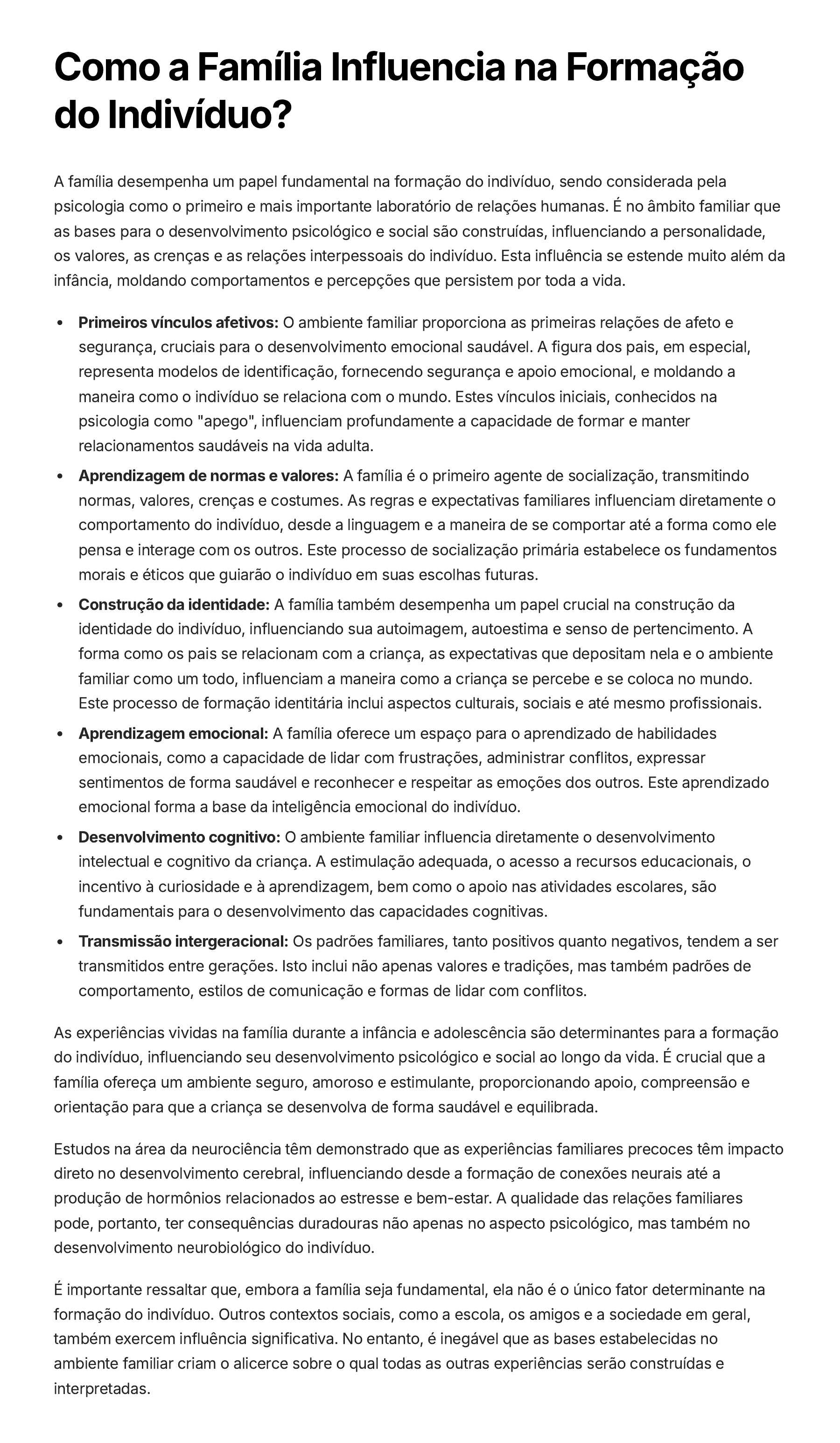Como a Família Influencia na Formação do Indivíduo? A família desempenha um papel fundamental na formação do indivíduo, sendo considerada pela psicologia como o primeiro e mais importante laboratório de relações humanas. É no âmbito familiar que as bases para o desenvolvimento psicológico e social são construídas, influenciando a personalidade, os valores, as crenças e as relações interpessoais do indivíduo. Esta influência se estende muito além da infância, moldando comportamentos e percepções que persistem por toda a vida. Primeiros vínculos afetivos: O ambiente familiar proporciona as primeiras relações de afeto e segurança, cruciais para o desenvolvimento emocional saudável. A figura dos pais, em especial, representa modelos de identificação, fornecendo segurança e apoio emocional, e moldando a maneira como o indivíduo se relaciona com o mundo. Estes vínculos iniciais, conhecidos na psicologia como "apego", influenciam profundamente a capacidade de formar e manter relacionamentos saudáveis na vida adulta. Aprendizagem de normas e valores: A família é o primeiro agente de socialização, transmitindo normas, valores, crenças e costumes. As regras e expectativas familiares influenciam diretamente o comportamento do indivíduo, desde a linguagem e a maneira de se comportar até a forma como ele pensa e interage com os outros. Este processo de socialização primária estabelece os fundamentos morais e éticos que guiarão o indivíduo em suas escolhas futuras. Construção da identidade: A família também desempenha um papel crucial na construção da identidade do indivíduo, influenciando sua autoimagem, autoestima e senso de pertencimento. A forma como os pais se relacionam com a criança, as expectativas que depositam nela e o ambiente familiar como um todo, influenciam a maneira como a criança se percebe e se coloca no mundo. Este processo de formação identitária inclui aspectos culturais, sociais e até mesmo profissionais. Aprendizagem emocional: A família oferece um espaço para o aprendizado de habilidades emocionais, como a capacidade de lidar com frustrações, administrar conflitos, expressar sentimentos de forma saudável e reconhecer e respeitar as emoções dos outros. Este aprendizado emocional forma a base da inteligência emocional do indivíduo. Desenvolvimento cognitivo: O ambiente familiar influencia diretamente o desenvolvimento intelectual e cognitivo da criança. A estimulação adequada, o acesso a recursos educacionais, o incentivo à curiosidade e à aprendizagem, bem como o apoio nas atividades escolares, são fundamentais para o desenvolvimento das capacidades cognitivas. Transmissão intergeracional: Os padrões familiares, tanto positivos quanto negativos, tendem a ser transmitidos entre gerações. Isto inclui não apenas valores e tradições, mas também padrões de comportamento, estilos de comunicação e formas de lidar com conflitos. As experiências vividas na família durante a infância e adolescência são determinantes para a formação do indivíduo, influenciando seu desenvolvimento psicológico e social ao longo da vida. É crucial que a família ofereça um ambiente seguro, amoroso e estimulante, proporcionando apoio, compreensão e orientação para que a criança se desenvolva de forma saudável e equilibrada. Estudos na área da neurociência têm demonstrado que as experiências familiares precoces têm impacto direto no desenvolvimento cerebral, influenciando desde a formação de conexões neurais até a produção de hormônios relacionados ao estresse e bem-estar. A qualidade das relações familiares pode, portanto, ter consequências duradouras não apenas no aspecto psicológico, mas também no desenvolvimento neurobiológico do indivíduo. É importante ressaltar que, embora a família seja fundamental, ela não é o único fator determinante na formação do indivíduo. Outros contextos sociais, como a escola, os amigos e a sociedade em geral, também exercem influência significativa. No entanto, é inegável que as bases estabelecidas no ambiente familiar criam o alicerce sobre o qual todas as outras experiências serão construídas e interpretadas.