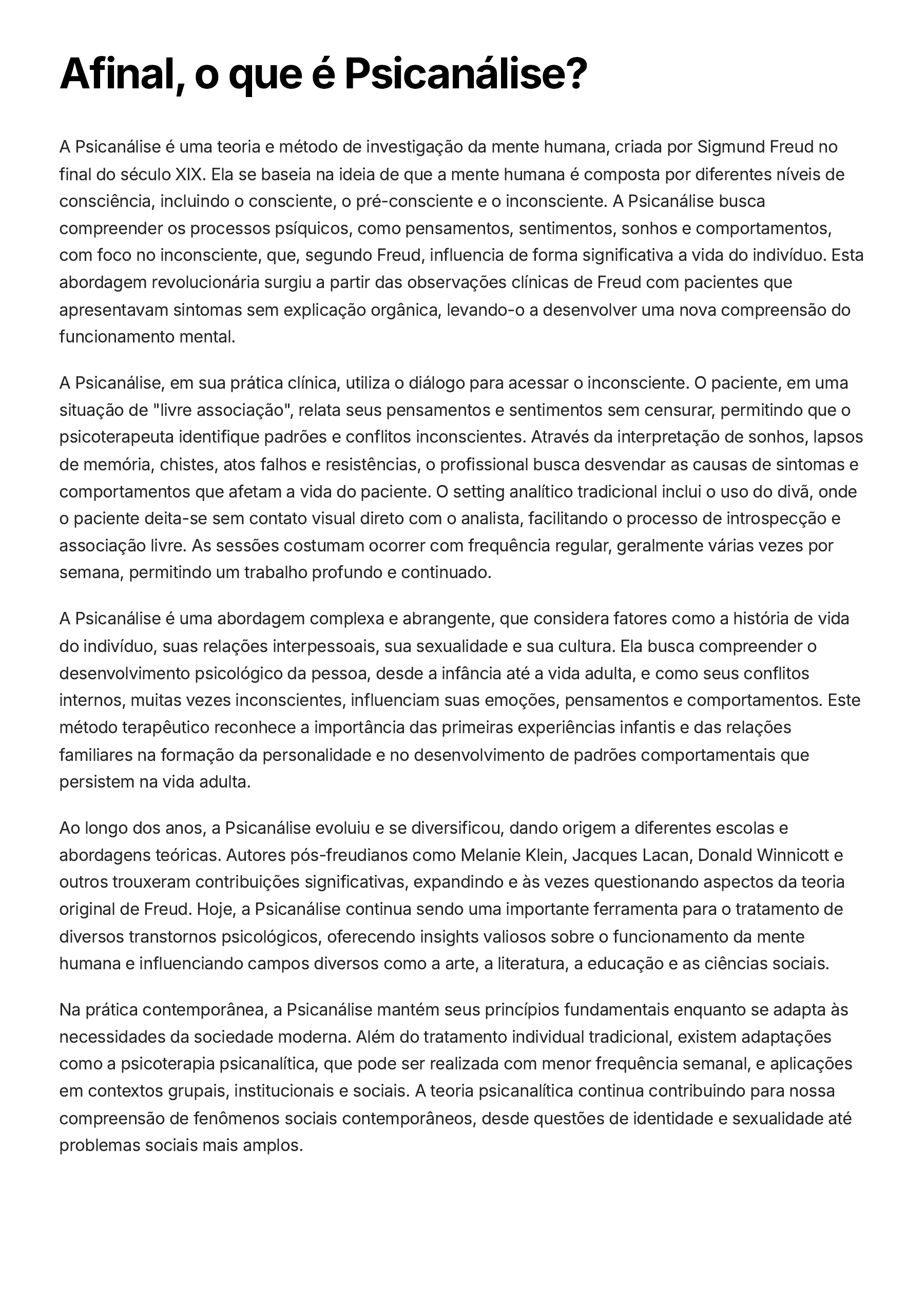 Afinal, o que é Psicanálise? A Psicanálise é uma teoria e método de investigação da mente humana, criada por Sigmund Freud no final do século XIX. Ela se baseia na ideia de que a mente humana é composta por diferentes níveis de consciência, incluindo o consciente, o pré-consciente e o inconsciente. A Psicanálise busca compreender os processos psíquicos, como pensamentos, sentimentos, sonhos e comportamentos, com foco no inconsciente, que, segundo Freud, influencia de forma significativa a vida do indivíduo. Esta abordagem revolucionária surgiu a partir das observações clínicas de Freud com pacientes que apresentavam sintomas sem explicação orgânica, levando-o a desenvolver uma nova compreensão do funcionamento mental. A Psicanálise, em sua prática clínica, utiliza o diálogo para acessar o inconsciente. O paciente, em uma situação de "livre associação", relata seus pensamentos e sentimentos sem censurar, permitindo que o psicoterapeuta identifique padrões e conflitos inconscientes. Através da interpretação de sonhos, lapsos de memória, chistes, atos falhos e resistências, o profissional busca desvendar as causas de sintomas e comportamentos que afetam a vida do paciente. O setting analítico tradicional inclui o uso do divã, onde o paciente deita-se sem contato visual direto com o analista, facilitando o processo de introspecção e associação livre. As sessões costumam ocorrer com frequência regular, geralmente várias vezes por semana, permitindo um trabalho profundo e continuado. A Psicanálise é uma abordagem complexa e abrangente, que considera fatores como a história de vida do indivíduo, suas relações interpessoais, sua sexualidade e sua cultura. Ela busca compreender o desenvolvimento psicológico da pessoa, desde a infância até a vida adulta, e como seus conflitos internos, muitas vezes inconscientes, influenciam suas emoções, pensamentos e comportamentos. Este método terapêutico reconhece a importância das primeiras experiências infantis e das relações familiares na formação da personalidade e no desenvolvimento de padrões comportamentais que persistem na vida adulta. Ao longo dos anos, a Psicanálise evoluiu e se diversificou, dando origem a diferentes escolas e abordagens teóricas. Autores pós-freudianos como Melanie Klein, Jacques Lacan, Donald Winnicott e outros trouxeram contribuições significativas, expandindo e às vezes questionando aspectos da teoria original de Freud. Hoje, a Psicanálise continua sendo uma importante ferramenta para o tratamento de diversos transtornos psicológicos, oferecendo insights valiosos sobre o funcionamento da mente humana e influenciando campos diversos como a arte, a literatura, a educação e as ciências sociais. Na prática contemporânea, a Psicanálise mantém seus princípios fundamentais enquanto se adapta às necessidades da sociedade moderna. Além do tratamento individual tradicional, existem adaptações como a psicoterapia psicanalítica, que pode ser realizada com menor frequência semanal, e aplicações em contextos grupais, institucionais e sociais. A teoria psicanalítica continua contribuindo para nossa compreensão de fenômenos sociais contemporâneos, desde questões de identidade e sexualidade até problemas sociais mais amplos.