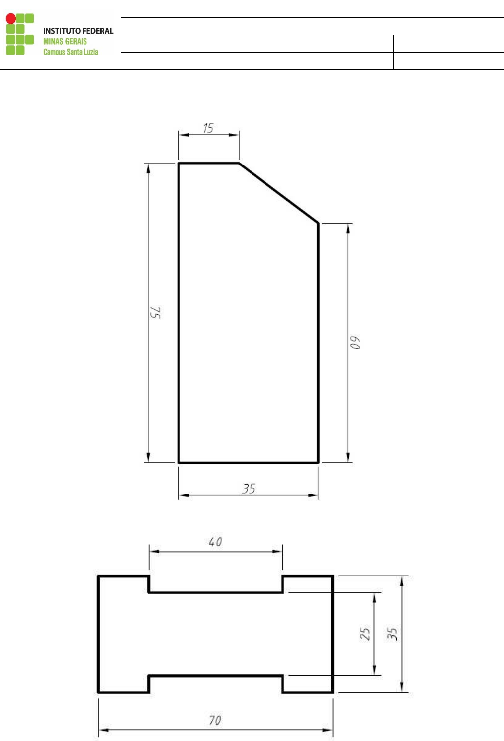 1. Desenhe as peças abaixo (não é necessário colocar as cotas); As peças podem ser feitas no mesmo arquivo; Comandos a utilizar: Line, Object Snap e Ortho (ver ícones no rodapé da janela). Lista 01 Aluno (a): Disciplina: Desenho arquitetônico computacional Data: Valor: 10,0 pontos Nota: 2. Desenhe as 3 vistas (frontal, superior e lateral esquerda) das peças abaixo; Não é necessário colocar as cotas; As vistas devem estar alinhadas; Comandos a utilizar (além dos já vistos): Offset e Trim. 3. Desenhe uma folha A4 (210x297) e crie a legenda abaixo; Não é necessário colocar as cotas; Você pode preencher o campo “Nome:” com seu nome no lugar dos traços (- - -); Dica: após adicionar um texto e escolher um tamanho adequado use Ctrl+C e Ctrl+V Comandos a utilizar (além dos já vistos): Circle e Text. 4. Desenhe uma folha A3 (297x420 Paisagem) e insira/copie o formato feito; Dica: use um ponto de referência quando for copiar a legenda; Comandos a utilizar (além dos já vistos): Copy.