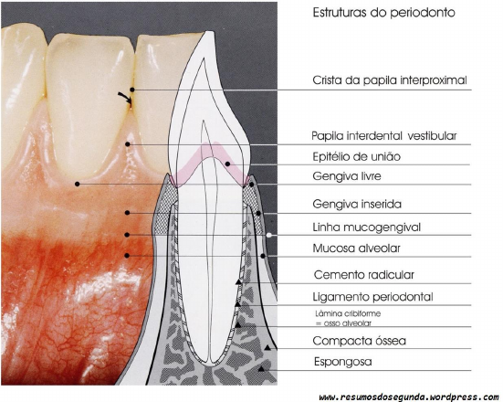 RESUMOS P/ PERIODONTIA ANATOMIA DO LIGAMENTO PERIODONTAL A função do periodonto (tecidos de suporte dos dentes) é inserir o dente no tecido ósseo da mandíbula e da maxila e manter a integridade da superfície da mucosa mastigatória da cavidade oral. A mucosa oral é dividida em três zonas: - Mucosa mastigatória, formada pela gengiva e pelo revestimento do palato duro. - Mucosa especializada, que reveste o dorso da língua. - Mucosa de revestimento, formada pela parte restante da cavidade oral. O periodonto é dividido em duas partes principais: - Periodonto de proteção, formado pela gengiva livre e gengiva inserida. - Periodonto de sustentação, formado pelo osso alveolar, ligamento periodontal e cemento radicular. - Pontos importantes para o exame clínico periodontal: PERIODONTO DE PROTEÇÃO Gengiva: É componente da mucosa mastigatória e cobre parte do processo alveolar, circundando a parte cervical (gengival) dos dentes, limitando-se da mucosa alveolar (linha mucogengival) até a margem da gengiva livre. É subdividida em gengiva livra (ou marginal) e gengiva inserida (ou ceratinizada). Gengiva livre: Apresenta consistência firme, superfície opaca e coloração rósea. A ranhura gengival livre está presente em apenas 30-40% dos adultos. Ela é demarcada da gengiva inserida adjacente pelo sulco gengival livre, que mede aproximadamente 1mm de largura. Sulco gengival: Espaço raso que possui forma V, delimitado pela superfície dental de um lado e o epitélio de revestimento da gengiva marginal livre no outro. A sua profundidade é determinada pela introdução da sonda periodontal e a estimativa da distância que ela penetra. A profundidade de sondagem de um sulco gengival clínico normal em humanos é de 2 a 3mm. Gengiva inserida: Apresenta textura firme, coloração rósea e um pontilhado delicado, lembrando aspecto de casca de laranja. Ela é contínua com a gengiva marginal, sua largura geralmente é maior na região dos incisivos (3,5 a 4,5mm na maxila e 3,3 a 3,9mm na mandíbula) e mais estreita nos segmentos posteriores (1,9mm na maxila e 1,8mm nos primeiros pré-molares inferiores). Gengiva interdental. Epitélio gengival: Consiste em um revestimento contínuo de epitélio estratificado e é dividido em três áreas: Epitélio oral, epitélio sulcular oral e epitélio juncional. Suas células desempenham papel ativo na defesa inata do hospedeiro por responder às bactérias de maneira interativa, e acabam participando ativada na resposta à infecção, na sinalização de outras reações do hospedeiro e na integração das respostas imunes inata e adquirida. Função: proteger as estruturas profundas, enquanto permite o intercâmbio seletivo com o meio ambiente ora.; barreira mecânica, química, microbiana, contra água e funções de sinalização. Principais tipos celulares: Queratinócitos (produção de ceratina) e 10% de células claras, sendo os: melanócitos (sintetizam pigmentos), células de Langerhans (defesa da mucosa oral), células de Merkel (função sensorial) e células inflamatórias (neutrófilos, linfócitos e plasmócitos). Tecido conjuntivo: Seus principais componentes: - Fibras colágenas: compõem cerca de 60% do volume do TC. - Fibroblastos: compões cerca de 5%. - Vasos e nervos: compõem cerca de 35%, que estão integrados a uma substância fundamental amorfa (matriz). O tecido conjuntivo da gengiva é conhecido como LÂMINA PRÓPRIA. Possui uma camada papilar (subjacente ao epitélio) que consiste em projeções papilares entre as cristas epiteliais, e uma camada reticular contínua com o periósteo do osso alveolar. Principais tipos celulares: fibroblastos, mastócitos e macrófagos (protegem o tecido contra alguma invasão bacteriana), e células inflamatórias (neutrófilos, linfócitos e plasmócitos). Fibras gengivais: Sistema proeminente de feixes de fibras colágenas do tecido conjuntivo. Funções: unir firmemente a gengiva marginal contra o dente, promover rigidez necessária para resistir às forças da mastigação sem serem defletidas da superfície dental e unir a gengiva marginal livre ao cemento radicular e à gengiva inserida adjacente. São organizadas em três grupos: gengivodental, circular e transseptal. - Fibras gengivodentais: PERIODONTO DE SUSTENTAÇÃO Mucosa alveolar: Não é ceratinizada, possui coloração mais avermelhada devido a proximidade dos vasos sanguíneos com a superfície. É frouxa em relaxação a gengiva e mais sensível. Ligamento periodontal: É o tecido conjuntivo frouxo, ricamente vascularizado e celular. Este circunda as raízes dos dentes e une o cemento radicular ao osso alveolar propriamente dito. Funções: ancoragem dos dentes, distribuição e absorção da força produzidas pela mastigação para o osso alveolar e mobilidade dentária Principais tipos celulares: Fibroblastos (renovação do colágeno), osteoblastos (revestem a superfície óssea), osteoclastos (associados com a reabsorção do osso), cementoblastos (revestem a superfície do cemento), fibras nervosas e células epiteliais. Pode ser visto radiograficamente e quando há um espessamento do LP (visível na radiografia) significa inflamação periodontal ou excesso de força oclusal. Fibras da crista alveolar: Unem o cemento, abaixo da junção cemento-esmalte, dirige-se para baixo, inserindo- se na crista alveolar. Funções: retenção do dente no alvéolo, oposição de forças laterais e proteção das estruturas profundas do ligamento. - Fibras horizontais: se ligam ao cemento em um ângulo reto abaixo da crista óssea e sua função é fazer a contenção do movimento lateral dos dentes. - Fibras oblíquas: representam a maior parte dos grupos de fibras do LP e partem obliquamente do cemento até o osso alveolar. Sua função é dar resistência às forças axiais diretas. - Fibras apicais: ficam em direção a parte apical do cemento e sua função é dar resistência às forças de luxação e proteção do feix