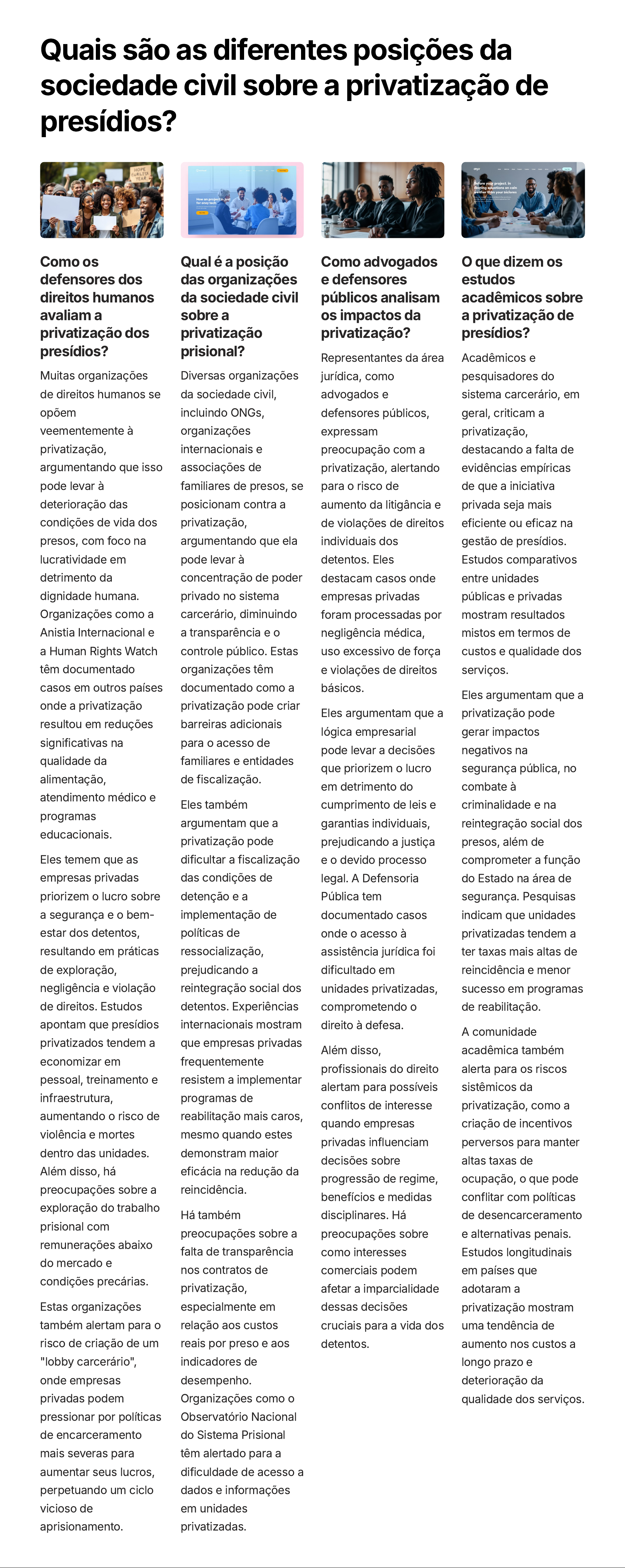 Quais são as diferentes posições da sociedade civil sobre a privatização de presídios? Como os defensores dos direitos humanos avaliam a privatização dos presídios? Muitas organizações de direitos humanos se opõem veementemente à privatização, argumentando que isso pode levar à deterioração das condições de vida dos presos, com foco na lucratividade em detrimento da dignidade humana. Organizações como a Anistia Internacional e a Human Rights Watch têm documentado casos em outros países onde a privatização resultou em reduções significativas na qualidade da alimentação, atendimento médico e programas educacionais. Eles temem que as empresas privadas priorizem o lucro sobre a segurança e o bem- estar dos detentos, resultando em práticas de exploração, negligência e violação de direitos. Estudos apontam que presídios privatizados tendem a economizar em pessoal, treinamento e infraestrutura, aumentando o risco de violência e mortes dentro das unidades. Além disso, há preocupações sobre a exploração do trabalho prisional com remunerações abaixo do mercado e condições precárias. Estas organizações também alertam para o risco de criação de um "lobby carcerário", onde empresas privadas podem pressionar por políticas de encarceramento mais severas para aumentar seus lucros, perpetuando um ciclo vicioso de aprisionamento. Qual é a posição das organizações da sociedade civil sobre a privatização prisional? Diversas organizações da sociedade civil, incluindo ONGs, organizações internacionais e associações de familiares de presos, se posicionam contra a privatização, argumentando que ela pode levar à concentração de poder privado no sistema carcerário, diminuindo a transparência e o controle público. Estas organizações têm documentado como a privatização pode criar barreiras adicionais para o acesso de familiares e entidades de fiscalização. Eles também argumentam que a privatização pode dificultar a fiscalização das condições de detenção e a implementação de políticas de ressocialização, prejudicando a reintegração social dos detentos. Experiências internacionais mostram que empresas privadas frequentemente resistem a implementar programas de reabilitação mais caros, mesmo quando estes demonstram maior eficácia na redução da reincidência. Há também preocupações sobre a falta de transparência nos contratos de privatização, especialmente em relação aos custos reais por preso e aos indicadores de desempenho. Organizações como o Observatório Nacional do Sistema Prisional têm alertado para a dificuldade de acesso a dados e informações em unidades privatizadas. Como advogados e defensores públicos analisam os impactos da privatização? Representantes da área jurídica, como advogados e defensores públicos, expressam preocupação com a privatização, alertando para o risco de aumento da litigância e de violações de direitos individuais dos detentos. Eles destacam casos onde empresas privadas foram processadas por negligência médica, uso excessivo de força e violações de direitos básicos. Eles argumentam que a lógica empresarial pode levar a decisões que priorizem o lucro em detrimento do cumprimento de leis e garantias individuais, prejudicando a justiça e o devido processo legal. A Defensoria Pública tem documentado casos onde o acesso à assistência jurídica foi dificultado em unidades privatizadas, comprometendo o direito à defesa. Além disso, profissionais do direito alertam para possíveis conflitos de interesse quando empresas privadas influenciam decisões sobre progressão de regime, benefícios e medidas disciplinares. Há preocupações sobre como interesses comerciais podem afetar a imparcialidade dessas decisões cruciais para a vida dos detentos. O que dizem os estudos acadêmicos sobre a privatização de presídios? Acadêmicos e pesquisadores do sistema carcerário, em geral, criticam a privatização, destacando a falta de evidências empíricas de que a iniciativa privada seja mais eficiente ou eficaz na gestão de presídios. Estudos comparativos entre unidades públicas e privadas mostram resultados mistos em termos de custos e qualidade dos serviços. Eles argumentam que a privatização pode gerar impactos negativos na segurança pública, no combate à criminalidade e na reintegração social dos presos, além de comprometer a função do Estado na área de segurança. Pesquisas indicam que unidades privatizadas tendem a ter taxas mais altas de reincidência e menor sucesso em programas de reabilitação. A comunidade acadêmica também alerta para os riscos sistêmicos da privatização, como a criação de incentivos perversos para manter altas taxas de ocupação, o que pode conflitar com políticas de desencarceramento e alternativas penais. Estudos longitudinais em países que adotaram a privatização mostram uma tendência de aumento nos custos a longo prazo e deterioração da qualidade dos serviços.