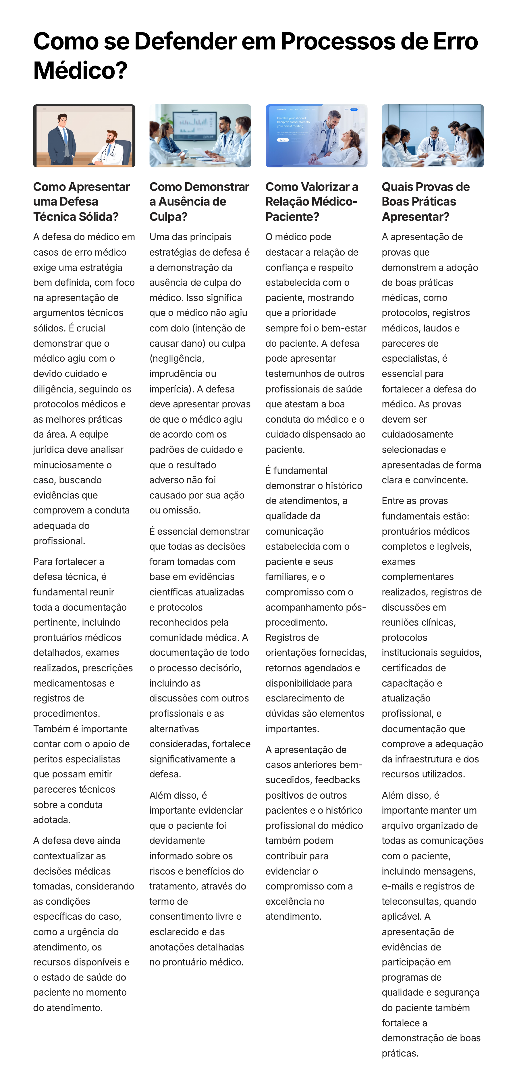 Como se Defender em Processos de Erro Médico? Como Apresentar uma Defesa Técnica Sólida? A defesa do médico em casos de erro médico exige uma estratégia bem definida, com foco na apresentação de argumentos técnicos sólidos. É crucial demonstrar que o médico agiu com o devido cuidado e diligência, seguindo os protocolos médicos e as melhores práticas da área. A equipe jurídica deve analisar minuciosamente o caso, buscando evidências que comprovem a conduta adequada do profissional. Para fortalecer a defesa técnica, é fundamental reunir toda a documentação pertinente, incluindo prontuários médicos detalhados, exames realizados, prescrições medicamentosas e registros de procedimentos. Também é importante contar com o apoio de peritos especialistas que possam emitir pareceres técnicos sobre a conduta adotada. A defesa deve ainda contextualizar as decisões médicas tomadas, considerando as condições específicas do caso, como a urgência do atendimento, os recursos disponíveis e o estado de saúde do paciente no momento do atendimento. Como Demonstrar a Ausência de Culpa? Uma das principais estratégias de defesa é a demonstração da ausência de culpa do médico. Isso significa que o médico não agiu com dolo (intenção de causar dano) ou culpa (negligência, imprudência ou imperícia). A defesa deve apresentar provas de que o médico agiu de acordo com os padrões de cuidado e que o resultado adverso não foi causado por sua ação ou omissão. É essencial demonstrar que todas as decisões foram tomadas com base em evidências científicas atualizadas e protocolos reconhecidos pela comunidade médica. A documentação de todo o processo decisório, incluindo as discussões com outros profissionais e as alternativas consideradas, fortalece significativamente a defesa. Além disso, é importante evidenciar que o paciente foi devidamente informado sobre os riscos e benefícios do tratamento, através do termo de consentimento livre e esclarecido e das anotações detalhadas no prontuário médico. Como Valorizar a Relação Médico- Paciente? O médico pode destacar a relação de confiança e respeito estabelecida com o paciente, mostrando que a prioridade sempre foi o bem-estar do paciente. A defesa pode apresentar testemunhos de outros profissionais de saúde que atestam a boa conduta do médico e o cuidado dispensado ao paciente. É fundamental demonstrar o histórico de atendimentos, a qualidade da comunicação estabelecida com o paciente e seus familiares, e o compromisso com o acompanhamento pós- procedimento. Registros de orientações fornecidas, retornos agendados e disponibilidade para esclarecimento de dúvidas são elementos importantes. A apresentação de casos anteriores bem- sucedidos, feedbacks positivos de outros pacientes e o histórico profissional do médico também podem contribuir para evidenciar o compromisso com a excelência no atendimento. Quais Provas de Boas Práticas Apresentar? A apresentação de provas que demonstrem a adoção de boas práticas médicas, como protocolos, registros médicos, laudos e pareceres de especialistas, é essencial para fortalecer a defesa do médico. As provas devem ser cuidadosamente selecionadas e apresentadas de forma clara e convincente. Entre as provas fundamentais estão: prontuários médicos completos e legíveis, exames complementares realizados, registros de discussões em reuniões clínicas, protocolos institucionais seguidos, certificados de capacitação e atualização profissional, e documentação que comprove a adequação da infraestrutura e dos recursos utilizados. Além disso, é importante manter um arquivo organizado de todas as comunicações com o paciente, incluindo mensagens, e-mails e registros de teleconsultas, quando aplicável. A apresentação de evidências de participação em programas de qualidade e segurança do paciente também fortalece a demonstração de boas práticas.