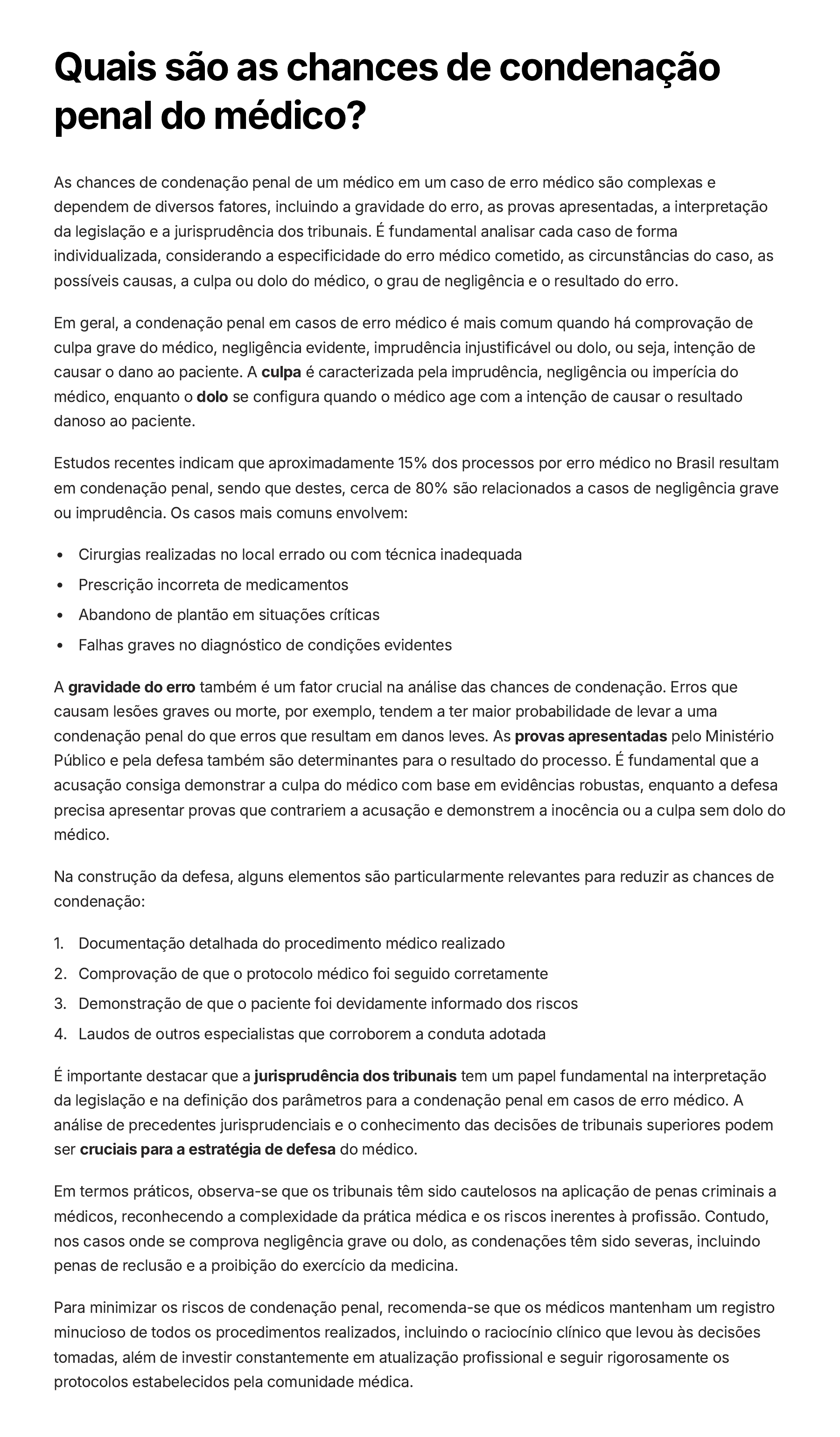 Quais são as chances de condenação penal do médico? As chances de condenação penal de um médico em um caso de erro médico são complexas e dependem de diversos fatores, incluindo a gravidade do erro, as provas apresentadas, a interpretação da legislação e a jurisprudência dos tribunais. É fundamental analisar cada caso de forma individualizada, considerando a especificidade do erro médico cometido, as circunstâncias do caso, as possíveis causas, a culpa ou dolo do médico, o grau de negligência e o resultado do erro. Em geral, a condenação penal em casos de erro médico é mais comum quando há comprovação de culpa grave do médico, negligência evidente, imprudência injustificável ou dolo, ou seja, intenção de causar o dano ao paciente. A culpa é caracterizada pela imprudência, negligência ou imperícia do médico, enquanto o dolo se configura quando o médico age com a intenção de causar o resultado danoso ao paciente. Estudos recentes indicam que aproximadamente 15% dos processos por erro médico no Brasil resultam em condenação penal, sendo que destes, cerca de 80% são relacionados a casos de negligência grave ou imprudência. Os casos mais comuns envolvem: Cirurgias realizadas no local errado ou com técnica inadequada Prescrição incorreta de medicamentos Abandono de plantão em situações críticas Falhas graves no diagnóstico de condições evidentes A gravidade do erro também é um fator crucial na análise das chances de condenação. Erros que causam lesões graves ou morte, por exemplo, tendem a ter maior probabilidade de levar a uma condenação penal do que erros que resultam em danos leves. As provas apresentadas pelo Ministério Público e pela defesa também são determinantes para o resultado do processo. É fundamental que a acusação consiga demonstrar a culpa do médico com base em evidências robustas, enquanto a defesa precisa apresentar provas que contrariem a acusação e demonstrem a inocência ou a culpa sem dolo do médico. Na construção da defesa, alguns elementos são particularmente relevantes para reduzir as chances de condenação: Documentação detalhada do procedimento médico realizado1. Comprovação de que o protocolo médico foi seguido corretamente2. Demonstração de que o paciente foi devidamente informado dos riscos3. Laudos de outros especialistas que corroborem a conduta adotada4. É importante destacar que a jurisprudência dos tribunais tem um papel fundamental na interpretação da legislação e na definição dos parâmetros para a condenação penal em casos de erro médico. A análise de precedentes jurisprudenciais e o conhecimento das decisões de tribunais superiores podem ser cruciais para a estratégia de defesa do médico. Em termos práticos, observa-se que os tribunais têm sido cautelosos na aplicação de penas criminais a médicos, reconhecendo a complexidade da prática médica e os riscos inerentes à profissão. Contudo, nos casos onde se comprova negligência grave ou dolo, as condenações têm sido severas, incluindo penas de reclusão e a proibição do exercício da medicina. Para minimizar os riscos de condenação penal, recomenda-se que os médicos mantenham um registro minucioso de todos os procedimentos realizados, incluindo o raciocínio clínico que levou às decisões tomadas, além de investir constantemente em atualização profissional e seguir rigorosamente os protocolos estabelecidos pela comunidade médica.