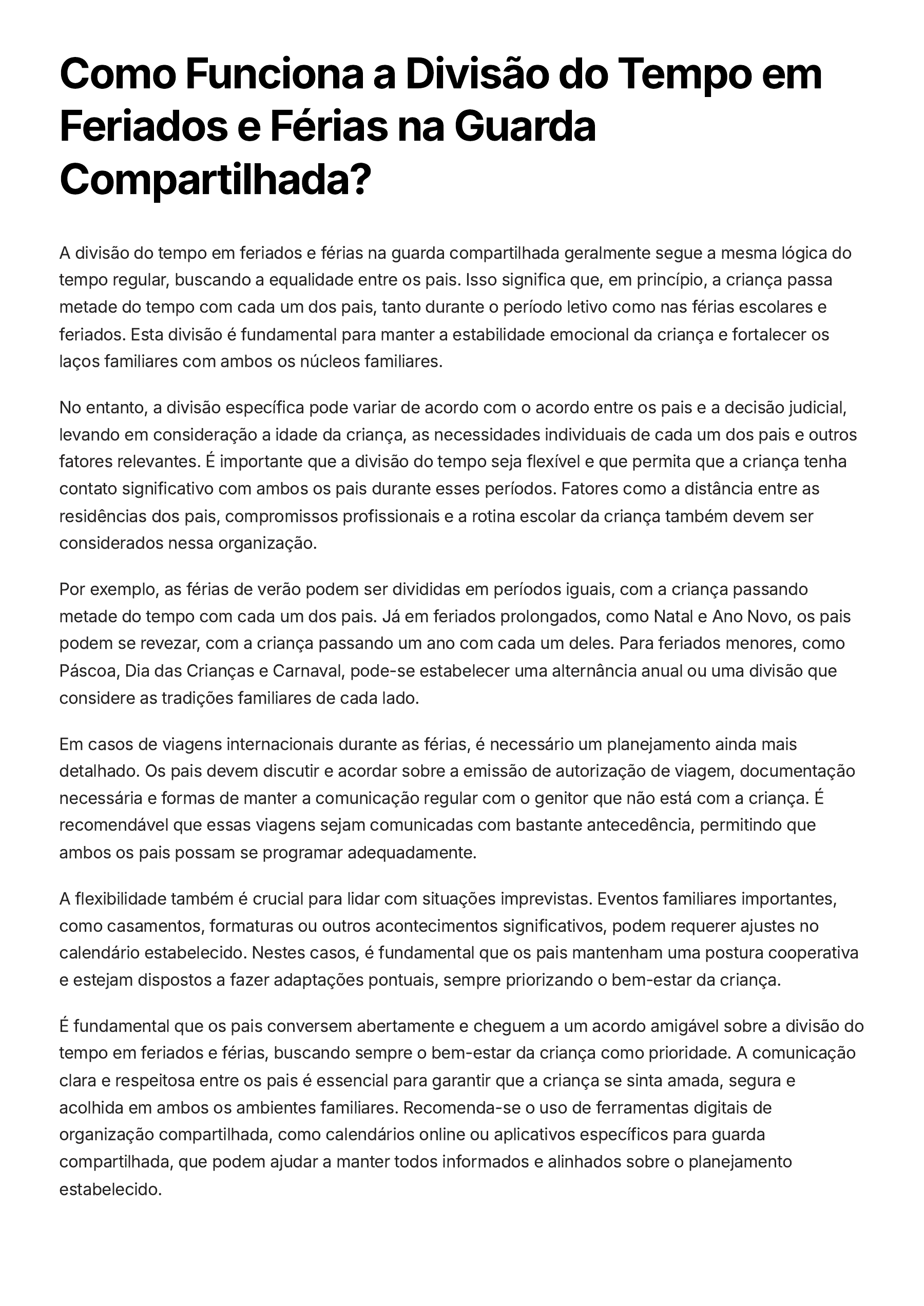 Como Funciona a Divisão do Tempo em Feriados e Férias na Guarda Compartilhada? A divisão do tempo em feriados e férias na guarda compartilhada geralmente segue a mesma lógica do tempo regular, buscando a equalidade entre os pais. Isso significa que, em princípio, a criança passa metade do tempo com cada um dos pais, tanto durante o período letivo como nas férias escolares e feriados. Esta divisão é fundamental para manter a estabilidade emocional da criança e fortalecer os laços familiares com ambos os núcleos familiares. No entanto, a divisão específica pode variar de acordo com o acordo entre os pais e a decisão judicial, levando em consideração a idade da criança, as necessidades individuais de cada um dos pais e outros fatores relevantes. É importante que a divisão do tempo seja flexível e que permita que a criança tenha contato significativo com ambos os pais durante esses períodos. Fatores como a distância entre as residências dos pais, compromissos profissionais e a rotina escolar da criança também devem ser considerados nessa organização. Por exemplo, as férias de verão podem ser divididas em períodos iguais, com a criança passando metade do tempo com cada um dos pais. Já em feriados prolongados, como Natal e Ano Novo, os pais podem se revezar, com a criança passando um ano com cada um deles. Para feriados menores, como Páscoa, Dia das Crianças e Carnaval, pode-se estabelecer uma alternância anual ou uma divisão que considere as tradições familiares de cada lado. Em casos de viagens internacionais durante as férias, é necessário um planejamento ainda mais detalhado. Os pais devem discutir e acordar sobre a emissão de autorização de viagem, documentação necessária e formas de manter a comunicação regular com o genitor que não está com a criança. É recomendável que essas viagens sejam comunicadas com bastante antecedência, permitindo que ambos os pais possam se programar adequadamente. A flexibilidade também é crucial para lidar com situações imprevistas. Eventos familiares importantes, como casamentos, formaturas ou outros acontecimentos significativos, podem requerer ajustes no calendário estabelecido. Nestes casos, é fundamental que os pais mantenham uma postura cooperativa e estejam dispostos a fazer adaptações pontuais, sempre priorizando o bem-estar da criança. É fundamental que os pais conversem abertamente e cheguem a um acordo amigável sobre a divisão do tempo em feriados e férias, buscando sempre o bem-estar da criança como prioridade. A comunicação clara e respeitosa entre os pais é essencial para garantir que a criança se sinta amada, segura e acolhida em ambos os ambientes familiares. Recomenda-se o uso de ferramentas digitais de organização compartilhada, como calendários online ou aplicativos específicos para guarda compartilhada, que podem ajudar a manter todos informados e alinhados sobre o planejamento estabelecido.